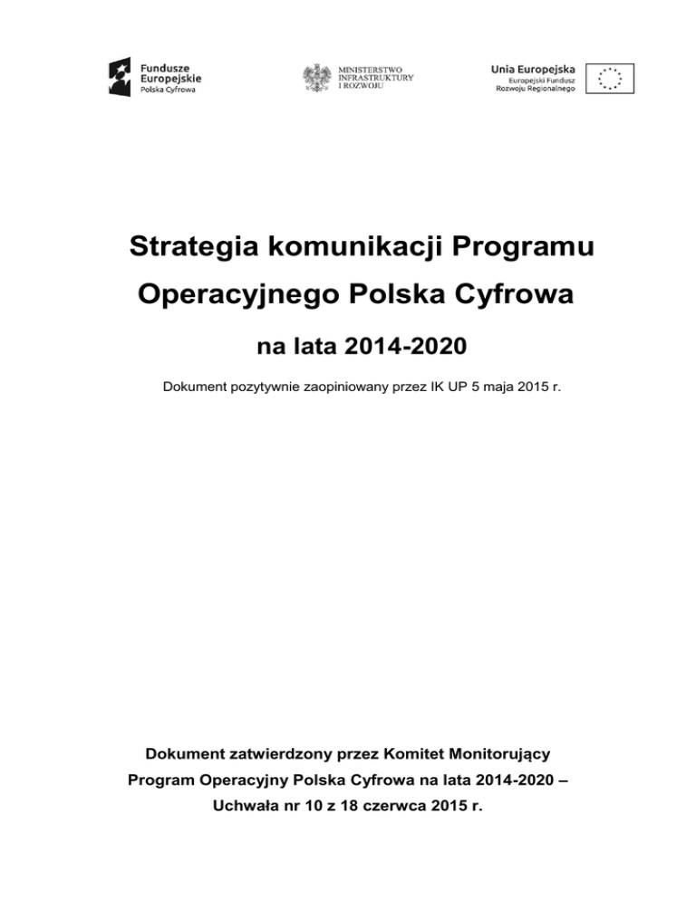 Strategia komunikacji Programu Operacyjnego Polska Cyfrowa na lata 2014-2020 Dokument pozytywnie zaopiniowany przez IK UP 5 maja 2015 r. Dokument zatwierdzony przez Komitet Monitorujący Program Operacyjny Polska Cyfrowa na lata 2014-2020 – Uchwała nr 10 z 18 czerwca 2015 r. WSTĘP ................................................................................................................................................... 4 1. OKREŚLENIE SYTUACJI WYJŚCIOWEJ ..................................................................................... 4 1.1 Diagnoza ..................................................................................................................................... 4 1.2 Podstawy prawne: ..................................................................................................................... 6 1.3 Opis prac nad dokumentem ..................................................................................................... 6 1.4 Instytucja odpowiedzialna za opracowanie i wdrożenie strategii komunikacji programu 6 2. CEL GŁÓWNY I CELE SZCZEGÓŁOWE KOMUNIKACJI PROGRAMU ..................................... 7 3. GŁÓWNY KOMUNIKAT ................................................................................................................. 7 4. STOSOWANIE GŁÓWNEGO KOMUNIKATU PROGRAMU W DZIAŁANIACH INFORMACYJNO-PROMOCYJNYCH ................................................................................................... 7 4.1 Komunikaty uzupełniające ....................................................................................................... 8 4.2 Perspektywy prezentacji korzyści oraz styl komunikacji ...................................................... 8 5. GRUPY DOCELOWE I SPOSOBY KOMUNIKACJI Z NIMI .......................................................... 9 5.1 Segmenty grup docelowych ..................................................................................................... 9 5.2 Grupy docelowe programu ....................................................................................................... 9 5.3 Mechanizm komunikacji ......................................................................................................... 10 5.4 Zapewnienie szerokiego, wielokanałowego i użytecznego dostępu do informacji i pomocy ................................................................................................................................................. 10 5.4.1 Opis systemu wsparcia potencjalnych beneficjentów ........................................................... 13 5.4.2 Opis systemu wsparcia beneficjentów .................................................................................. 13 5.5 Podstawowe kanały informacji .............................................................................................. 14 5.5.1 Komunikacja z osobami z różnymi niepełnosprawnościami ................................................. 14 6. KOORDYNACJA KOMUNIKACJI FUNDUSZY EUROPEJSKICH.............................................. 15 6.1 Współpraca przy działaniach komunikacyjnych obejmujących wszystkie fundusze uwzględnione w Umowie Partnerstwa .............................................................................................. 15 6.2 Komunikacja wewnętrzna między instytucjami wdrażającymi dany program .................. 16 6.3 Zasady prowadzenia działań informacyjno-promocyjnych ................................................ 16 7. REALIZACJA DZIAŁAŃ INFORMACYJNO-PROMOCYJNYCH W PARTNERSTWIE .............. 17 7.1 Wspieranie potencjalnych beneficjentów i beneficjentów w działaniach informacyjnopromocyjnych ...................................................................................................................................... 17 7.2 Współpraca z partnerami ........................................................................................................ 19 7.3 Komunikacja z mediami .......................................................................................................... 19 7.4 8. Komunikacja z liderami opinii ................................................................................................ 20 OCENA EFEKTÓW STRATEGII .................................................................................................. 20 8.1 Ocena realizacji celów Strategii ............................................................................................. 20 8.2 Ocena bieżąca działań informacyjnych i promocyjnych ..................................................... 28 8.3 Monitoring działań informacyjnych i promocyjnych ........................................................... 29 8.4 Sprawozdawczość ................................................................................................................... 29 9. RAMOWY HARMONOGRAM ....................................................................................................... 29 10. ROCZNA AKTUALIZACJA DZIAŁAŃ ..................................................................................... 31 11. WIZUALIZACJA ........................................................................................................................ 31 12. SZACUNKOWY BUDŻET NA REALIZACJĘ STRATEGII ...................................................... 31 13. WYKAZ SKRÓTÓW, SPIS ILUSTRACJI ................................................................................. 31 W STĘP Program Operacyjny Polska Cyfrowa na lata 2014-2020 (POPC) jest krajowym programem, którego celem jest wzmocnienie cyfrowych fundamentów dla rozwoju kraju tj. szerokiego dostępu do szybkiego internetu, efektywne i przyjazne użytkownikom e-usługi publiczne oraz stale rosnący poziom kompetencji cyfrowych społeczeństwa. Budżet programu wynosi blisko 2,2 mld euro ze środków unijnych, czyli ponad 9 mld zł. Odbiorcami wsparcia będą przede wszystkim przedsiębior