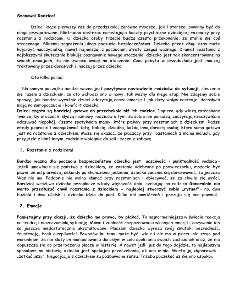 Szanowni Rodzice! Dzieci idące pierwszy raz do przedszkola, zarówno młodsze, jak i starsze, powinny być do niego przygotowane. Nietrudno dostrzec narastające koszty psychiczne dziecięcej rozpaczy przy rozstaniu z rodzicami. U dziecka osoby trzecie budzą często przekonanie, że stanie się coś strasznego. Silnemu zagrożeniu ulega poczucie bezpieczeństwa. Dziecko przez długi czas może kojarzyć nauczycielkę, nawet najmilszą, z poczuciem utraty czegoś ważnego. Dramat rozstania z najbliższymi skutecznie blokuje poznawanie nowego otoczenia: dziecko jest tak skoncentrowane na swoich emocjach, że nie zwraca uwagi na otoczenie. Czas pobytu w przedszkolu jest inaczej traktowany przez dorosłych i inaczej przez dziecko. Oto kilka porad. Na samym początku bardzo ważne jest pozytywne nastawienie rodziców do sytuacji, cieszenie się razem z dzieckiem, że oto wchodzi ono w nowy, tak ważny dla niego etap. Nie zdajemy sobie sprawy, jak bardzo wyraźnie dzieci odczytują nasze emocje i jak duży wpływ nastroje dorosłych mają na samopoczucie i komfort dziecka. Dzieci często są bardziej gotowe do przedszkola niż ich rodzice. Dopiero, gdy widzą zatroskane twarze, łzy w oczach, słyszą rozmowy rodziców o tym, że sobie nie poradzą, zaczynają rzeczywiście odczuwać niepokój. Często spotykałam mamy, które płakały przy rozstaniach z dzieckiem. Radzę wtedy poprosić i zaangażować tatę, babcię, dziadka, każdą inną dorosłą osobę, która sama gotowa jest na rozstanie z dzieckiem. Może się okazać, że płaczący przy rozstaniach z mamą maluch, gdy przyjdzie z kimś innym, radośnie wbiegnie do sali i zacznie zabawę. 1. Rozstanie z rodzicami Bardzo ważna dla poczucia bezpieczeństwa dziecka jest uczciwość i punktualność rodzica jeżeli umawiacie się państwo z dzieckiem, że zostanie odebrane po podwieczorku, możecie być pewni, że od pierwszej sekundy po skończeniu jedzenia, dziecko zacznie się denerwować, że jeszcze Was nie ma. Podobnie nie wolno kłamać przy rozstaniach i obiecywać, że za chwilę się wróci. Bardziej wrażliwe dziecko przepłacze wtedy większość dnia, czekając na rodzica. Generalnie nie warto przedłużać chwil rozstania z dzieckiem - najlepiej stworzyć sobie „rytuał" - np. dwa buziaki i dwa uściski i dziecko idzie do pani. Kilka dni powtórzeń i poczuje się ono pewniej. 2. Emocje Pamiętajmy przy okazji, że dziecko ma prawo, by płakać. To najnormalniejsza w świecie reakcja na trudną i niezrozumiałą sytuację. Mowa i zdolność rozpoznawania własnych emocji i nazywania ich są jeszcze niedostatecznie ukształtowane. Płaczem dziecko wyraża swój smutek, bezradność, frustrację, brak cierpliwości. Powodów ku temu może być wiele i nie ma w płaczu nic złego pod warunkiem, że nie służy on manipulowaniu dorosłym w celu spełnienia swoich zachcianek oraz, że nie dopuszcza się do przerodzenia płaczu w histerię. A nawet jeśli już do tego dojdzie, to najlepszym sposobem na histerię dziecka jest spokojne przeczekanie, aż ona minie. Warto ją zignorować „zatkać uszy". Negocjacje z dzieckiem są pozbawione sensu. Trzeba poczekać aż się ono uspokoi. 3. Co ze sobą zabrać? W niektórych przedszkolach w pierwszych dniach można przynieść ze sobą ulubioną zabawkę z domu. Trzeba ustalić z nauczycielem, jakiego typu może to być zabawka (pluszak, mały samochodzik itp.) i wybrać ją wspólnie z dzieckiem. Potrzebna będzie także szczoteczka do zębów, kubek, pasta, piżama, pościel, kapcie, oraz wygodne i łatwe do zakładania ubranka na zmianę. 4. Własne miejsce W pierwszym dniu przedszkola dziecko otrzymuje własne miejsce w szatni. Zostaje ono podpisane w jakiś umowny sposób - znaczkiem, zdjęciem, imieniem i nazwiskiem Warto wytłumaczyć dziecku, że powinno pilnować swoich rzeczy, pokazać, która jest jego szafka, jakie dostało kapcie, buty, ubrania rezerwowe (Trzeba być przygotowanym na to, że ubranka na zmianę są dziecku niezbędne, może ono polać się wodą podczas mycia rąk, zębów, pobrudzić obiadem, wylać coś na siebie, wejść w błoto, piach. Zachęcam, by nie przejmować się tym za bardzo - brud jest wpisany w prawo rozwojowe małego dziecka, jeśli doświadcza ono nowych rzeczy, uczy się, poznaje i bywa jeszcze w tym nie do końca precyzyjne, to takie sytuacje zdarzać się będą na porządku dziennym. Jedyne, co można zrobić, to ćwiczyć różne umiejętności w domu. A jak wiadomo trening czyni mistrza). 5. Wyleczyć dziecko do końca, gdy jest chore Musimy być przygotowani na większą niż do tej pory u dziecka zachorowalność. Szanujmy zdrowie naszego i innych dzieci. Choroby dla nikogo nie są przyjemne, a niedoleczone dziecko nie tylko stwarza ryzyko groźnych powikłań dla swojego organizmu, ale też zwyczajnie zaraża wirusami inne dzieci. 6. Nie przeładowywać dziecka zajęciami dodatkowymi W pierwszym roku przedszkola same zajęcia z nauczycielem i wszelkiego rodzaju zajęcia dodatkowe, wycieczki, zabawy, spotkania, teatrzyki stanowią dla trzylatka w pełni wystarczający zestaw edukacyjny. Jeśli obarczamy dziecko zajęciami popołudniowymi, to zwyczajnie możemy je przemęczyć. Można jedynie pokusić się o zajęcia ruchowe, czy basen, ale pod warunkiem, że łączymy to z naszym wspólnym czasem z dzieckiem, a nie oddaniem pociechy pod opiekę instruktora, czy innej osoby dorosłej. Jak przetrwać pierwsze trudne dni? Podsumowując te przygotowania, kilka rad: Dziecko, powinno wiedzieć, jak wygląda przedszkole. Wybierz się je zobaczyć, choćby na krótki spacer dookoła terenu przedszkola. Staraj się mówić dziecku jak najwięcej pozytywnych opinii o przedszkolu. Pamiętaj, że dla 3-latka przedszkole jest pojęciem abstrakcyjnym i trzeba mu je przybliżyć. Opowiedz o tym, co będzie robić: rysować kredkami z kolegami, malować farbami, bawić się zabawkami. Przedszkole z dużymi kolorowymi zabawkami powinno się