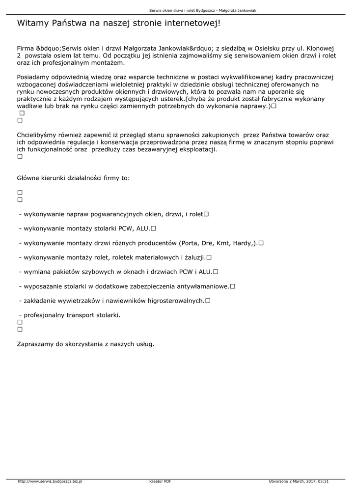 Serwis okien drzwi i rolet Bydgoszcz - Małgorzta Jankowiak Witamy Państwa na naszej stronie internetowej! Firma „Serwis okien i drzwi Małgorzata Jankowiak” z siedzibą w Osielsku przy ul. Klonowej 2 powstała osiem lat temu. Od początku jej istnienia zajmowaliśmy się serwisowaniem okien drzwi i rolet oraz ich profesjonalnym montażem. Posiadamy odpowiednią wiedzę oraz wsparcie techniczne w postaci wykwalifikowanej kadry pracowniczej wzbogaconej doświadczeniami wieloletniej praktyki w dziedzinie obsługi technicznej oferowanych na rynku nowoczesnych produktów okiennych i drzwiowych, która to pozwala nam na uporanie się praktycznie z każdym rodzajem występujących usterek.(chyba że produkt został fabrycznie wykonany wadliwie lub brak na rynku części zamiennych potrzebnych do wykonania naprawy.) Chcielibyśmy również zapewnić iż przegląd stanu sprawności zakupionych przez Państwa towarów oraz ich odpowiednia regulacja i konserwacja przeprowadzona przez naszą firmę w znacznym stopniu poprawi ich funkcjonalność oraz przedłuży czas bezawaryjnej eksploatacji. Główne kierunki działalności firmy to: - wykonywanie napraw pogwarancyjnych okien, drzwi, i rolet - wykonywanie montaży stolarki PCW, ALU. - wykonywanie montaży drzwi różnych producentów (Porta, Dre, Kmt, Hardy,). - wykonywanie montaży rolet, roletek materiałowych i żaluzji. - wymiana pakietów szybowych w oknach i drzwiach PCW i ALU. - wyposażanie stolarki w dodatkowe zabezpieczenia antywłamaniowe. - zakładanie wywietrzaków i nawiewników higrosterowalnych. - profesjonalny transport stolarki. Zapraszamy do skorzystania z naszych usług. http://www.serwis.bydgoszcz.biz.pl Kreator PDF Utworzono 2 March, 2017, 05:31
