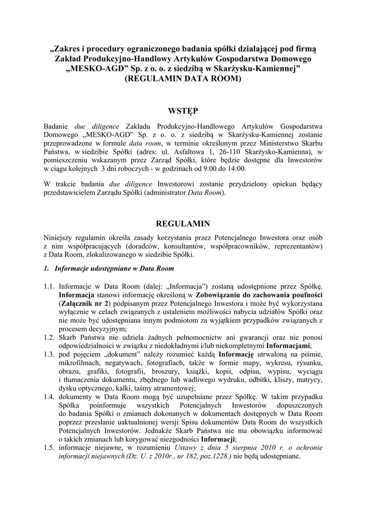 „Zakres i procedury ograniczonego badania spółki działającej pod firmą Zakład Produkcyjno-Handlowy Artykułów Gospodarstwa Domowego „MESKO-AGD” Sp. z o. o. z siedzibą w Skarżysku-Kamiennej” (REGULAMIN DATA ROOM) WSTĘP Badanie due diligence Zakładu Produkcyjno-Handlowego Artykułów Gospodarstwa Domowego „MESKO-AGD” Sp. z o. o. z siedzibą w Skarżysku-Kamiennej zostanie przeprowadzone w formule data room, w terminie określonym przez Ministerstwo Skarbu Państwa, w siedzibie Spółki (adres: ul. Asfaltowa 1, 26-110 Skarżysko-Kamienna), w pomieszczeniu wskazanym przez Zarząd Spółki, które będzie dostępne dla Inwestorów w ciągu kolejnych 3 dni roboczych - w godzinach od 9:00 do 14:00. W trakcie badania due diligence Inwestorowi zostanie przydzielony opiekun będący przedstawicielem Zarządu Spółki (administrator Data Room). REGULAMIN Niniejszy regulamin określa zasady korzystania przez Potencjalnego Inwestora oraz osób z nim współpracujących (doradców, konsultantów, współpracowników, reprezentantów) z Data Room, zlokalizowanego w siedzibie Spółki. 1. Informacje udostępniane w Data Room 1.1. Informacje w Data Room (dalej: „Informacja”) zostaną udostępnione przez Spółkę. Informacja stanowi informację określoną w Zobowiązaniu do zachowania poufności (Załącznik nr 2) podpisanym przez Potencjalnego Inwestora i może być wykorzystana wyłącznie w celach związanych z ustaleniem możliwości nabycia udziałów Spółki oraz nie może być udostępniana innym podmiotom za wyjątkiem przypadków związanych z procesem decyzyjnym; 1.2. Skarb Państwa nie udziela żadnych pełnomocnictw ani gwarancji oraz nie ponosi odpowiedzialności w związku z niedokładnymi i/lub niekompletnymi Informacjami; 1.3. pod pojęciem „dokument” należy rozumieć każdą Informację utrwaloną na piśmie, mikrofilmach, negatywach, fotografiach, także w formie mapy, wykresu, rysunku, obrazu, grafiki, fotografii, broszury, książki, kopii, odpisu, wypisu, wyciągu i tłumaczenia dokumentu, zbędnego lub wadliwego wydruku, odbitki, kliszy, matrycy, dysku optycznego, kalki, taśmy atramentowej; 1.4. dokumenty w Data Room mogą być uzupełniane przez Spółkę. W takim przypadku Spółka poinformuje wszystkich Potencjalnych Inwestorów dopuszczonych do badania Spółki o zmianach dokonanych w dokumentach dostępnych w Data Room poprzez przesłanie uaktualnionej wersji Spisu dokumentów Data Room do wszystkich Potencjalnych Inwestorów. Jednakże Skarb Państwa nie ma obowiązku informować o takich zmianach lub korygować niezgodności Informacji; 1.5. informacje niejawne, w rozumieniu Ustawy z dnia 5 sierpnia 2010 r. o ochronie informacji niejawnych (Dz. U. z 2010r., nr 182, poz.1228.) nie będą udostępniane. 2. Dokumenty 2.1. spis Informacji udostępnianych przez Spółkę w Data Room stanowi Załącznik nr 3 do niniejszego dokumentu; 2.2. żadne dokumenty udostępnione w Data Room nie mogą być usunięte ani kopiowane lub skanowane przez osoby badające Spółkę. Prośby o kopiowanie ograniczonej liczby dokumentów (których zbadanie wymaga dokładnego przeanalizowania poza obszarem Data Room) mogą być rozważone, chociaż rezerwuje się prawo do odmowy. Prośby o kopiowanie powinny być złożone na formularzu „Data Room – Zapotrzebowanie na kopię” dostępnym w Data Room (Załącznik nr 4); 2.3. żadne dokumenty nie mogą być znaczone, zmieniane, modyfikowane lub niszczone w jakikolwiek sposób. Dokumenty mogą być wyjęte z segregatora lub skoroszytu, w którym są przechowywane, lecz powinny być włożone dokładnie w to samo miejsce, w takiej samej formie jak początkowo; 2.4. dokumenty, które są złączone lub zszyte nie mogą być rozłączane. Będziecie Państwo poproszeni o wskazanie – spośród osób dokonujących badania – Przedstawiciela, którego zadaniem będzie sprawdzenie przed opuszczeniem Data Room, czy wszystkie dokumenty z Data Room zostały zwrócone na swoje miejsca w stanie nienaruszonym; 2.5. telefony komórkowe oraz komputery osobiste (bez funkcji skanowania) mogą być używane w Data Room. Skarb Państwa ani Spółka nie ponosi odpowiedzialności za przedmioty przyniesione przez gości do Data Room; powinny być one zabrane pod koniec każdego dnia wizyty. 3. Pytania / Zagadnienia 3.1. Przedstawiciele Spółki będą obecni w Data Room w celu nadzorowania procesów badania oraz celem rozwiązywania jedynie problemów o charakterze administracyjnym. Osoby prowadzące badanie Spółki powinny stosować się do instrukcji / wytycznych wydawanych przez Administratora Data Room, 3.2. Wszystkie pytania natury merytorycznej powstałe w związku z udostępnionymi informacjami lub prośby o dodatkowe informacje muszą być przedstawiane w formie pisemnej Administratorowi. Pytania od zespołu Potencjalnego Inwestora powinny być zebrane przez Przedstawiciela Potencjalnego Inwestora. Jeden zestaw pytań może być przedstawiany na koniec każdego dnia, podczas którego Potencjalny Inwestor będzie przeprowadzał badanie. 4. Spotkanie z kierownictwem Spółki Podczas trwania badania Spółki, na prośbę Przedstawiciela Potencjalnego Inwestora, zgłoszoną Administratorowi Data Room, możliwe jest przeprowadzenie spotkania z reprezentantami kierownictwa Spółki. Ze względu na ograniczony czas badania Spółki będziemy wdzięczni za zgłoszenie takiej prośby w początkowym okresie przeprowadzania due diligence Spółki. 5. Spotkanie z przedstawicielami Agencji Rozwoju Przemysłu S.A. Podczas trwania badania Spółki, na prośbę Przedstawiciela Potencjalnego Inwestora, zgłoszoną do Departamentu Przekształceń Własnościowych i Prywatyzacji, możliwe jest przeprowadzenie spotkania z przedstawicielami Agencji Rozwoju Przemysłu S.A. odnośnie pomocy publicznej dla Spółki. 2 6. Wizyty w obiektach Spółki Wizytacja obiektów Spółki w ramach due diligence wymaga wcześniejszych uzgodnień z Zarządem Spó