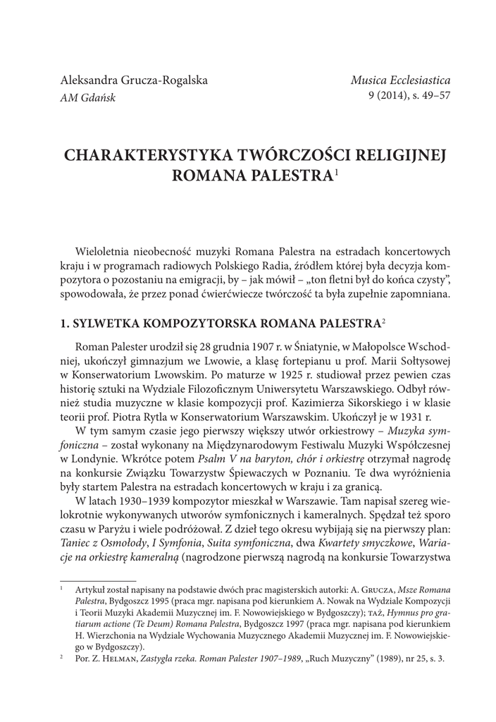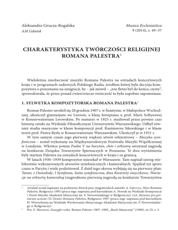 Aleksandra Grucza-Rogalska AM Gdańsk Musica Ecclesiastica 9 (2014), s. 49–57 CHARAKTERYSTYKA TWÓRCZOŚCI RELIGIJNEJ ROMANA PALESTRA1 Wieloletnia nieobecność muzyki Romana Palestra na estradach koncertowych kraju i w programach radiowych Polskiego Radia, źródłem której była decyzja kompozytora o pozostaniu na emigracji, by – jak mówił – „ton fletni był do końca czysty”, spowodowała, że przez ponad ćwierćwiecze twórczość ta była zupełnie zapomniana. 1. SYLWETKA KOMPOZYTORSKA ROMANA PALESTRA2 Roman Palester urodził się 28 grudnia 1907 r. w Śniatynie, w Małopolsce Wschodniej, ukończył gimnazjum we Lwowie, a klasę fortepianu u prof. Marii Sołtysowej w Konserwatorium Lwowskim. Po maturze w 1925 r. studiował przez pewien czas historię sztuki na Wydziale Filozoficznym Uniwersytetu Warszawskiego. Odbył również studia muzyczne w klasie kompozycji prof. Kazimierza Sikorskiego i w klasie teorii prof. Piotra Rytla w Konserwatorium Warszawskim. Ukończył je w 1931 r. W tym samym czasie jego pierwszy większy utwór orkiestrowy – Muzyka symfoniczna – został wykonany na Międzynarodowym Festiwalu Muzyki Współczesnej w Londynie. Wkrótce potem Psalm V na baryton, chór i orkiestrę otrzymał nagrodę na konkursie Związku Towarzystw Śpiewaczych w Poznaniu. Te dwa wyróżnienia były startem Palestra na estradach koncertowych w kraju i za granicą. W latach 1930–1939 kompozytor mieszkał w Warszawie. Tam napisał szereg wielokrotnie wykonywanych utworów symfonicznych i kameralnych. Spędzał też sporo czasu w Paryżu i wiele podróżował. Z dzieł tego okresu wybijają się na pierwszy plan: Taniec z Osmołody, I Symfonia, Suita symfoniczna, dwa Kwartety smyczkowe, Wariacje na orkiestrę kameralną (nagrodzone pierwszą nagrodą na konkursie Towarzystwa 1 2 Artykuł został napisany na podstawie dwóch prac magisterskich autorki: A. Grucza, Msze Romana Palestra, Bydgoszcz 1995 (praca mgr. napisana pod kierunkiem A. Nowak na Wydziale Kompozycji i Teorii Muzyki Akademii Muzycznej im. F. Nowowiejskiego w Bydgoszczy); taż, Hymnus pro gratiarum actione (Te Deum) Romana Palestra, Bydgoszcz 1997 (praca mgr. napisana pod kierunkiem H. Wierzchonia na Wydziale Wychowania Muzycznego Akademii Muzycznej im. F. Nowowiejskiego w Bydgoszczy). Por. Z. Helman, Zastygła rzeka. Roman Palester 1907–1989, „Ruch Muzyczny” (1989), nr 25, s. 3. 52 Musica Ecclesiastica nr 9 (2014) Wydawniczego Muzyki Polskiej w 1935 r.) oraz balet Pieśń o ziemi. Balet ten, grany wielokrotnie w Polsce, Francji, Anglii i Niemczech w choreografii Bronisławy Niżyńskiej, zdobył złoty medal na Paryskiej Wystawie Światowej w 1937 r. W tych latach Palester brał żywy udział w polskim życiu muzycznym, m.in. będąc sekretarzem generalnym Stowarzyszenia Kompozytorów Polskich, wiceprezesem Polskiego Towarzystwa Muzyki Współczesnej, członkiem zarządu ZAiKS-u, członkiem Rady Muzycznej Towarzystwa Szerzenia Sztuki Polskiej wśród Obcych itd. Komponował też wiele muzyki filmowej oraz ilustracji muzycznych do sztuk teatralnych i radiowych. Z jego współpracy w dziedzinie muzyki scenicznej korzystali wszyscy wybitniejsi reżyserzy polscy: Leon Schiller, Juliusz Osterwa, Teofil Trzciński, Aleksander Zelwerowicz, Edmund Wierciński, Stanisława Perzanowska, W. Radulski i inni. Z tego okresu pochodzą również ścieżki dźwiękowe do takich filmów, jak: Dzikie pola, Róża, Młody las, Dziewczęta z Nowolipek, Dzień wielkiej przygody, oraz do licznych filmów krótkometrażowych. Lata wojny spędził Palester w Warszawie. W tym czasie jego muzyka nabiera cech bardziej romantycznych i odcina się od dawniejszych wpływów Strawińskiego i Hindemitha. Najbardziej charakterystyczne dla tego okresu są: II Symfonia, poemat Kołacze do tekstu z sielanek Szymonowica, III Kwartet smyczkowy, Koncert skrzypcowy oraz Requiem na 4 głosy solowe, chór i orkiestrę, powstałe tuż po wojnie, a poświęcone pamięci przyjaciół, którzy zginęli walcząc w Warszawie. W czasie Powstania Warszawskiego stracił Palester szereg utworów, których nie wydane rękopisy spaliły się w jego mieszkaniu. Po zakończeniu działań wojennych zamieszkał w Krakowie i został profesorem kompozycji i prorektorem świeżo powstałej Wyższej Szkoły Muzycznej. Został też pierwszym laureatem Nagrody Muzycznej Miasta Krakowa, a jego muzyka weszła do repertuaru wszystkich orkiestr polskich i wielu zagranicznych. Koncert skrzypcowy wykonano z dużym powodzeniem na pierwszym powojennym festiwalu Międzynarodowego Towarzystwa Muzyki Współczesnej w Londynie, a II Symfonię na festiwalu UNESCO w Paryżu. Palester był w tym okresie w Polsce kompozytorem o najpoważniejszym dorobku twórczym i ugruntowanej pozycji międzynarodowej. Popularność wśród najszerszych rzesz słuchaczy zyskał też dzięki muzyce do pierwszych powojennych filmów, takich jak: Zakazane piosenki, Ostatni etap, Ulica Graniczna i Robinson Warszawski. Tymczasem władze polskie zaczęły w połowie 1949 r. wprowadzać w życie nową politykę kulturalną. Ogłoszenie walki z tzw. „formalizmem” i sformułowanie postulatu sztuki klasowej w postaci socjalistycznego realizmu postawiło wielu artystów wobec konieczności wyboru. Palester zdecydował się na drogę najtrudniejszą: wybrał emigrację, aby – jak uważał – nie tracić swobody w wyborze dalszej drogi twórczej i aby móc walczyć słowem i piórem z tendencją, którą uważał za szkodliwą dla kultury polskiej. Podejmując tę decyzję, nie docenił jednak ujemnych stron operacji: ratując swoją niezależność artystyczną i odrzucając przymus kłamstwa, przekreślał jednocześnie całą swoją dotychczasową pozycję i popularność oraz stawiał pod zna- A. Grucza-Rogalska Charakterystyka twórczości religijnej Romana Palestra 53 kiem zapytania naturalne zakorzenienie w rodzimym środowisku krajowym – tak niezbędnym dla psychiki artysty. Paryż, późn