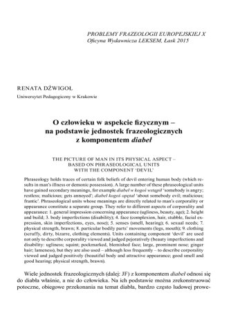 PROBLEMY FRAZEOLOGII EUROPEJSKIEJ X Oficyna Wydawnicza LEKSEM, Łask 2015 Renata Dźwigoł Uniwersytet Pedagogiczny w Krakowie O człowieku w aspekcie fizycznym – na podstawie jednostek frazeologicznych z komponentem diabeł The picture of man in its physical aspect – based on phraseological units with the component ‘devil’ Phraseology holds traces of certain folk beliefs of devil entering human body (which results in man’s illness or demonic possession). A large number of these phraseological units have gained secondary meanings, for example diabeł w kogoś wstąpił ‘somebody is angry; restless; malicious; gets annoyed’; diabeł kogoś opętał ‘about somebody evil; malicious; frantic’. Phraseological units whose meanings are directly related to man’s corporality or appearance constitute a separate group. They refer to different aspects of corporality and appearance: 1. general impression concerning appearance (ugliness, beauty, age); 2. height and build; 3. body imperfections (disability); 4. face (complexion, hair, stubble, facial expression, skin imperfections, eyes, nose); 5. senses (smell, hearing); 6. sexual needs; 7. physical strength, brawn; 8. particular bodily parts’ movements (legs, mouth); 9. clothing (scruffy, dirty, bizarre, clothing elements). Units containing component ‘devil’ are used not only to describe corporality viewed and judged pejoratively (beauty imperfections and disability: ugliness; squint; pockmarked, blemished face; large, prominent nose; ginger hair; lameness), but they are also used – although less frequently – to describe corporality viewed and judged positively (beautiful body and attractive appearance; good smell and good hearing; physical strength, brawn). Wiele jednostek frazeologicznych (dalej: JF) z komponentem diabeł odnosi się do diabła właśnie, a nie do człowieka. Na ich podstawie można zrekonstruować potoczne, obiegowe przekonania na temat diabła, bardzo często ludowej prowe- 112 Renata Dźwigoł niencji, diabeł jest bowiem nadrzędną postacią demonologii ludowej. Obraz diabła we frazeologii polskiej był przedmiotem zainteresowania wielu autorów, m.in. Jerzego Tredera (1989, 2000), Doroty Adamiec (1998, 2007), Anny Krawczyk-Tyrpy (2001), Jarosławy Iwczenko (2005, 2007a, 2007b), Anny Kaczan (2005), Kazimierza Długosza (2007), Elżbiety Skorupskiej-Raczyńskiej (2008), Emila Popławskiego (2011), Renaty Dźwigoł (2011a, 2011b, 2011c). Najobszerniejszym opracowaniem z tego zakresu jest nieopublikowane w formie książkowej studium porównawcze Jarosławy Iwczenko Postać diabła we frazeologii i paremiologii polskiej i wschodniosłowiańskiej (2007b)1, w którym analizowany jest materiał polski, ukraiński, rosyjski, białoruski. Wśród JF z komponentem diabeł są jednak i takie, które opisują nie diabła, a człowieka – i to w różnych aspektach, np. fizycznym, psychicznym, moralnym, społecznym, etnicznym. Chciałabym się zająć omówieniem pierwszego z wymienionych aspektów. Materiał językowy, który został w tym celu poddany analizie, obejmuje frazeologizmy, wyrażenia i zwroty porównawcze, a także powiedzenia, przysłowia, priamele. Wyekscerpowałam je ze słowników rejestrujących polszczyznę ogólną (dawną i współczesną) oraz polszczyznę dialektalną2. Uwzględniłam nie tylko JF z komponentem o znaczeniu ‘diabeł’ (stanowią go nazwy diabła – takie, jak diabeł, czart, bies i inne), ale także JF z komponentem przymiotnikowym diabli, diabelski. Nierzadko, wskutek leksykalizacji JF, znaczenie ‘diabeł’ jest zatarte – tak, jak w przypadku diabeł wie ‘nikt nie wie’. Ten frazeologizm wchodzi w skład JF bardziej rozbudowanej: Diabeł wie, jak stary on je ‘trudno określić/ nie wiadomo/ nikt nie wie, ile ktoś (o kim mowa) ma lat’, którą uwzględniam w prezentowanym materiale, ponieważ jej znaczenie odnosi się do fizyczności człowieka (precyzyjniej – do wieku). W opisie zgromadzonego materiału językowego przyjęłam perspektywę panchroniczną. Cennym źródłem materiału były zwłaszcza: NKPP, SGKasz oraz słowniki frazeologiczne. W związku z tym, że dość duża część zgromadzonego materiału to JF odnotowane w słownikach gwarowych, uwzględniłam także monografię Anny Tyrpy Frazeologia somatyczna. Związki frazeologiczne o znaczeniach motywowanych cechami części ciała w gwarach polskich (2005), w której odnoto1Autorka oparła swoją analizę na schemacie-kwestionariuszu, opracowanym w Instytucie Słowianoznawstwa Rosyjskiej Akademii Nauk przez zespół naukowców na czele z L. Winogradową i S. Tołstojową, który służy do maksymalnie szczegółowego opisu i identyfikacji każdej postaci z mitologii słowiańskiej. 2Wśród nich jest Słownik gwar kaszubskich na tle kultury ludowej ks. Bernarda Sychty – w związku z tym, że przyjmuję tu (zgodnie z wieloletnią tradycją) podział polskiego obszaru gwarowego na 5 dialektów: śląski, małopolski, wielkopolski, mazowiecki oraz kaszubski, mając przy tym świadomość, że ten ostatni w 2005 r. uzyskał status języka regionalnego w Polsce. O CZŁOWIEKU W ASPEKCIE FIZYCZNYM 113 wano pięć JF z komponentem diabeł3, jednak żadna z nich nie wyraża znaczenia związanego z cielesnością człowieka. Moim celem jest nie tylko przeanalizowanie obrazu człowieka w aspekcie fizycznym, obrazu cielesności człowieka4, ale także wartościowań, które wyrażają analizowane frazeologizmy i przysłowia. Skoro we frazeologii przeważają wartościowania negatywne (Pajdzińska 1991), a demon zła – diabeł jest traktowany jako symbol zła, ale także brzydoty5, spodziewać się można, że analizowanym JF towarzyszyć będzie wartościowanie negatywne. Czy we wszystkich przypadkach? Na negatywne wartościowanie JF z komponentem diabeł zwracały uwagę m.in. Ludmiła Iwaszko (1997) oraz Anna Tyrpa (2004). Anna Pajdzińska pisała zaś (analizując frazeologizmy będące od