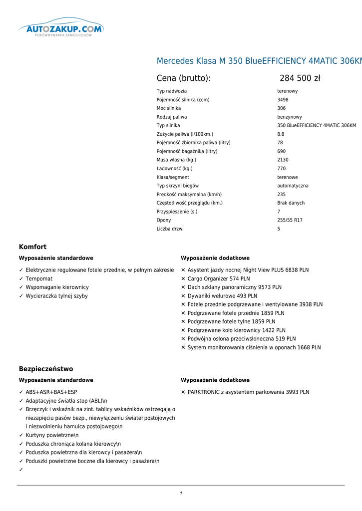 Mercedes Klasa M 350 BlueEFFICIENCY 4MATIC 306KM Cena (brutto): 284 500 zł Typ nadwozia terenowy Pojemność silnika (ccm) 3498 Moc silnika 306 Rodzaj paliwa benzynowy Typ silnika 350 BlueEFFICIENCY 4MATIC 306KM Zużycie paliwa (l/100km.) 8.8 Pojemność zbiornika paliwa (litry) 78 Pojemność bagażnika (litry) 690 Masa własna (kg.) 2130 Ładowność (kg.) 770 Klasa/segment terenowe Typ skrzyni biegów automatyczna Prędkość maksymalna (km/h) 235 Częstotliwość przeglądu (km.) Brak danych Przyspieszenie (s.) 7 Opony 255/55 R17 Liczba drzwi 5 Komfort Wyposażenie standardowe Wyposażenie dodatkowe ✓ Elektrycznie regulowane fotele przednie, w pełnym zakresie ✕ Asystent jazdy nocnej Night View PLUS 6838 PLN ✓ Tempomat ✕ Cargo Organizer 574 PLN ✓ Wspomaganie kierownicy ✕ Dach szklany panoramiczny 9573 PLN ✓ Wycieraczka tylnej szyby ✕ Dywaniki welurowe 493 PLN ✕ Fotele przednie podgrzewane i wentylowane 3938 PLN ✕ Podgrzewane fotele przednie 1859 PLN ✕ Podgrzewane fotele tylne 1859 PLN ✕ Podgrzewane koło kierownicy 1422 PLN ✕ Podwójna osłona przeciwsłoneczna 519 PLN ✕ System monitorowania ciśnienia w oponach 1668 PLN Bezpieczeństwo Wyposażenie standardowe Wyposażenie dodatkowe ✓ ABS+ASR+BAS+ESP ✕ PARKTRONIC z asystentem parkowania 3993 PLN ✓ Adaptacyjne światła stop (ABL)\n ✓ Brzęczyk i wskaźnik na zint. tablicy wskaźników ostrzegają o niezapięciu pasów bezp., niewyłączeniu świateł postojowych i niezwolnieniu hamulca postojowego\n ✓ Kurtyny powietrzne\n ✓ Poduszka chroniąca kolana kierowcy\n ✓ Poduszka powietrzna dla kierowcy i pasażera\n ✓ Poduszki powietrzne boczne dla kierowcy i pasażera\n ✓ 1 Status zapiętych tylnych pasów\n 2 ✓ Sygnalizacja spadku ciśnienia w oponach\n ✓ System DSR (Dynamic steering Recommendation)\n Dodatki Wyposażenie standardowe Wyposażenie dodatkowe ✓ Adaptacyjne światło hamowania ✕ Active Curve System 16958 PLN ✓ Aktywna maska chroniąca pieszych ✕ AIRMATIC DC (aktywne zawieszenie pneumatyczne) 9299 ✓ Atermiczne szyby w kolorze zielonym ✕ Aluminiowe PLN poprzeczki do bagażników dachowych 957 PLN ✓ Centralny zamek ✕ Aluminiowe stopnie przyprogowe 2571 PLN ✓ Chromowane relingi dachowe ✕ Becker MAP PILOT - zestaw nawigacyjny 4376 PLN ✓ Dwa uchwyty na kubki z przodu ✕ Boczne poduszki powietrzne dla pasażerów tylnej kanapy ✓ Elektroniczny kluczyk chromowany ✕ COMAND Online 14332 PLN ✓ Elektrycznie zamykane szyby ✕ COMAND Online ze zmieniarką DVD 15973 PLN ✓ Elektryczny hamulec postojowy z funkcją komfortowej ✕ Deska rozdzielcza obszyta skórą ARTICO 4923 PLN ✓ Elementy obsługi wykończenia wnętrza w aluminium ✕ EASY-PACK 2844 PLN ✓ Felgi kół ze stopów metali lekkich 17; 10-ramienne ✕ EASY-PACK - osłona przestrzeni bagażowej 328 PLN ✓ Funkcja ECO Start-Stop ✕ EASY-PACK system FIXKIT 1613 PLN ✓ Gniazdo 12 V na konsoli środkowej, pod tylną kanapą z ✕ Elementy wykończenia wnętrza w drewnie eukaliptusa 1094 1859 PLN prawej strony w przestrzeni bagażowej PLN ✓ Gwarancja + Assistance ✕ Elementy wykończenia wnętrza w drewnie jesionu 1969 PLN ✓ Kanapa tylna z oparciem składanym 1/3:2/3 ✕ Elementy wykończenia wnętrza w drewnie orzechowym 1969 PLN ✓ Kierownica wielofunkcyjna obszyta skórą nappa z aplikacjami ✕ Elementy wykończenia wnętrza w drewnie topoli 1969 PLN drewnianymi ✓ klimatyzacja THERMATIC ✕ Felgi kół AMG ze stopów metali lekkich 20"; 5-ramienne 4540 PLN ✓ Lakier standardowy ✕ Felgi kół AMG ze stopów metali lekkich 21"; 5-ramienne, 2-szprychowe 3282 PLN ✓ Lusterka zewnętrzne podgrzewane, regulowane elektrycznie ✕ Felgi kół ze stopów metali lekkich 17"; od wewnątrz, asferyczne ✓ Mechaniczna regulacja wysokości i długości kolumny 7-ramienne,2-szprychowe 437 PLN ✕ Felgi kół ze stopów metali lekkich 17; 10-ramienne 437 PLN kierownicy ✓ Mechaniczne zabezpieczenie tylnych drzwi przed ✕ Felgi kół ze stopów metali lekkich 18"; 7-ramienne otwieraniem przez dzieci ✓ Mocowanie fotelików dziecięcych ISOFIX z tyłu 1367 PLN ✕ Felgi kół ze stopów metali lekkich 19"; 5-ramienne 3555 PLN ✓ Osłony przeciwsłoneczne z lusterkiem do makijażu, ✕ Felgi kół ze stopów metali lekkich 19"; 7-ramienne podświetlane i odchylane na bok 2735 PLN ✓ Program do jazdy terenowej z przyciskiem offroad ✕ Felgi kół ze stopów metali lekkich 19; 5-ramienne, ✓ Reflektory do jazdy dziennej ✕ Felgi kół ze stopów metali lekkich 20"; 10-ramienne ✓ Reflektory projekcyjne H7 pokryte szkłem przeźroczystym ✕ Felgi kół ze stopów metali lekkich 20"; ✓ Schowek na okulary w dachowym panelu obsługowym, ✕ Hak z zaczepem kulowym składany elektrycznie 4978 PLN 2-szprychowe 4649 PLN 3555 PLN 5-ramienne,2-szprychowe 6838 PLN podświetlany ✓ 3 Światła tylne LED ✕ 4 Kamera cofania 2188 PLN 5 ✓ System Audio 20 ze zmieniarką CD i 8 głośnikami ✕ KEYLESS-GO 4868 PLN ✓ System ochrony pieszych z aktywną maską silnika ✕ Klimatyzacja Thermatronic 3655 PLN ✓ System ostrzegający o spadku ciśnienia w oponach ✕ Koło dojazdowe 382 PLN ✓ System PRE-SAFE ✕ Lakier metalik 4759 PLN ✓ Szyba tylna podgrzewana, ze sterowaniem czasowym ✕ Media interface 1203 PLN ✓ Wycieraczki z czujnikiem deszczu ✕ Możliwość załadunku dłuższych przedmiotów 1039 PLN ✓ Zestaw do naprawy opon TIREFIT z pompką elektryczną ✕ Opony Run-Flat 1914 PLN ✕ Oświetlenie AMBIENTE 1914 PLN ✕ Osłona przestrzeni bagażowej z siatką bezpieczeństwa 1258 PLN ✕ Pilot otwierania bramy garażu (HomeLink) 1230 PLN ✕ Plastikowa wykładzina bagażnika 344 PLN ✕ Podgrzewany układ spryskiwaczy przedniej szyby 929 PLN ✕ Podsufitka materiałowa designo - czarna 1914 PLN ✕ Przyciemniane szyby tylne 2133 PLN ✕ Przygotowanie do montażu Becker MAP PILOT 1614 PLN ✕ Przygotowanie do montażu systemu multimedialnego dla pasażerów tylnej kanapy 902 PLN ✕ Przygot