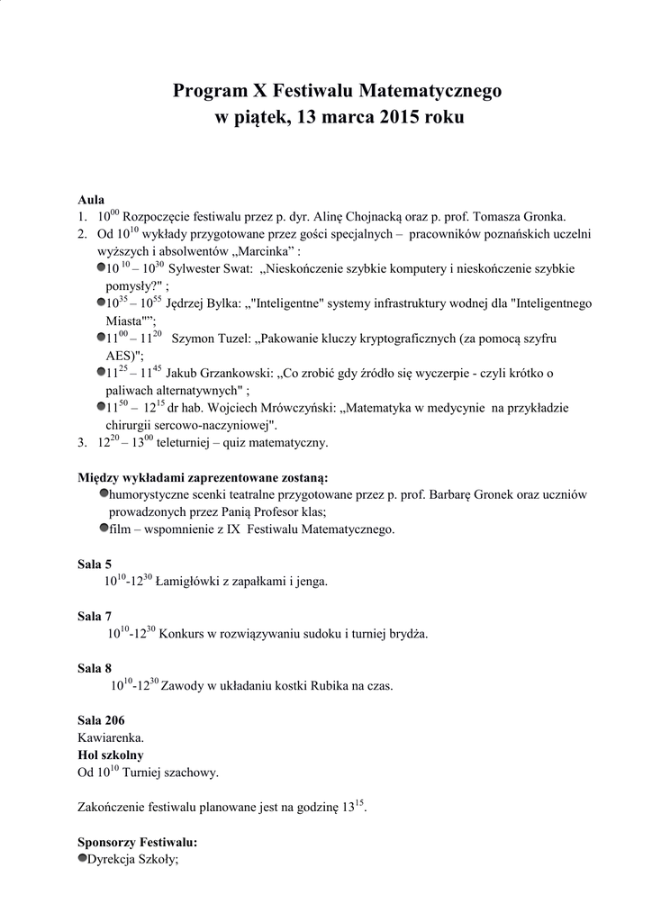 Program X Festiwalu Matematycznego w piątek, 13 marca 2015 roku Aula 1. 1000 Rozpoczęcie festiwalu przez p. dyr. Alinę Chojnacką oraz p. prof. Tomasza Gronka. 2. Od 1010 wykłady przygotowane przez gości specjalnych – pracowników poznańskich uczelni wyższych i absolwentów „Marcinka” : 10 10 – 1030 Sylwester Swat: „Nieskończenie szybkie komputery i nieskończenie szybkie pomysły?" ; 1035 – 1055 Jędrzej Bylka: „"Inteligentne" systemy infrastruktury wodnej dla "Inteligentnego Miasta"”; 1100 – 1120 Szymon Tuzel: „Pakowanie kluczy kryptograficznych (za pomocą szyfru AES)"; 1125 – 1145 Jakub Grzankowski: „Co zrobić gdy źródło się wyczerpie - czyli krótko o paliwach alternatywnych" ; 1150 – 1215 dr hab. Wojciech Mrówczyński: „Matematyka w medycynie na przykładzie chirurgii sercowo-naczyniowej". 3. 1220 – 1300 teleturniej – quiz matematyczny. Między wykładami zaprezentowane zostaną: humorystyczne scenki teatralne przygotowane przez p. prof. Barbarę Gronek oraz uczniów prowadzonych przez Panią Profesor klas; film – wspomnienie z IX Festiwalu Matematycznego. Sala 5 1010-1230 Łamigłówki z zapałkami i jenga. Sala 7 1010-1230 Konkurs w rozwiązywaniu sudoku i turniej brydża. Sala 8 1010-1230 Zawody w układaniu kostki Rubika na czas. Sala 206 Kawiarenka. Hol szkolny Od 1010 Turniej szachowy. Zakończenie festiwalu planowane jest na godzinę 1315. Sponsorzy Festiwalu: Dyrekcja Szkoły; Stowarzyszenie Wychowanków Gimnazjum i Liceum im. Karola Marcinkowskiego w Poznaniu; Wydawnictwo NAKOM. Nagrody: finaliści konkursu matematycznego i zwycięzcy innych konkursów otrzymają książki od Stowarzyszenia Wychowanków Gimnazjum i Liceum im. Karola Marcinkowskiego w Poznaniu; Patroni medialni: „Alfa & Omega Matematyki”; „Okolicznik”; „Pedagogia” Opieka merytoryczna i organizacyjna: p. prof. Barbara Gronek, p. prof. Tomasz Gronek, p. prof. Karolina Mądra, p. prof. Sławomir Kwaśny, p. prof . Magdalena Adamczak. Tomasz Gronek