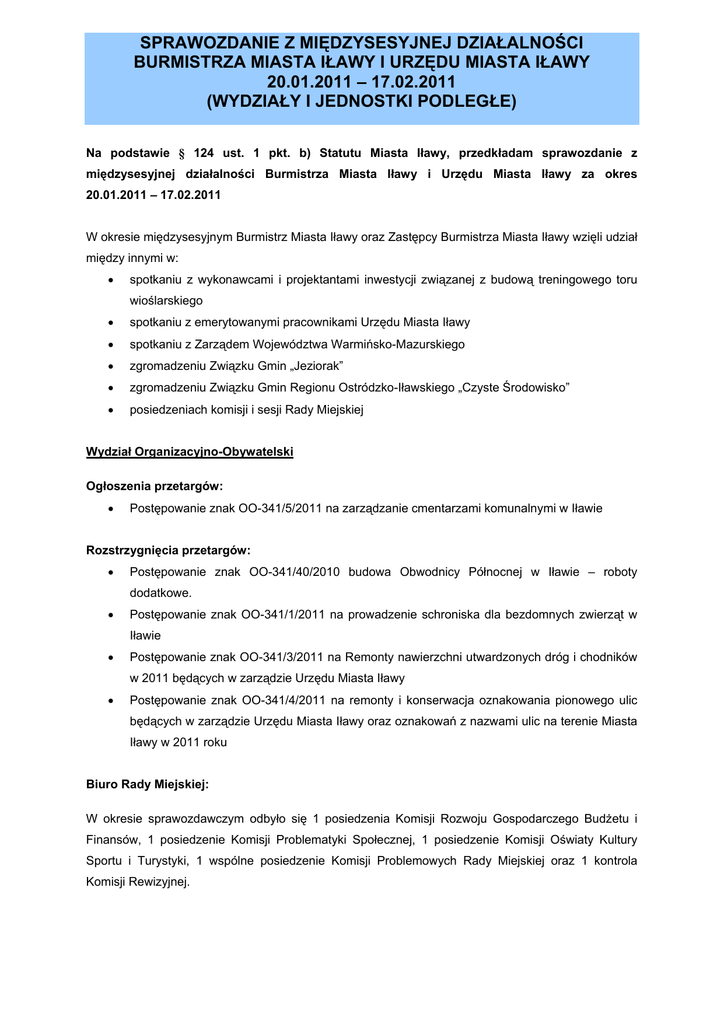 SPRAWOZDANIE Z MIĘDZYSESYJNEJ DZIAŁALNOŚCI BURMISTRZA MIASTA IŁAWY I URZĘDU MIASTA IŁAWY 20.01.2011 – 17.02.2011 (WYDZIAŁY I JEDNOSTKI PODLEGŁE) Na podstawie § 124 ust. 1 pkt. b) Statutu Miasta Iławy, przedkładam sprawozdanie z międzysesyjnej działalności Burmistrza Miasta Iławy i Urzędu Miasta Iławy za okres 20.01.2011 – 17.02.2011 W okresie międzysesyjnym Burmistrz Miasta Iławy oraz Zastępcy Burmistrza Miasta Iławy wzięli udział między innymi w: • spotkaniu z wykonawcami i projektantami inwestycji związanej z budową treningowego toru wioślarskiego • spotkaniu z emerytowanymi pracownikami Urzędu Miasta Iławy • spotkaniu z Zarządem Województwa Warmińsko-Mazurskiego • zgromadzeniu Związku Gmin „Jeziorak” • zgromadzeniu Związku Gmin Regionu Ostródzko-Iławskiego „Czyste Środowisko” • posiedzeniach komisji i sesji Rady Miejskiej Wydział Organizacyjno-Obywatelski Ogłoszenia przetargów: • Postępowanie znak OO-341/5/2011 na zarządzanie cmentarzami komunalnymi w Iławie Rozstrzygnięcia przetargów: • Postępowanie znak OO-341/40/2010 budowa Obwodnicy Północnej w Iławie – roboty dodatkowe. • Postępowanie znak OO-341/1/2011 na prowadzenie schroniska dla bezdomnych zwierząt w Iławie • Postępowanie znak OO-341/3/2011 na Remonty nawierzchni utwardzonych dróg i chodników w 2011 będących w zarządzie Urzędu Miasta Iławy • Postępowanie znak OO-341/4/2011 na remonty i konserwacja oznakowania pionowego ulic będących w zarządzie Urzędu Miasta Iławy oraz oznakowań z nazwami ulic na terenie Miasta Iławy w 2011 roku Biuro Rady Miejskiej: W okresie sprawozdawczym odbyło się 1 posiedzenia Komisji Rozwoju Gospodarczego Budżetu i Finansów, 1 posiedzenie Komisji Problematyki Społecznej, 1 posiedzenie Komisji Oświaty Kultury Sportu i Turystyki, 1 wspólne posiedzenie Komisji Problemowych Rady Miejskiej oraz 1 kontrola Komisji Rewizyjnej. V Sesja Rady Miejskiej z dnia 26 stycznia 2011 roku – podjęto uchwały w sprawie: • V/31/11- uchwalenia wieloletniej prognozy finansowej Miasta Iławy na lata 2011-2029, przekazano: Skarbnik Miasta, RIO, Wydz. Prawny i Nadzoru WMUW • V/32/11- uchwalenia budżetu miasta na 2011 rok, przekazano: Skarbnik Miasta, RIO • V/33/11- zbycia udziałów w nieruchomości przy ul. Jagiełły, przekazano: Wydz. GMK • V/34/11- powołania Doraźnej Komisji ds. Zmiany Statutu Miasta Iławy, przekazano: Sekretarz Miasta, BRM • V/35/11- zmiany uchwały Nr XV/117/95 Rady Miejskiej w Iławie z dnia 29 listopada 1995 roku w sprawie utworzenia jednostki budżetowej – Miejskiego Zespołu Obsługi Szkół i Przedszkoli w Iławie, przekazano: Dyr. MZOSZiP, Wydz. Prawny i Nadzoru WMUW • V/36/11- stwierdzenia wygaśnięcia mandatu radnego, przekazano: Komisarz Wyborczy, A. Lewandowski • V/37/11- zmieniająca uchwałę w sprawie ustalenia składów osobowych stałych komisji Rady Miejskiej, przekazano: BRM Wydział Bieżącego Utrzymania 1. Rozstrzygnięto przetarg na remonty nawierzchni utwardzonych i chodników na terenie miasta w roku 2011. Wygrał W.Z.U.P i H „Spomer” za kwotę 186.734,33 zł brutto. 2. Rozstrzygnięto przetarg na prowadzenie schroniska dla bezdomnych zwierząt w okresie od 01.02.2011 r. do 29.02.2012 r. Wygrał W.Z.U.P i H „Spomer” za kwotę 285.091,00 zł brutto. 3. Rozstrzygnięto przetarg na remonty oznakowania pionowego na terenie miasta w roku 2011. Wygrał W.Z.U.P i H „Spomer” za kwotę 73.605,54 zł brutto. 4. Ogłoszono przetarg na zarządzanie cmentarzami komunalnymi przy ul. Ostródzkiej i ul. Piaskowej. Rozstrzygnięcie przetargu w dniu 18.02.2011 r. 5. Przygotowywanie przetargu na bieżące utrzymanie terenów zieleni oraz na wycinkę i pielęgnację drzew i krzewów. 6. Dokonano remontu dróg gruntowych: Księżnej Dobrawy, Kolejowej, Jagiełły, Mieszka I, Radomskiej, Górnej, Podleśnej, sięgacza od ul. Lipowy Dwór. 7. Dokonano remontu nawierzchni utwardzonych ulic: Dworcowej, 1 Maja, Kopernika i Sobieskiego. Wydział Promocji i Współpracy z Zagranicą 1. 5 lutego wyemitowany został w TVP1 program „Jaka to Melodia?” z udziałem uczestniczki i reprezentacji Iławy. W programie udział wzięła również, na zaproszenie Urzędu Miasta Iławy, Młodzieżowa Orkiestra Dęta działająca przy Zespole Szkół Budowlanych im. Bohaterów Września 1939 Roku w Iławie, która zarejestrowała w programie 3 utwory. Udział i wyjazd na nagrania organizował Wydział Promocji i Współpracy z Zagranicą. 2. 7 lutego nadawano z Iławy na żywo prognozę pogody w programie telewizji TVN „Dzień Dobry TVN”. Wizytę redakcji telewizji śniadaniowej w Iławie zorganizował Wydział Promocji i Współpracy z Zagranicą. 3. W związku ze zbliżającymi się targami turystycznymi w Berlinie oraz targami nieruchomości w Cannes, w dwujęzycznej prasie, która dystrybuowana będzie wśród uczestników targów, znalazły się artykuły o możliwościach wypoczynku i inwestowania w Iławie. Miejski Ośrodek Pomocy Społecznej 1. W dniach od 24 stycznia do 4 lutego w Świetlicy Środowiskowej „MOPSIK” dzieci i młodzież z terenu miasta Iławy uczestniczyły w zajęciach zorganizowanych w ramach półzimowiska przez Miejski Ośrodek Pomocy Społecznej w Iławie. Zajęcia odbywały się w budynku przy ul. Obrońców Westerplatte 5 i wzięło w nich udział 50 dzieci. W dniu 27 stycznia uczestnicy półzimowiska wybrali się z opiekunami na kulig do Gardzienia, natomiast 3 lutego na wycieczkę do Aquaparku w Sopocie. 2. W dniach od 31 stycznia do 2 lutego w Miejskim Ośrodku Pomocy Społecznej w Iławie została przeprowadzona planowana kontrola projektu pn. „Masz Okazję- Pomóż Sobie” przez zespół kontrolujący z Departamentu Europejskiego Funduszu Społecznego Urzędu Marszałkowskiego w Olsztynie. Przygotowywany jest protokół pokontrolny. Iławskie Centrum Kultury 1. 24 stycznia w sali Wystaw Iławskiego Centrum Kultury odbył się wern