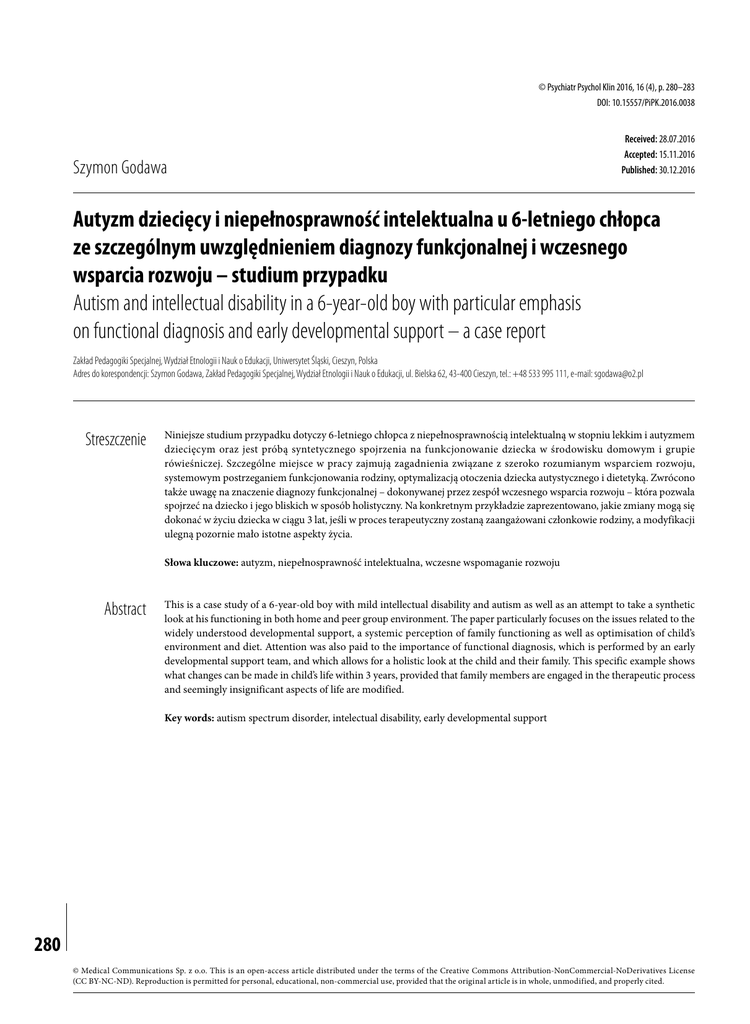 © Psychiatr Psychol Klin 2016, 16 (4), p. 280–283 DOI: 10.15557/PiPK.2016.0038 Szymon Godawa Received: 28.07.2016 Accepted: 15.11.2016 Published: 30.12.2016 Autyzm dziecięcy i niepełnosprawność intelektualna u 6-letniego chłopca ze szczególnym uwzględnieniem diagnozy funkcjonalnej i wczesnego wsparcia rozwoju – studium przypadku Autism and intellectual disability in a 6-year-old boy with particular emphasis on functional diagnosis and early developmental support – a case report Zakład Pedagogiki Specjalnej, Wydział Etnologii i Nauk o Edukacji, Uniwersytet Śląski, Cieszyn, Polska Adres do korespondencji: Szymon Godawa, Zakład Pedagogiki Specjalnej, Wydział Etnologii i Nauk o Edukacji, ul. Bielska 62, 43-400 Cieszyn, tel.: +48 533 995 111, e-mail: [email protected] Streszczenie Niniejsze studium przypadku dotyczy 6-letniego chłopca z niepełnosprawnością intelektualną w stopniu lekkim i autyzmem dziecięcym oraz jest próbą syntetycznego spojrzenia na funkcjonowanie dziecka w środowisku domowym i grupie rówieśniczej. Szczególne miejsce w pracy zajmują zagadnienia związane z szeroko rozumianym wsparciem rozwoju, systemowym postrzeganiem funkcjonowania rodziny, optymalizacją otoczenia dziecka autystycznego i dietetyką. Zwrócono także uwagę na znaczenie diagnozy funkcjonalnej – dokonywanej przez zespół wczesnego wsparcia rozwoju – która pozwala spojrzeć na dziecko i jego bliskich w sposób holistyczny. Na konkretnym przykładzie zaprezentowano, jakie zmiany mogą się dokonać w życiu dziecka w ciągu 3 lat, jeśli w proces terapeutyczny zostaną zaangażowani członkowie rodziny, a modyfikacji ulegną pozornie mało istotne aspekty życia. Słowa kluczowe: autyzm, niepełnosprawność intelektualna, wczesne wspomaganie rozwoju Abstract This is a case study of a 6-year-old boy with mild intellectual disability and autism as well as an attempt to take a synthetic look at his functioning in both home and peer group environment. The paper particularly focuses on the issues related to the widely understood developmental support, a systemic perception of family functioning as well as optimisation of child’s environment and diet. Attention was also paid to the importance of functional diagnosis, which is performed by an early developmental support team, and which allows for a holistic look at the child and their family. This specific example shows what changes can be made in child’s life within 3 years, provided that family members are engaged in the therapeutic process and seemingly insignificant aspects of life are modified. Key words: autism spectrum disorder, intelectual disability, early developmental support 280 © Medical Communications Sp. z o.o. This is an open-access article distributed under the terms of the Creative Commons Attribution-NonCommercial-NoDerivatives License (CC BY-NC-ND). Reproduction is permitted for personal, educational, non-commercial use, provided that the original article is in whole, unmodified, and properly cited. Autyzm dziecięcy i niepełnosprawność intelektualna u 6-letniego chłopca ze szczególnym uwzględnieniem diagnozy funkcjonalnej i wczesnego wsparcia rozwoju – studium przypadku Autism and intellectual disability in a 6-year-old boy with particular emphasis on functional diagnosis and early developmental support – a case report N WSTĘP iepełnosprawność sprzężona to współistnienie dwu lub więcej niepełnosprawności spowodowanych czynnikami egzo- i/lub endogennymi, które zaczynają oddziaływać na jednostkę w tym samym okresie albo niezależnie od siebie (Dykcik, 2006). Niniejsza praca dotyczy przypadku współwystępowania niepełnosprawności intelektualnej i autyzmu wczesnodziecięcego. Według ICD-10 niepełnosprawność intelektualna „jest stanem zahamowania lub niepełnego rozwoju umysłu, który charakteryzuje się głównie uszkodzeniem umiejętności ujawniających się w okresie rozwoju i składających się na ogólny poziom inteligencji – to jest zdolności poznawczych, mowy, ruchowych i społecznych” (Pużyński i Wciórka, 1998, s. 189). Z kolei w DSM-5 niepełnosprawność intelektualną określono jako zaburzenie cechujące się deficytem intelektualnym i zaburzeniami w zakresie funkcji przystosowawczych. W klasyfikacji podano następujące kryteria rozpoznania: • A – obniżenie zdolności umysłowych związanych m.in. ze zdobywaniem wiedzy w systemie szkolnym i poprzez doświadczenia, rozumowaniem, planowaniem, rozwiązywaniem problemów, wydawaniem osądów, jak również myśleniem abstrakcyjnym; • B – niedobory zdolności umysłowych osłabiające funkcjonowanie psychospołeczne danej osoby w porównaniu z innymi osobami w tym samym wieku, które wywodzą się z tego samego obszaru kulturowego; • C – początek w okresie rozwojowym (por. Bobińska i Gałecki, 2012; Morrison, 2016). W przypadku niepełnosprawności intelektualnej w stopniu lekkim dysfunkcje ujawniają się głównie w obszarze umiejętności szkolnych; niewielki odsetek osób nie nabywa umiejętności pisania i czytania. W dzieciństwie osoby takie zdecydowanie wolniej się uczą. Doświadczają przede wszystkim trudności związanych ze sferą poznawczą – w zakresie sądów krytycznych, abstrahowania, rozwiązywania złożonych problemów. Potrzebują pomocy w wykonywaniu stosunkowo prostych zadań, takich jak płacenie rachunków czy zakupy. Zdolności językowe i komunikacyjne nabywane są z opóźnieniem (por. Bobińska i Gałecki, 2012; Morrison, 2016). Etiologia organiczna rozpoznawana jest rzadko. Problemy interpersonalne i emocjonalne osób niepełnosprawnych intelektualnie w stopniu lekkim są zbliżone do problemów osób z przeciętnym ilorazem inteligencji (II). Wynik osiągany w testach inteligencji mieści się przeważnie – u 85% osób z omawianym typem niepełnosprawności – w przedziale od 50 do 70 (por. Bobińska i Gałecki, 2012; Morrison, 2016; Pużyński i Wci