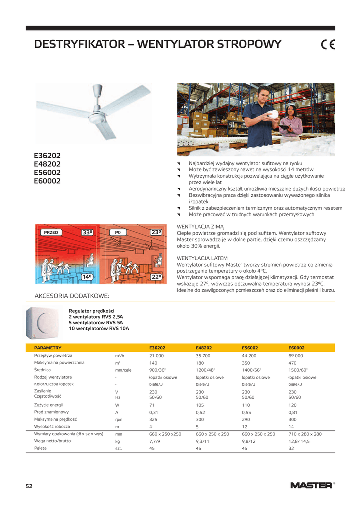 DESTRYFIKATOR – wentylator stropowy E36202 E48202 E56002 E60002 ^^ ^^ ^^ ^^ ^^ ^^ ^^ PRZED N ajbardziej wydajny wentylator sufitowy na rynku M oże być zawieszony nawet na wysokości 14 metrów Wytrzymała konstrukcja pozwalająca na ciągłe użytkowanie przez wiele lat A erodynamiczny kształt umożliwia mieszanie dużych ilości powietrza B ezwibracyjna praca dzięki zastosowaniu wyważonego silnika i łopatek S ilnik z zabezpieczeniem termicznym oraz automatycznym resetem M oże pracować w trudnych warunkach przemysłowych WENTYLACJA ZIMĄ Ciepłe powietrze gromadzi się pod sufitem. Wentylator sufitowy Master sprowadza je w dolne partie, dzięki czemu oszczędzamy około 30% energii. PO WENTYLACJA LATEM Wentylator sufitowy Master tworzy strumień powietrza co zmienia postrzeganie temperatury o około 4°C. Wentylator wspomaga pracę działającej klimatyzacji. Gdy termostat wskazuje 27°, wówczas odczuwalna temperatura wynosi 23°C. Idealne do zawilgoconych pomieszczeń oraz do eliminacji pleśni i kurzu. AKCESORIA DODATKOWE: Regulator prędkości 2 wentylatory RVS 2,5A 5 wentylatorów RVS 5A 10 wentylatorów RVS 10A PARAMETRY 52 E36202 E48202 E56002 E60002 Przepływ powietrza m3/h 21 000 35 700 44 200 69 000 Maksymalna powierzchnia m2 140 180 350 470 Średnica mm/cale 900/36" 1200/48" 1400/56" 1500/60" Rodzaj wentylatora - łopatki osiowe łopatki osiowe łopatki osiowe łopatki osiowe Kolor/Liczba łopatek - białe/3 białe/3 białe/3 białe/3 Zasilanie Częstotliwość V Hz 230 50/60 230 50/60 230 50/60 230 50/60 Zużycie energii W 71 105 110 120 Prąd znamionowy A 0,31 0,52 0,55 0,81 Maksymalna prędkość rpm 325 300 290 300 Wysokość robocza m 4 5 12 14 Wymiary opakowania (dł x sz x wys) mm 660 x 250 x250 660 x 250 x 250 660 x 250 x 250 710 x 280 x 280 Waga netto/brutto kg 7,7/9 9,3/11 9,8/12 12,8/ 14,5 Paleta szt. 45 45 45 32