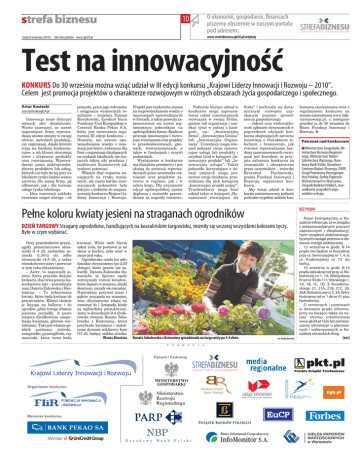 strefa biznesu O ekonomii, gospodarce, finansach piszemy obszernie w naszym portalu pod adresem: 10 www.strefabiznesu.gk24.pl/artykuly środa 8 września 2010 r. Głos Koszaliński www.gk24.pl Test na innowacyjność KONKURS Do 30 września można wziąć udział w III edycji konkursu „Krajowi Liderzy Innowacji i Rozwoju – 2010”. Celem jest promocja projektów o charakterze rozwojowym w różnych obszarach życia gospodarczego i społecznego. Artur Kostecki [email protected] Innowacja może dotyczyć różnych sfer działalności. Warto zauważyć, że nawet najmniejsze firmy wprowadzają istotne zmiany w swojej ofercie, metodach produkcji, czy organizacji, dzięki którym stają się bardziej konkurencyjne, a ich klienci otrzymują nowe i ulepszone produkty oraz rozwiązania. Wprowadzenie przez mikroprzedsiębiorcę produktów lub usług, których nie było do tej pory na lokalnym rynku będzie ważne zarówno dla samej firmy, jej odbiorców, jak i dla rozwoju całego rynku lokalnego. – Idea innowacji zakłada tworzenie czegoś nowego – od pomysłu, przez jego wdrożenie i osiągnięcie wymiernych rezultatów – wyjaśnia Tomasz Kierzkowski, dyrektor biura Funduszy Unii Europejskiej w Centrali Banku Pekao S.A, który jest mecenasem tegorocznej III edycji konkursu. – Niestety, nie zawsze upowszechnianie wiedzy o innowacji jest łatwe, zwłaszcza dla firm i organizacji działających na rynkach lokalnych, nie mających takiej siły przebicia i możliwości finansowych jak rynkowi potentaci. Właśnie chęć wsparcia istniejących na rynku mniejszych, ale często bardzo innowacyjnych podmiotów była jednym z bodźców do zorganizowania konkursu Krajowi Liderzy Innowacji i Rozwoju. Projekt jest znakomitą szansą na rozpowszechnienie wiedzy o innowacjach wprowadzanych w firmach, a także pozwala zaprezentować się nawet najmniejszym jednostkom na ogólnopolskim forum. Konkurs promuje innowacyjne i rozwojowe rozwiązania oraz projekty w przedsiębiorstwach, gminach, stowarzyszeniach, a także w fundacjach i innych podmiotach. Wyróżnienie w konkursie ma charakter prestiżowy i jest okazją do promocji wprowadzonych przez uczestnika rozwiązań oraz projektów zarówno w regionie, jak i w całym kraju. Dla zwycięzców edycji ogólnopolskiej oprócz dyplomu i statuetki przewidziane są nagrody rzeczowe. Podmioty biorące udział w konkursie mogą zaprezentować całość innowacyjnych rozwiązań w swojej firmie, gminie lub organizacji i uzyskać tytuł w jednej z kategorii, np.: „Innowacyjna firma”, „Innowacyjna Gmina” lub „Innowacyjna Organizacja”. Uczestnicy mogą również pokazać swoje innowacyjne usługi lub produkty i uzyskać tytuł w kategorii „Innowacyjny produkt” lub „Innowacyjna usługa”. Także jednostki korzystające z dotacji unijnych mogą promować swoje działania, przewidziano dla nich kategorię „Innowacyjny projekt unijny”. Przedsiębiorcy mogą brać udział także w kategorii „Dynamicznie rozwijająca się firma” i pochwalić się dynamicznym rozwojem uzyskanym pomimo spowolnienia gospodarczego. – Jakość oraz wielowątkowość zgłoszeń otrzymanych w poprzednich edycjach konkursu obejmujących zarówno innowacje o charakterze lokalnym i branżowym, jak również wprowadzanie bardziej zaawansowanych rozwiązań jest dowodem, że przyjęte założenia konkursu są zrozumiałe i akceptowane przez uczestników – twierdzi Krzysztof Duchnowski, prezes Fundacji Innowacji i Rozwoju, organizator konkursu. Aby wziąć udział w konkursie zainteresowany podmiot powinien wypełnić ankietę kon- DZIEŃ TARGOWY Stragany ogrodników, handlujących na koszalińskim targowisku, mieniły się wczoraj wszystkimi kolorami tęczy. Było w czym wybierać. kwitnąć. Wiele osób bierze także zioła, by postawić je na oknie w kuchni, żeby mieć w zimie pod ręką. Ogrodniczka miała też młodziutkie chryzantemy (po 2,50 złotego), które jeszcze nie zakwitły. Danuta Żukowska tłumaczyła, ze lipcowe upały wstrzymały rozwój kwiatów, które dopiero w sierpniu, dzięki deszczom, zaczęły się rozrastać. Największy przyrost masy i pąków przypada na wrzesień, więc chryzantemy zdążą się rozwinąć do 1 listopada, kiedy są najbardziej poszukiwane. Astry w doniczkach (3-4 zł) oferowała również Renata Sobolewska z Kretomina, która przybrała kwiatami i ozdobnymi dyniami wiklinowy kosz (15 zł), będący ozdobą stoiska. WANDA KONARSKA Renata Sobolewska z Kretomina sprzedawała na targu astry po 3-4 złote. P R O M O C J A Patronat nad konkursem d Ministerstwo Gospodarki, Ministerstwo Rozwoju Regionalnego, Ministerstwo Nauki i Szkolnictwa Wyższego, Narodowy Bank Polski, Narodowe Centrum Badań i Rozwoju, PARP, Urząd Patentowy Rzeczypospolitej Polskiej, Giełda Papierów Wartościowych w Warszawie, Związek Banków Polskich, marszałkowie wszystkich województw w kraju. BEZ PRĄDU Pełne koloru kwiaty jesieni na straganach ogrodników Oczy przechodniów przyciągały pomarańczowe aksamitki (1-4 zł), niebieskie żeniszki (1,50-2 zł), żółte słoneczniki (4-5 zł), a także różnokolorowe astry i pierwsze w tym roku chryzantemy. – Astry, to zapowiedź jesieni, która przyszła dużymi krokami, choć trwa jeszcze kalendarzowe lato – powiedziała nam Danuta Żukowska z Kretomina. – To jednoroczne kwiaty, które będą kwitnąć do przymrozków. Klienci chętnie je kupują na balkony i do ogrodów, gdzie trwają właśnie jesienne porządki. A puste miejsca działkowicze uzupełniają kwiatami, głównie wieloletnimi. Taki jest właśnie goździk pachnący, jeżówki, margaretki, pysznogłówki, czy marcinki, które teraz będą kursową zamieszczoną wraz z regulaminem konkursu na stronie internetowej www.liderzyinnowacji.pl, a następnie przesłać ją do 30 września do Biura Fundacji Innowacji i Rozwoju. Fot. Radek Brzostek Rejon Energetyczny w Koszalinie informuje, że w związku z przeprowadzanymi pracami napra