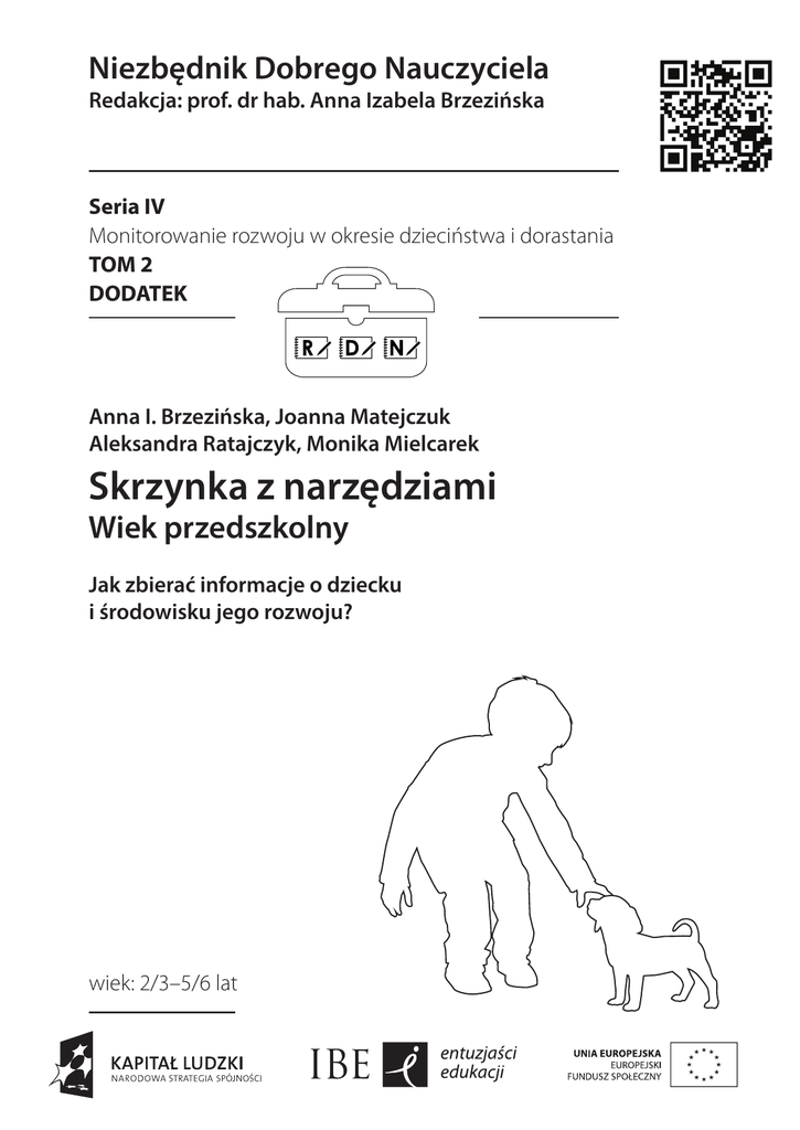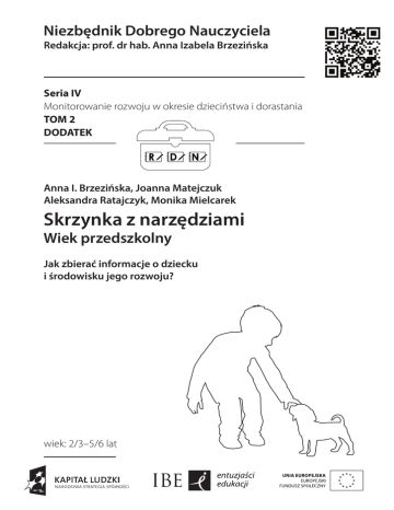 Niezbędnik Dobrego Nauczyciela Redakcja: prof. dr hab. Anna Izabela Brzezińska Seria IV Monitorowanie rozwoju w okresie dzieciństwa i dorastania TOM 2 DODATEK Anna I. Brzezińska, Joanna Matejczuk Aleksandra Ratajczyk, Monika Mielcarek Skrzynka z narzędziami Wiek przedszkolny Jak zbierać informacje o dziecku i środowisku jego rozwoju? wiek: 2/3–5/6 lat Niezbędnik Dobrego Nauczyciela Redakcja: prof. dr hab. Anna Izabela Brzezińska Seria IV Monitorowanie rozwoju w okresie dzieciństwa i dorastania TOM 2 DODATEK Anna I. Brzezińska, Joanna Matejczuk Aleksandra Ratajczyk, Monika Mielcarek Skrzynka z narzędziami Wiek przedszkolny Jak zbierać informacje o dziecku i środowisku jego rozwoju? wiek: 2/3–5/6 lat Redakcja serii Niezbędnik Dobrego Nauczyciela prof. dr hab. Anna Izabela Brzezińska Zespół Wczesnej Edukacji, Instytut Badań Edukacyjnych w Warszawie Opis narzędzi i zasad ich stosowania: Seria IV. Monitorowanie rozwoju w okresie dzieciństwa i dorastania TOM 1. Rozpoznanie zasobów dziecka i środowiska rozwoju. Wiek przedszkolny Autorzy: Aleksandra Ratajczyk, Monika Mielcarek Konsultacja merytoryczna tomu 2: dr Joanna Matejczuk Instytut Psychologii Uniwersytetu im. Adama Mickiewicza w Poznaniu Recenzent: prof. dr hab. Stanisław Kowalik Akademia Wychowania Fizycznego im. Eugeniusza Piaseckiego w Poznaniu Projekt okładki oraz koncepcja graficzna serii: Beata Czapska, Instytut Badań Edukacyjnych w Warszawie Wszystkie tomy i pakiet narzędzi gotowe do druku dostępne na stronie: http://eduentuzjasci.pl/dziecko-nastolatek Wydawca: Instytut Badań Edukacyjnych ul. Górczewska 8 01-180 Warszawa Tel. +48 22 241 71 00; www.ibe.edu.pl ©Copyright by Instytut Badań Edukacyjnych, Warszawa 2014 Publikacja opracowana w ramach projektu systemowego: Badanie jakości i efektywności edukacji oraz instytucjonalizacja zaplecza badawczego, współfinansowanego przez Unię Europejską ze środków Europejskiego Funduszu Społecznego, realizowanego przez Instytut Badań Edukacyjnych Wzór pasów łowickich wykorzystanych w publikacji zainspirowany ilustracją z książki: Świątkowska, J. (1953). Strój łowicki, seria „Atlas Polskich Strojów Ludowych”, t. 7, cz. IV Mazowsze i Sieradzkie, z. 2, Wrocław: Polskie Towarzystwo Ludoznawcze Egzemplarz bezpłatny Spis treści Wstęp 5 Najważniejsze… 7 I. Jakość środowiska domowego dziecka 9 1. 2. 3. 4. 5. 6. Kwestionariusz dla rodziców : Środowisko fizyczne w domu i wokół domu9 Kwestionariusz dla rodziców: Środowisko społeczne dziecka10 Kwestionariusz dla rodziców: Sposoby wychowywania dziecka11 Kwestionariusz dla rodziców: Domowa przestrzeń zabawy i nauki12 Kwestionariusz dla rodziców: Katalog zabawek13 Kwestionariusz dla rodziców: RAZEM15 II. Przebieg i efekty rozwoju dziecka 17 7. Tabela obserwacji dla rodziców i nauczycieli: Rozwój fizyczny dziecka17 8. Kwestionariusz dla rodziców i nauczycieli: Kompetencja komunikacyjna22 9. Kwestionariusz dla rodziców i nauczycieli: Regulacja emocji przez dziecko23 10. Kwestionariusz dla rodziców i nauczycieli: Termometr emocji dziecka24 11. Kwestionariusz dla rodziców i nauczycieli: Jak twórcze jest dziecko?26 12. Kwestionariusz dla rodziców i nauczycieli: Rozwój poznawczy dziecka27 13. Kwestionariusz dla rodziców i nauczycieli: Rozwój moralny dziecka28 14. Kwestionariusz dla rodziców i nauczycieli: Inicjatywa dziecka29 III. Jakość instytucjonalnego środowiska dziecka 31 15. Kwestionariusz dla nauczycieli: Środowisko fizyczne w przedszkolu31 16. Kwestionariusz dla nauczycieli: Klimat w przedszkolu32 17. Kwestionariusz dla nauczycieli: System organizacji przedszkola33 18. Kwestionariusz dla nauczycieli: RAZEM34 IV. Funkcjonowanie dziecka w instytucji 35 19. Kwestionariusz dla rodziców i nauczycieli: Strategie radzenia sobie przez dziecko w sytuacjach trudnych35 20. Kwestionariusz dla nauczycieli: Strategie adaptacji dziecka w przedszkolu36 21. Kwestionariusz dla nauczycieli: Dziecko w grupie37 22. Kwestionariusz dla rodziców: Zadowolenie dziecka z przedszkola38 23. Kwestionariusz dla rodziców: Aktywność i postępy dziecka w przedszkolu39 24. Kwestionariusz dla rodziców i nauczycieli: Dziecko w relacjach z dorosłymi40 25. Kwestionariusz dla rodziców i nauczycieli: Gotowość dziecka do pójścia do szkoły41 Dla kogo jest przeznaczony i kto wypełnia kwestionariusz ikonka związana z każdym tomem 2 wszystkich serii NDN 2/3–5/6 lat wiek dziecka, którego dotyczą przygotowane kwestionariusze Dla Rodziców (opiekunów prawnych dziecka) i innych domowników zajmujących się dzieckiem ikona w kolorze czarnym oznacza, że kwestionariusz jest przygotowany do wypełnienia przez rodziców/domowników Dla Dzieci (nastolatków) ikona w kolorze czarnym oznacza, że kwestionariusz jest przygotowany do wypełnienia przez dzieci (nastolatki) Dla Nauczycieli ikona w kolorze czarnym oznacza, że kwestionariusz jest przygotowany do wypełnienia przez nauczycieli (opiekunów) wersja przygotowana do wypełnienia dla dziecka (nastolatka) W tym tomie znajdują się kwestionariusze przeznaczone dla: Rodziców i Nauczycieli Rodziców Nauczycieli 2/3–5/6 lat Wstęp „Skrzynka z narzędziami”, jako pomoc w monitorowaniu rozwoju dziecka w wieku przedszkolnym, przygotowana została dla rodziców, dziadków i nauczycieli przedszkoli. Jest więc głównie przeznaczona dla wszystkich tych osób, które spędzają czas z dzieckiem i chcą wiedzieć więcej na temat jego aktualnego funkcjonowania i jego potrzeb, w większym stopniu rozumieć zachodzące dynamicznie zmiany, uczyć się tego, czemu i jak warto się przyglądać, by móc lepiej towarzyszyć mu w krokach, które stawia dziś i do których się przygotowuje. Z proponowanych narzędzi mogą również korzystać lekarze-pediatrzy, pielęgniarki, terapeuci, rehabilitanci czy pracownicy opieki społecznej, którzy chcieliby podpowiedzieć rodzicom, w jaki sposób poznawać i „uczyć” się swojego dziecka, na co zwrac