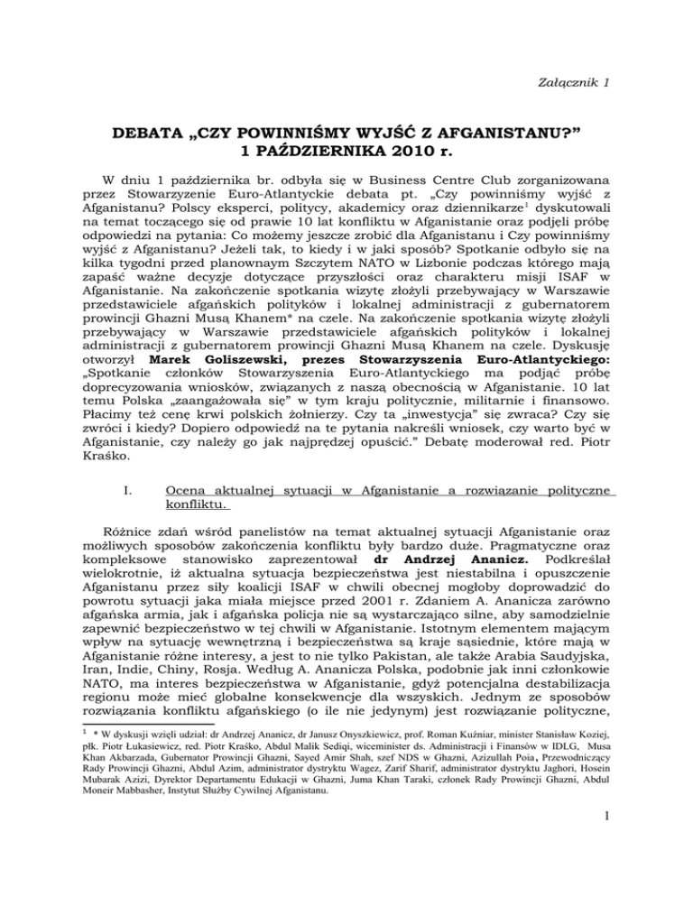 Załącznik 1 DEBATA „CZY POWINNIŚMY WYJŚĆ Z AFGANISTANU?” 1 PAŹDZIERNIKA 2010 r. W dniu 1 października br. odbyła się w Business Centre Club zorganizowana przez Stowarzyzenie Euro-Atlantyckie debata pt. „Czy powinniśmy wyjść z Afganistanu? Polscy eksperci, politycy, akademicy oraz dziennikarze 1 dyskutowali na temat toczącego się od prawie 10 lat konfliktu w Afganistanie oraz podjęli próbę odpowiedzi na pytania: Co możemy jeszcze zrobić dla Afganistanu i Czy powinniśmy wyjść z Afganistanu? Jeżeli tak, to kiedy i w jaki sposób? Spotkanie odbyło się na kilka tygodni przed planownaym Szczytem NATO w Lizbonie podczas którego mają zapaść ważne decyzje dotyczące przyszłości oraz charakteru misji ISAF w Afganistanie. Na zakończenie spotkania wizytę złożyli przebywający w Warszawie przedstawiciele afgańskich polityków i lokalnej administracji z gubernatorem prowincji Ghazni Musą Khanem* na czele. Na zakończenie spotkania wizytę złożyli przebywający w Warszawie przedstawiciele afgańskich polityków i lokalnej administracji z gubernatorem prowincji Ghazni Musą Khanem na czele. Dyskusję otworzył Marek Goliszewski, prezes Stowarzyszenia Euro-Atlantyckiego: „Spotkanie członków Stowarzyszenia Euro-Atlantyckiego ma podjąć próbę doprecyzowania wniosków, związanych z naszą obecnością w Afganistanie. 10 lat temu Polska „zaangażowała się” w tym kraju politycznie, militarnie i finansowo. Płacimy też cenę krwi polskich żołnierzy. Czy ta „inwestycja” się zwraca? Czy się zwróci i kiedy? Dopiero odpowiedź na te pytania nakreśli wniosek, czy warto być w Afganistanie, czy należy go jak najprędzej opuścić.” Debatę moderował red. Piotr Kraśko. I. Ocena aktualnej sytuacji w Afganistanie a rozwiązanie polityczne konfliktu. Różnice zdań wśród panelistów na temat aktualnej sytuacji Afganistanie oraz możliwych sposobów zakończenia konfliktu były bardzo duże. Pragmatyczne oraz kompleksowe stanowisko zaprezentował dr Andrzej Ananicz. Podkreślał wielokrotnie, iż aktualna sytuacja bezpieczeństwa jest niestabilna i opuszczenie Afganistanu przez siły koalicji ISAF w chwili obecnej mogłoby doprowadzić do powrotu sytuacji jaka miała miejsce przed 2001 r. Zdaniem A. Ananicza zarówno afgańska armia, jak i afgańska policja nie są wystarczająco silne, aby samodzielnie zapewnić bezpieczeństwo w tej chwili w Afganistanie. Istotnym elementem mającym wpływ na sytuację wewnętrzną i bezpieczeństwa są kraje sąsiednie, które mają w Afganistanie różne interesy, a jest to nie tylko Pakistan, ale także Arabia Saudyjska, Iran, Indie, Chiny, Rosja. Według A. Ananicza Polska, podobnie jak inni członkowie NATO, ma interes bezpieczeństwa w Afganistanie, gdyż potencjalna destabilizacja regionu może mieć globalne konsekwencje dla wszyskich. Jednym ze sposobów rozwiązania konfliktu afgańskiego (o ile nie jedynym) jest rozwiązanie polityczne, 1 * W dyskusji wzięli udział: dr Andrzej Ananicz, dr Janusz Onyszkiewicz, prof. Roman Kuźniar, minister Stanisław Koziej, płk. Piotr Łukasiewicz, red. Piotr Kraśko, Abdul Malik Sediqi, wiceminister ds. Administracji i Finansów w IDLG, Musa Khan Akbarzada, Gubernator Prowincji Ghazni, Sayed Amir Shah, szef NDS w Ghazni, Azizullah Poia , Przewodniczący Rady Prowincji Ghazni, Abdul Azim, administrator dystryktu Wagez, Zarif Sharif, administrator dystryktu Jaghori, Hosein Mubarak Azizi, Dyrektor Departamentu Edukacji w Ghazni, Juma Khan Taraki, członek Rady Prowincji Ghazni, Abdul Moneir Mabbasher, Instytut Służby Cywilnej Afganistanu. 1 polegające na dyskretnych negocjacjach z sąsiadami oraz z wewnętrzną opozycją. Bez zaangażowania, w szczególności Pakistanu trudno myśleć o pozytywnym rozwiązaniu dla Afganistanu. Ku rozwiązaniu politycznemu konfliktu afgańskiego skłaniał się także dr Janusz Onyszkiewicz podkreślając, iż aktualna sytuacja wewnętrzna w Afganistanie i w regionie jest skomplikowana. Jego zdaniem powrót Talibów jest możliwy, a szybki odwrót sił ISAF mógłby być szkodliwy. Podobnie jak A. Ananicz, J. Onyszkiewicz zwrócił uwagę na regionalny aspekt konfliktu afgańskiego. Podkreślił, iż bez rozwiązania kwestii pakistańskiej trudno myśleć o zakończeniu konfliktu w Afganistanie. Niezbędne są też rozmowy z pozostałymi partnerami w regionie, tzn, z Indiami, Chinam, Rosją. Sprzeczne niekiedy interesy niektórych sąsiadów Afganistanu powodują, iż nie wszyskim zależy na stworzeniu silnego Afganistanu. Niewątpliwie na silnym Afganistanie nie zależy ani Rosji, ani Pakistanowi. Częściowo rozwiązanie problemu afgańskigo leży także w porozumieniu się Indii oraz Pakistanu w sprawie Kaszmiru. Zdaniem pułkownika P. Łukasiewicza dzięki implementacji w 2009 r. nowej strategii generała Mc Chrystala sytuacja wewnętrzna i bezpieczeństwa w Afganistanie nabrała nowej dynamiki. Trudno mówić o sukcesie nowej koncepcji lecz daje ona szansę na poprawę sytaucji bezpieczeństwa, choć w długim okresie. Nowa strategia zakłada organizowanie państwa afgańskiego „od dołu” przy istotnym wsparciu finansowym, organizacyjnym, logistycznym oraz merytorycznym państw zaangażwanych w koalicję ISAF. Prowincjonalne Zespoły Odbudowy funkcjonujące w poszczególnych prowincjach mają za zadanie wspierać lokalną społeczność oraz władze w organizowaniu lokalnych struktur państwa afgańskiego, a także poprzez realizację bieżących projektów reagować na najbardziej pilne potrzeby społeczności afgańskiej. Nowa koncepcja zakłada także „strategię wyjścia”, która polega na stopniowym przekazywaniu odpowiedzialności za bezpieczeństwo poszczególnych prowincji Afgańczykom. Zdaniem płk. Łukasiewicza należy także powrócić do intensywnych działań dyplomatycznych i politycznych o których przez ostatnie kilka lat zapomniano, a które mogą w istotny sposób przyczynić się do znalezienia