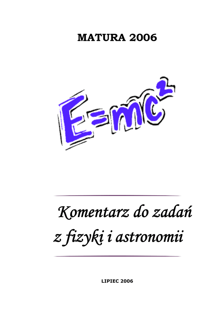 MATURA 2006 Komentarz do zadań z fizyki i astronomii LIPIEC 2006 Opracowano w Centralnej Komisji Egzaminacyjnej z wykorzystaniem materiałów otrzymanych z okręgowych komisji egzaminacyjnych Opracowano w Centralnej Komisji Egzaminacyjnej z wykorzystaniem materiałów otrzymanych z okręgowych komisji egzaminacyjnych 3 WSTĘP Egzamin maturalny z fizyki i astronomii miał formę pisemną i odbył się w całym kraju 17 maja 2006 r. Maturzyści mogli zdawać fizykę i astronomię jako przedmiot obowiązkowy lub dodatkowo wybrany. Fizyka i astronomia jako przedmiot obowiązkowy mogła być zdawana na poziomie podstawowym lub rozszerzonym. Egzamin na poziomie podstawowym trwał 120 minut i polegał na rozwiązaniu zadań z arkusza I. Po rozwiązaniu zadań w arkuszu I nastąpiła przerwa, po zakończeniu której do egzaminu przystąpili ci zdający, którzy podjęli decyzję zdawania fizyki i astronomii na poziomie rozszerzonym. W ciągu kolejnych 120 minut rozwiązywali zadania zawarte w arkuszu II. Warunkiem zdania egzaminu było uzyskanie co najmniej 30% punktów (15 punktów) możliwych do zdobycia na poziomie podstawowym. Nie określono progu zaliczenia dla poziomu rozszerzonego. Zdający, którzy wybrali fizykę i astronomię jako przedmiot dodatkowy zdawali egzamin na poziomie rozszerzonym. Egzamin trwał 240 minut i składał się z dwóch części, każda po 120 minut. W pierwszej części zdający rozwiązywał arkusz I, w drugiej części arkusz II. Były to te same arkusze, które rozwiązywali uczniowie zdający fizykę i astronomię jako przedmiot obowiązkowy. Dla przedmiotu zdawanego jako dodatkowy nie określono progu zaliczenia. W trakcie egzaminu zdający mogli korzystać z karty wybranych wzorów i stałych fizycznych, linijki oraz prostego kalkulatora. OPIS ARKUSZY EGZAMINACYJNYCH Zadania zawarte w arkuszach egzaminacyjnych sprawdzały umiejętności odpowiadające standardom wymagań: − wyjaśnianie i przewidywanie przebiegu zjawisk oraz wyjaśnianie zasady działań urządzeń technicznych na podstawie znanych zależności i praw, − obliczanie wielkości fizycznych z wykorzystaniem znanych zależności fizycznych, − stosowanie pojęć i praw fizycznych do rozwiązywania problemów praktycznych, − interpretowanie i przetwarzanie dane zapisane w postaci tekstu, tabeli, wykresu i schematu, − budowanie prostych modeli fizycznych i matematycznych do opisu zjawisk. Arkusze egzaminacyjne dostępne są na stronie CKE www.cke.edu.pl. 4 Opracowano w Centralnej Komisji Egzaminacyjnej z wykorzystaniem materiałów otrzymanych z okręgowych komisji egzaminacyjnych Arkusz I – poziom podstawowy Arkusz pierwszy (czas trwania egzaminu 120 minut) zawierał 21 zadań w tym 10 zadań zamkniętych, po 1 pkt za zadanie. Pozostałe zadania były zadaniami otwartymi rozszerzonej odpowiedzi, punktowanymi w skali od 0 do 5 pkt. Tematyka zadań egzaminacyjnych obejmowała większość treści z Podstawy programowej. Zadania dotyczyły zagadnień związanych z ruchem, światłem, termodynamiką, energią, fizyką jądrową oraz wyjaśnianiem przebiegu zjawisk i działania urządzeń technicznych. Zadanie 1. (1 pkt) Tomek wchodzi po schodach z parteru na piętro. Różnica wysokości między parterem a piętrem wynosi 3 m, a łączna długość dwóch odcinków schodów jest równa 6 m. Wektor całkowitego przemieszczenia Tomka ma wartość A. B. C. D. 3 m. 4,5 m. 6 m. 9 m. Sprawdzane umiejętności Umiejętność rozróżnienia drogi i przemieszczenia – standard I. 1. 1) (2). Łatwość zadania 0,82 – łatwe Typowe poprawne odpowiedzi zdających A Najczęściej powtarzające się błędy C Komentarz Zadanie łatwe – prawidłowe rozwiązanie zadania nie sprawiło zdającym większych trudności. Zadanie 2. (1 pkt) Wykres przedstawia zależność wartości prędkości od czasu dla ciała o masie 10 kg, spadającego w powietrzu z dużej wysokości. Analizując wykres można stwierdzić, że podczas pierwszych 15 sekund ruchu wartość siły oporu v, m/s 50 A. jest stała i wynosi 50 N. B. jest stała i wynosi 100 N. C. rośnie do maksymalnej wartości 50 N. D. rośnie do maksymalnej wartości 100 N. 5 10 15 20 t, s Opracowano w Centralnej Komisji Egzaminacyjnej z wykorzystaniem materiałów otrzymanych z okręgowych komisji egzaminacyjnych 5 Sprawdzane umiejętności Umiejętność określenia wzajemnej zależności pomiędzy siłami dla ruchu z oporem powietrza, na podstawie analizy wykresu zależności prędkości od czasu dla spadającego ciała – standard I. 1. 2) (3). Łatwość zadania 0,54 – umiarkowanie trudne Typowe poprawne odpowiedzi zdających D Najczęściej powtarzające się błędy A, C Komentarz Prawdopodobnie część zdających sugerowała się wartością 50 m/s znajdującą się przy osi prędkości, myląc ją z siłą 50 N, znajdującą się w dwu dystraktorach. Zadanie 3. (1 pkt) Rysunek przedstawia linie pola elektrostatycznego układu dwóch punktowych ładunków. Analiza rysunku pozwala stwierdzić, że ładunki są A. B. C. D. jednoimienne i |qA| > |qB| jednoimienne i |qA| < |qB| różnoimienne i |qA| > |qB| różnoimienne i |qA| < |qB| Sprawdzane umiejętności Ustalenie prawidłowego przebiegu (kształtu) linii pola elektrostatycznego wytworzonego przez różnoimienne ładunki punktowe – standard I. 1. 2) (6). Łatwość zadania 0,70 – łatwe Typowe poprawne odpowiedzi zdających B Najczęściej powtarzające się błędy D Komentarz Prawidłowe rozwiązanie zadania nie sprawiło zdającym większych trudności. 6 Opracowano w Centralnej Komisji Egzaminacyjnej z wykorzystaniem materiałów otrzymanych z okręgowych komisji egzaminacyjnych Zadanie 4. (1 pkt) 235 Jądro izotopu 92 U zawiera A. 235 neutronów. B. 327 nukleonów. C. 143 neutrony. D. 92 nukleony. Sprawdzane umiejętności Umiejętność ustalenia liczby neutronów w jądrze atomowym na podstawie znajomości liczby masowej i atomowej jądra – standard I. 1. 6) (5). Łatwość zada