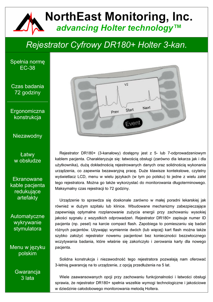 Rejestrator Cyfrowy DR180+ Holter 3-kan. Spełnia normę EC-38 Czas badania 72 godziny Ergonomiczna konstrukcja Niezawodny Łatwy w obsłudze Ekranowane kable pacjenta redukujące artefakty Automatyczne wykrywanie stymulatora Menu w języku polskim Rejestrator DR180+ (3-kanałowy) dostępny jest z 5- lub 7-odprowadzeniowym kablem pacjenta. Charakteryzuje się: łatwością obsługi (zarówno dla lekarza jak i dla użytkownika), dużą dokładnością rejestrowanych danych oraz solidnością wykonania urządzenia, co zapewnia bezawaryjną pracę. Duże klawisze kontekstowe, czytelny wyświetlacz LCD, menu w wielu językach (w tym po polsku) to jedne z wielu zalet tego rejestratora. Można go także wykorzystać do monitorowania długoterminowego. Maksymalny czas rejestracji to 72 godziny. Urządzenie to sprawdza się doskonale zarówno w małej poradni lekarskiej jak również w dużym szpitalu lub klinice. Wbudowane mechanizmy zabezpieczające zapewniają optymalne rozplanowanie zużycia energii przy zachowaniu wysokiej jakości sygnału z wszystkich odprowadzeń. Rejestrator DR180+ zapisuje numer ID pacjenta (np. pesel) na karcie compact flash. Zapobiega to pomieszaniu się badań różnych pacjentów. Używając wymiennie dwóch (lub więcej) kart flash można także szybko założyć rejestrator nowemu pacjentowi bez konieczności bezzwłocznego wczytywania badania, które właśnie się zakończyło i zerowania karty dla nowego pacjenta. Solidna konstrukcja i niezawodność tego rejestratora pozwalają nam oferować 3-letnią gwarancję na to urządzenie, z opcją przedłużenia na 5 lat. Gwarancja 3 lata Wiele zaawansowanych opcji przy zachowaniu funkcjonalności i łatwości obsługi sprawia, że rejestrator DR180+ spełnia wszelkie wymogi technologiczne i jakościowe w dziedzinie całodobowego monitorowania metodą Holtera. Charakterystyka DR180+ - Spełnia normę EC-38 Jest zgodny ze standardem ANSI/AAMI ED38-1994 "Ambulatory Electrocardiographs.”, w sekcjach mających tu zastosowanie - Ergonomiczna konstrukcja Duży, czytelny ekran LCD, klawisze kontekstowe (tzw. soft-keys) i bardzo prosty interfejs użytkownika czyni ten model wyjątkowo łatwym w obsłudze. Specyfikacja DR180+ - Udowodniona niezawodność Rejestrator DR180+ używany jest w tysiącach egzemplarzy na całym świecie. Czas rejestracji: - Ekranowane kable redukujące artefakty Ekranowany kabel pacjenta zapewnia lepszą integralność sygnału i eliminuje szumy. Nasze kable są doskonale ekranowane z tak dobraną opornością aby zapewnić większy poziom SNR niż jakiekolwiek inne kable dostępne na rynku. Niska cena tych kabli zapewnia szybki zwrot kosztów. - 72 godziny na bateriach litowych - 48 godzin na bateriach alkaicznych - 24 godziny na akumulatorach NiMH Zakres rejestracji: 0.05 - 70 Hz - Łatwy w obsłudze Intuicyjne menu (w jęz. polskim) sprawia, że obsługa urządzenia jest wyjątkowo łatwa, a przekazanie stosownych instrukcji pacjentowi zabiera niewiele czasu. Rozdzielczość: 12-bit, 12.50 µV/LSB Częstość próbkowania: - Podgląd sygnału EKG Możliwość podglądu dowolnego kanału sygnału EKG pacjenta, na wyświetlaczu rejestratora. 360 sampli na sekundę Wymiary: 12 cm x 7 cm x 2.5 cm - Automatyczne wykrywanie stymulatora Sprzeczne wymagania dotyczące czułości sygnału (szeroki zakres i wysoka częstotliwość próbkowania) oraz żywotności baterii zostały unikalnie rozwiązane aby zapewnić bardzo dokładną informację diagnostyczną. Waga: - 3-letnia fabryczna gwarancja Zasilanie: Konstrukcja urządzenia jest bardzo trwała. Ilość zwrotów gwarancyjnych jest tak mała, że możemy zaoferować najdłuższą gwarancję fabryczną na rynku, a następnie rozszerzyć ją do 5 lat lub dłużej. - 200 gramów z bateriami i kartą pamięci - 142 gramy bez baterii 2 baterie AA (alkaliczna, akumulator NiMH, lub litowa) Pojemność: - Maksymalizacja cyklów rejestracji dobrej jakości Sprawdzanie stanu naładowania baterii i poprawności rozmieszczenia elektrod przed rozpoczęciem rejestracji. Identyfikator pacjenta zapisywany na karcie flash uniemożliwia pomieszanie badań różnych pacjentów. - Całkowicie cyfrowa rejestracja Niezawodna technologia cyfrowa wydłuża czas bezawaryjnej pracy urządzenia i obniża koszty użytkowania. - Kompatybilny z oprogramowaniem NorthEast LX® Analysis (Holter LX Analysis, LX Event, LX Sleep) 32 MB - 1 GB karta compact flash Dystrybutor: Margot Medical Sp. z o.o. ul. Wąwozowa 18 lok. 154/155 02-796 Warszawa tel. +48 22 446 78 80 fax: +48 22 211 19 36 e-mail: [email protected] www.margotmedical.pl