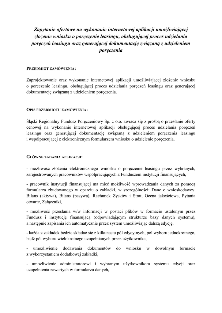 Zapytanie ofertowe na wykonanie internetowej aplikacji umożliwiającej złożenie wniosku o poręczenie leasingu, obsługującej proces udzielania poręczeń leasingu oraz generującej dokumentację związaną z udzieleniem poręczenia PRZEDMIOT ZAMÓWIENIA: Zaprojektowanie oraz wykonanie internetowej aplikacji umożliwiającej złożenie wniosku o poręczenie leasingu, obsługującej proces udzielania poręczeń leasingu oraz generującej dokumentację związaną z udzieleniem poręczenia. OPIS PRZEDMIOTU ZAMÓWIENIA: Śląski Regionalny Fundusz Poręczeniowy Sp. z o.o. zwraca się z prośbą o przesłanie oferty cenowej na wykonanie internetowej aplikacji obsługującej proces udzielania poręczeń leasingu oraz generującej dokumentację związaną z udzieleniem poręczenia leasingu i współpracującej z elektronicznym formularzem wniosku o udzielenie poręczenia. GŁÓWNE ZADANIA APLIKACJI: - możliwość złożenia elektronicznego wniosku o poręczenie leasingu przez wybranych, zarejestrowanych pracowników współpracujących z Funduszem instytucji finansujących, - pracownik instytucji finansującej ma mieć możliwość wprowadzania danych za pomocą formularza zbudowanego w oparciu o zakładki, w szczególności: Dane o wnioskodawcy, Bilans (aktywa), Bilans (pasywa), Rachunek Zysków i Strat, Ocena jakościowa, Pytania otwarte, Załączniki, - możliwość przesłania w/w informacji w postaci plików w formacie ustalonym przez Fundusz i instytucję finansującą (odpowiadającym strukturze bazy danych systemu), a następnie zapisania ich automatycznie przez system umożliwiając dalszą edycję, - każda z zakładek będzie składać się z kilkunastu pól edycyjnych, pól wyboru jednokrotnego, bądź pól wyboru wielokrotnego uzupełnianych przez użytkownika, - umożliwienie dodawania dokumentów z wykorzystaniem dodatkowej zakładki, do wniosku w dowolnym formacie - umożliwienie administratorowi i wybranym użytkownikom systemu edycji oraz uzupełnienia zawartych w formularzu danych, - umożliwienie administratorowi systemu pobierania przesłanych danych w formie uzupełnionego szablonu w formacie XLS, - pobranie danych analitycznych z bazy danych, - weryfikacja danych analitycznych zgromadzonych w bazie danych, - udostępnianie formularza uzupełnienia brakujących danych analitycznych dla Analityka, - utworzenie systemu rejestracji wniosków wraz z kartą wniosku, na której będą znajdowały się informacje o brakach w dokumentacji, wnioski z analizy prawnej, notatki z rozmów telefonicznych itp., - udostępnianie formularza uzupełniania uwag i komentarzy Analityka (z systemem podpowiedzi), - stworzenie kreatora zmiany statusów wniosku, - wynik analizy musi zostać zapisany w formacie Microsoft Excel 5, oraz musi istnieć możliwość jego pobrania w formacie PDF i EXCEL na szablonach odpowiednich dla Funduszu, - umożliwienie równoległego, lecz niezależnego procesowania wniosku przez pracowników Funduszu, - umożliwienie pracy zespołowej z podziałem na role, w tym zatwierdzanie wniosku do decyzji Zarządu oraz możliwość edytowania dodatkowych pól wniosku w zależności od osoby edytującej, - przydzielanie uprawnień do zarządzania wnioskami poszczególnym użytkownikom aplikacji, - rejestracja wszystkich akcji wykonywanych przez użytkowników z uwzględnieniem czasu ich wykonywania, nazwy użytkownika oraz z możliwością podglądu dla poszczególnych użytkowników, - pobieranie danych osobowych podmiotu aplikującego oraz zapisywanie ich z możliwością pobrania w formacie PDF i EXCEL, - generowanie kart decyzji podjętych przez Zarząd w formacie PDF z możliwością późniejszego wydruku, - przygotowywanie umów o udzielenie poręczenia, umów poręczenia, oświadczeń poręczyciela, weksli lub/i innych dokumentów – z możliwością późniejszej edycji, - przygotowywanie umów o udzielenie poręczenia, umów poręczenia, oświadczeń poręczyciela, weksli lub/i innych dokumentów po edycji do druku, - możliwość edycji szablonów dokumentów generowanych przez system, - powiadomienia mailowe oraz sms o wybranej grupie zdarzeń do wybranej grupy użytkowników, - archiwizowanie wniosków, danych, wyników analiz, sporządzonych dokumentów oraz załączników, - przygotowywanie faktur na podstawie danych wnioskodawcy wprowadzonych wcześniej do systemu oraz decyzji podjętych przez Zarząd wraz z możliwością późniejszego wydruku, - możliwość współpracy z systemami płatności online. PROCESOWY SCHEMAT DZIAŁANIA SYSTEMU: I Wprowadzanie danych przez pracowników instytucji finansującej - panel logowania dla pracowników współpracujących instytucji finansujących 1. Wprowadzanie danych: - pobieranie danych wnioskodawców w formacie przekazanym przez instytucje finansujące - załączanie plików wymaganych do analizy oraz dodatkowych w dowolnym formacie 2. Przeglądanie złożonych wniosków: - otrzymywanie informacji zwrotnej o stanie procedury o poręczenie i warunkach decyzyjnych ustalonych przez Fundusz realizacji wniosku II Analiza automatyczna - opracowanie algorytmu procedury oceny ryzyka na podstawie dostarczonej metodologii - automatyczne informowanie stron o wstępnej decyzji na postawie na przesłanych danych w oparciu o w/w algorytm III Obieg dokumentów w Funduszu 1. Poziom Administracja - pobieranie dokumentacji powiązanej z wnioskiem - przyjęcie wniosku do wstępnej weryfikacji formalno-prawnej - weryfikacja i zatwierdzanie załączonych dokumentów - przekazanie wniosku do kolejnych etapów związanych z procedurą udzielenia poręczenia IV Analiza i opiniowanie wniosku 1. Poziom Analityk - pobieranie dokumentacji powiązanej z wnioskiem - formularz aplikacji poręczeniowej w postaci: a) pól opisowych b) pól wyboru - generowanie analizy w oparciu o następujące grupy wskaźników: a) płynności finansowej b) zadłużenia c) rentowności d) dynamiki e) oraz innych zawartych w procedurze oceny ryzyka - formula