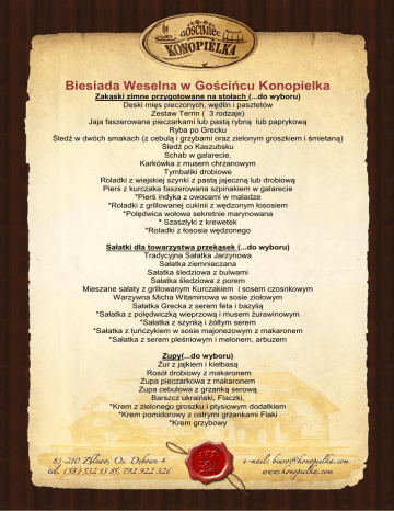Biesiada Weselna w Gościńcu Konopielka Zakąski zimne przygotowane na stołach (...do wyboru) Deski mięs pieczonych, wędlin i pasztetów Zestaw Terrin ( 3 rodzaje) Jaja faszerowane pieczarkami lub pastą rybną lub paprykową Ryba po Grecku Śledź w dwóch smakach (z cebulą i grzybami oraz zielonym groszkiem i śmietaną) Śledź po Kaszubsku Schab w galarecie, Karkówka z musem chrzanowym Tymbaliki drobiowe Roladki z wiejskiej szynki z pastą jajeczną lub drobiową Pierś z kurczaka faszerowana szpinakiem w galarecie *Pierś indyka z owocami w maladze *Roladki z grillowanej cukinii z wędzonym łososiem *Polędwica wołowa sekretnie marynowana * Szaszłyki z krewetek *Roladki z łososia wędzonego Sałatki dla towarzystwa przekąsek (...do wyboru) Tradycyjna Sałatka Jarzynowa Sałatka ziemniaczana Sałatka śledziowa z bulwami Sałatka śledziowa z porem Mieszane sałaty z grillowanym Kurczakiem i sosem czosnkowym Warzywna Micha Witaminowa w sosie ziołowym Sałatka Grecka z serem feta i bazylią *Sałatka z polędwiczką wieprzową i musem żurawinowym *Sałatka z szynką i żółtym serem *Sałatka z tuńczykiem w sosie majonezowym z makaronem *Sałatka z serem pleśniowym i melonem, arbuzem Zupy(...do wyboru) Żur z jajkiem i kiełbasą Rosół drobiowy z makaronem Zupa pieczarkowa z makaronem Zupa cebulowa z grzanką serową Barszcz ukraiński, Flaczki, *Krem z zielonego groszku i ptysiowym dodatkiem *Krem pomidorowy z ostrymi grzankami Flaki *Krem grzybowy Wielka uczta czyli podane w stoły mięsa (...do wyboru) Roladki z kurczaka faszerowane szpinakiem w sosie serowym De Volaille z masłem i pietruszką Grillowana pierś kurczaka Pierś kurczaka faszerowana warzywami Julienne Eskalopki z kurczaka w bekonie w sosie porowym Tradycyjny schabowy Kotlet szwajcarski z szynką i serem Kotlet pożarski Kaczka pieczona w sosie jabłkowym lub zurawinowym Polędwiczki wieprzowe w sosie pieprzowym lub grzybowy z boczkiem i porem Schab w sosie pieczeniowym Pieczeń karkowa w sosie myśliwskim Karkówka z boczkiem i korniszonem Zrazy wieprzowe w sosie własnym *Indyk z suszonymi pomidorami, porem i czerwonym pesto *Roladki z indyka faszerowane pieczarkami *Zrazy wołowe faszerowane ogórkiem, cebulą i boczkiem w sosie myśliwskim *Pieczeń wołowa w sosie grzybowym **Polędwica wellington z grzybami w śmietanie Lub dla niejedzących mięsa: Dorsz w sosie śmietanowym z warzywami Filet z mintaja w maślanym sosie *Sandacz w grzybowym Ragout *Łosoś w sosie koperkowym lub z morelami i czerwonym pieprzem **Schab z dzika z grzybami w śmietanie Dodatki do dań (...do wyboru) Ziemniaki pieczone, Ziemniaki z wody, Puree ziemniaczane, Szandar Kopytka kresowe, Kulki ziemniaczane, Kluski śląskie Warzywa z wody, Zestaw Surówek Buraczki ćwikłowe, Buraczki na ciepło Kapusta zasmażana Warzywne Ragout *Warzywa z grilla *Marchewka karmelizowana W stole również znajdziecie Dwa rodzaje pieczywa, Masełko Pikle z domowej spiżarni Chrzan, Ćwikła *Marynowane grzyby * Stół wiejski Smalec , ogórki i wiejski chleb Parada kiełbas i wędlin Podroby domowe Mięsa pieczone Mięsa wędzone Pasztety z drobiu i dziczyzny Pieczony boczek Szynka z nogą Tatar z polędwicy wołowej Tatar z łososia Domowe przetwory Deska serów w dostojnym towarzystwie Deska ryb wędzonych Stół słodkości (Dostępny przez cały wieczór bufet lub patery wstawiane w stoły) Ciasta domowe: Jabłecznik, Sernik, Piernik czekoladowy, Galaretki, Babeczki z owocami Ciasto marchewkowe, Wuzetka, torcik czekoladowy Kosze z owocami Wielkie szlacheckie łowy czyli Pieczone prosię lub Płonąca szynka lub Dzik Podane przez Szefa Kuchni Z dodatkami: (Kasza gryczana, buraczki zasmażane, kapusta staropolska) *A na osłodę dla Wszystkich Gości wspaniały Tort Weselny (w zależności od wybranej opcji cenowej – prosimy o kontakt w celu przedstawienia szczegółów oferty) Na podkurek Gościom damy: (...do wyboru) Udka z kurczaka lub Skrzydełka z kurczaka Fajitas z kurczaka Antrykot z kurczaka Karkówka z grilla lub pieczeń karkowa w sosie pieczeniowym Schab w sosie chrzanowym lub musem koperkowym Gulasz wieprzowy Żeberka w miodzie Bigos podlaski Pieczeń rzymska Późną porą dla zmęczonych wojażami (...do wyboru) Leczo, Flaczki Barszcz z krokietem lub pasztecikiem Barszcz szczawiowy z grzankami( sezonowo) Zupa Gulaszowa Gulasz segedyński z kapustą * Boeuf Strogonow *Zupa porowa z mięsem mielonym Napoje bezalkoholowe 5 rodzajów soków owocowych, woda mineralna bez/z gazem Napoje gazowane (cola, fanta, sprite) *Kwas chlebowy, *Napoje energetyczne Kawa, herbata Alkohol Wina domowe białe i czerwone Wódka Żubrówka czysta, Wyborowa, Żołądkowa, Krupnik Piwo z beczki Wino musujące na powitanie gości. Dodatkowe informacje: - opłata za dzieci w wieku do lat 3 nie jest pobierana - opłata za dzieci w wieku 4-10 lat 30%-50% ceny oraz 11-18 lat 60%-70% ceny Noclegi Dysponujemy również pokojami dla około 20-25osób Nocleg dla Pary młodej Gratis! Powyższe oferty zawierają Rezerwację całego Gościńca Obsługę kelnerską Dekoracje kwiatowe stołów i bufetów Specjalną dekoracje stołu Młodej Pary Chleb i lampka szampana na powitanie Młodej Pary Szampan dla wszystkich Gości Klimatyzację w cenie oferty, opłaty ZAIKS, Pozycję oznaczone gwiazdką (*) dotyczą oferty 220zł/osobę (**- 250zł/os) Przy rezerwacjach poniżej 70 osób pobieramy dodatkową opłatę za wynajęcie Sali Oferta nr 1– cena 175zł/osobę zawiera: - Szampan na powitanie Gości - Pieczywo, pikle i marynaty, smalec i masełko - Przekąski zimne – 4 do wyboru - Sałatki – 3 do wyboru - Zupa - 1 od wyboru podane w wazach - Danie główne - 3 do wyboru (podane na półmiskach)+ dodatki - Bufet deserowy przez cały wieczór (6 rodzajów ciast+ owoce) - Pieczone prosię lub szynka - IV ciepłe danie - 1 do wyboru podane na półmiskach - V ciepłe danie) - 1 do wyboru - Soki woda i napoje gazowane - 2 l./osobę - Kawa i herbata bez limit
