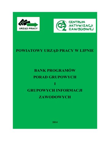 POWIATOWY URZĄD PRACY W LIPNIE BANK PROGRAMÓW PORAD GRUPOWYCH I GRUPOWYCH INFORMACJI ZAWODOWYCH 2014 GRUPOWA PORADA ZAWODOWA NAZWA I ZAKRES PORADY GRUPOWEJ "Odkrywanie własnych umiejętności i predyspozycji zawodowych" Zdefiniowanie własnego profilu zawodowego określenie alternatywnych scenariuszy działania klienta. CZAS TRWANIA PORADY GRUPOWEJ I SPOSÓB ORGANIZACJI - Zajęcia jednodniowe (3 godziny zegarowe). - Miejsce: PUP w Lipnie w Centrum Aktywizacji Zawodowej, ul. Okrzei 7, 87-600 Lipno, I piętro, sala 30. - Forma wykładu oraz warsztat z metodami aktywizacji. WYMAGANIA WSTĘPNE DLA UCZESTNIKÓW PORADY GRUPOWEJ Osoby zarejestrowane w Powiatowym Urzędzie Pracy w Lipnie, zainteresowane tematem porady zawodowej grupowej lub skierowane do udziału w poradzie zawodowej grupowej przez doradcę zawodowego (min 8 osób; max 16 osób). CEL PORADY GRUPOWEJ - wzmocnienie poczucia kompetencji i pewności siebie. - nabycie umiejętności kreowania własnego wizerunku. - nabycie umiejętności określania własnych umiejętności i predyspozycji zawodowych. PLAN NAUCZANIA I TREŚĆ PORADY GRUPOWEJ system wartości ocena własnej osoby własne umiejętności zainteresowania oraz zdolności predyspozycje zawodowe. WYKAZ LITERATURY ORAZ ŚRODKÓW I MATERIAŁÓW DYDAKTYCZNYCH Omówienie przedstawionych materiałów Mini wykład, dyskusja, pogadanka, praca indywidualna, burza mózgów, wyciąganie wniosków, ankieta ewaluacyjna. Pomoce dydaktyczne: Prezentacja multimedialna, opracowania własne, ulotki, foldery, literatura tematyczna, materiały dla uczestników. Literatura: - Biela A., (1990) Stres w pracy zawodowej. Wybrane zagadnienia. Redakcja Wydawnictw KUL, Lublin. - Broker S., (2003) Pokonać stres - życie na luzie. Wydawnictwo Lekarskie PZWL, Warszawa. Chapman E. N., (1995) Postawa życiowa Twoją najcenniejszą wartością. Studio EMKA, Warszawa. - Gunter S. (2000) , Pozytywne myślenie. Czy może szkodzić?. Gdańskie Wydawnictwo Psychologiczne, Gdańsk. - Ministerstwo Gospodarki, Pracy i Polityki Społecznej. Departament Rynku Pracy, Vademecum Dobrych Praktyk. Programy warsztatów dla absolwentów, studentów i uczniów. Centrum Informacji i Planowania Kariery Wojewódzkiego Urzędu Pracy w Łodzi. - Rostowski T., (2002) Kompetencje jako jakość zarządzania zasobami ludzkimi. W „Jakość zasobów firmy. Kultura, kompetencje, konkurencyjność” red. Sajkiewicz A., Wydawnictwo POLTRXT, Warszawa. - http://www.kluczdokariery.pl …………………………………………………………………………………………………... GRUPOWA PORADA ZAWODOWA NAZWA I ZAKRES PORADY GRUPOWEJ „Metody poszukiwania pracy – jak skutecznie znaleźć zatrudnienie” CZAS TRWANIA PORADY GRUPOWEJ I SPOSÓB ORGANIZACJI - Zajęcia jednodniowe (3 godziny zegarowe). - Miejsce: PUP w Lipnie w Centrum Aktywizacji Zawodowej, ul. Okrzei 7, 87-600 Lipno, I piętro, sala 30. - Forma wykładu oraz warsztat z metodami aktywizacji. WYMAGANIA WSTĘPNE DLA UCZESTNIKÓW PORADY GRUPOWEJ Osoby zarejestrowane w Powiatowym Urzędzie Pracy w Lipnie, zainteresowane tematem porady zawodowej grupowej lub skierowane do udziału w poradzie zawodowej grupowej przez doradcę zawodowego (min 8 osób; max 16 osób). CEL PORADY GRUPOWEJ - Nabycie umiejętności samodzielnego i aktywnego poruszania się po rynku pracy - Wzrost skuteczności poszukiwania pracy poprzez zdobycie wiedzy na temat rynku pracy i aktywnych metod poszukiwania zatrudnienia. PLAN NAUCZANIA I TREŚĆ PORADY GRUPOWEJ metody poszukiwania pracy rynek pracy jawny i ukryty umiejętność analizowania ogłoszeń określenie własnych predyspozycji i umiejętności zawodowych jak skutecznie zaprezentować się pracodawcy rodzaje najczęściej zadawanych pytań o co mogę spytać pracodawcę WYKAZ LITERATURY ORAZ ŚRODKÓW I MATERIAŁÓW DYDAKTYCZNYCH Prezentacja multimedialna, opracowania własne, ulotki, foldery, literatura tematyczna, materiały dla uczestników, ankieta ewaluacyjna. Literatura: - E. Pióro, P. Burdzy. Jak znaleźć pracę i nie zgubić po drodze siebie. Świat Książki. Warszawa 2010. - G. Prawelska-Skrzypek, K. Peter-Bombik. Model publicznych instytucji rynku pracy i ich praktyczne zastosowanie. Wydawnictwo Uniwersytetu Jagiellońskiego. Kraków 2007. - G. Talar. Jak znaleźć pracę w 30 dni. Wydawnictwo Studio Emka. Warszawa 2003. J. Rozmiarem. Praca jak szukać zmieniać utrzymywać. Vademecum pracownika. Wydawnictwo: Książka i Wiedza. Warszawa 2008, 2010. - J. Taylor, D. Hardy. Jak efektywnie poszukiwać pracy. Wykorzystywanie metody firmy Monster. Oficyna Ekonomiczne. Wolters Kluwer Polska. Kraków 2006. ………………………………………………………………………………………………. GRUPOWA PORADA ZAWODOWA NAZWA I ZAKRES PORADY GRUPOWEJ „Moja firma – jak zostać przedsiębiorcą” CZAS TRWANIA PORADY GRUPOWEJ I SPOSÓB ORGANIZACJI Zajęcia jednodniowe (2 godziny zegarowe), odbywające się w PUP w Lipnie w Centrum Aktywizacji Zawodowej, ul. Okrzei 7, 87-600 Lipno, I piętro, sala 30. Forma wykładu oraz warsztat z metodami aktywizacji. WYMAGANIA WSTĘPNE DLA UCZESTNIKÓW PORADY GRUPOWEJ Osoby zarejestrowane w Powiatowym Urzędzie Pracy w Lipnie, planujące założenie własnej działalności gospodarczej (max 16 osób). CEL PORADY GRUPOWEJ - Zapoznanie z pojęciem przedsiębiorczości, cechami sprzyjającymi i utrudniającymi działania przedsiębiorcze, dokonanie samooceny cech przedsiębiorczych, poznanie plusów i minusów prowadzenia własnego biznesu. - Poszerzenie wiedzy dotyczącej możliwości ubiegania się o środki na rozpoczęcie własnej działalności gospodarczej. - Zdobycie wiedzy na temat procesu rejestracji własnej firmy. - Zapoznanie uczestników z formami prawnymi prowadzenia działalności gospodarczej, i podstawowymi zagadnieniami związanymi z procesem prowadzenia firmy. - Formy wspierania pracodawców na rzecz wzrostu zatrudnienia w ramach usług i instrumen