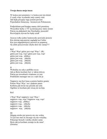 Twoja dusza moja tusza W końcu jest premiera i w końcu jest ten dzień Z szafy więc wychodzi mój czarny cień Jak będę przyjęty tego jestem pewien Pojechałem limuzyną - kremowym Polonezem Podjeżdżam pod knajpę mamy dziś premierę Wszystkie łachy z TV są dzisiaj przy mnie zerem Patrzę na plakatach Jan Niezbędny jeeeesttt! Rozwijajcie dywan bo będę szedł Jeszcze tylko jedno lustereczko powiedz przecie Kto dzisiaj najczęściej zaglądał na Ciebie Kto jest najpiękniejszy pozwól że popatrzę Oj szkło porysowane chyba dziś nie zasnę!!!! Ref: i Wąs! Wąs! gdzie jest wąs! Wąs ! (R) gdzie jest wąs, wąs! gdzie jest wąs, wąs! gdzie jest wąs, yhhhyy gdzie jest wąs, yhhyhy gdzie jest wąs, yhhyhy gdzie jest wąs, yhhyhy II Wchodzę na salę a publika ryczy Jak ja Boże kocham być w takiej dziczy Patrzę po towarkach wiadomo co jest Podchodzi menager ten co z ręki mi je Najpierw ma być kasa a potem będzie granie Potem Wąs! Wąs ! no i pięknie panie Kobieta jak kwiat nie przodu ani tyłu Ogólnie to kocham jak wiszą mi na kiju Ref: i Wąs! Wąs! najpierw wąs! Wąs ! najpierw wąs, wąs! Najpierw wąs, wąs! najpierw wąs, yhhhyy najpierw wąs, yhhyhy najpierw wąs, yhhyhy najpierw wąs, yhhyhy III Migają strobo już prawie nic nie widzę To już ten stan że niczego się nie wstydzę Pokazuje brzuch i nóżka chodzi sama Boże jak ja kocham zostaje tu do rana! (Dziura) sśij mi ucho sśij mi palec liż mi wąsy liż mi dziarę obliż usta napluj w twarz weź autograf on ma stać , stać , stać Ależ skąd, skąd bije dzwon, dzwon Tłusty ton, ton bije stąd, stąd, HEJ!!! Graj graj mój piękny Didżeju Niech Twój ton, ton niech poruszy wszystkich chwiejów A na majku bez kitu sto kilo dynamitu mistrz ceremonii i król cellulitu moja tusza twoja dusza Na parkiecie Was rozrusza Kto nie tańczy niech się zmusza Niech nam parkiet się rozrusza A towarki tylko z górnej półki Niech ciągną za sznurki niech wyłączą komórki Podnieście gumowce wysoko niech je widzę nie ma mowy o wstydzie kiedy trzęsę w tej remizie Aż Zaschło mi w gardle że odejmuje mowę kąciki mam białe jak wiórki kokosowe szczękościsk ściera moje zęby prowadźcie na zaplecze pokażcie którędy I Wąs, Wąs znowu Wąs, Wąs W rytmie wąs, wąs gdzie jest wąs, wąs, a towarki? Pląs, pląs a my pląs, pląs A my wciąż, wciąż z Tobą pląs, pląs, ggggooooooooooooooooodddddddddddddddddddd!!!!!