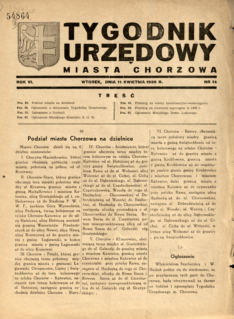 TYGODNIK URZĘDOWY W ROK VI. WTOREK, DNIA II KWIETNIA 1939 R. NR 14 TREŚĆ Poz. Poz. Poz. Poz. 89. Podział miasta na dzielnice. 90. Ogłoszenie o doręczeniu Tygodnika Urzędowego. 91. Ogłoszenie o licytacji. Poz. 93. Przetarg na roboty kanalizacyjno-wodociągowe. Poz. 94. Przetarg na stawienie zaprzęgów w 1939 r. Poz. 95. Ogłoszenie Miejskiego Domu Ludowego. 92. Ogłoszenie Miejskiego Komitetu F. O. N. 89 Podział miasta Chorzowa na dzielnice % IV. Chorzów - Śródmieście, której Miasto Chorzów dzieli się na 6 dzielnic mianowicie: granice obejmują teren między to rem kolejowym na szlaku ChorzówI. Chorzów-Maciejkowice, której granice obejmują, .północną część Katowice od ul. Hutniczej aż do gra miasta, położoną na północ od uli. nicy gminy Świętochłowice, poto kiem Rawa aż do ul Wolności, ulicę Kresowej; II. Chorzów-Stary, której granice Wolności aż do ul. Cichej, ul. Cichą obejmują tern miejski położony mię aż do ul. Dąbrowskiego, ul. Dąbrow dzy ul. Kresową, -granice miasta z skiego aż do ul. Częstochowskiej, ul. gminą Michałkowie® i miastem Ka Częstochowską, Wesołą do rogu ul. towice, ulicę Grażyńskiego od t. zw. Hajduckiej — Chorzowskiej, ul. DoBederowca aż do Stadionu P. W. i brodzieńską od Wesołej do Hajduc W. F., parkiem Góra Wyzwolenia, kiej, ul. Hajducką do Chorzowskiej, ulicę Parkową, torem kolejowym na następnie uliczkę prowadzącą z ul. szlaku Chorzów-Katowice aż do uli Chorzowskiej do Rowu Suesa, Ro cy Hutniczej, ulicę Hutniczą wschod wem Suesa do ul. Cmentarnej, po nią granicę Warsztatów Przetwór tem nowoprojektowaną ulicę od od czych aż do ulicy Nowej, ulicę Nową, Rowu Suesa do ul. Gałeczki róg ulicę Kruszcową aż do granicy mia Grażyńskiego; sta z gminą Łagiewniki, w końcu granicę miasta z gminą Łagiewniki aż do ulicy Kresowej. III Chorzów - Pniaki, której gra nice obejmują teren położony mię dzy granicą miasta z gminami: Ła giewniki, Chropaczów, Lipiny i Świę tochłowice aż do toru kolejowego na szlaku Chorzów - Katowice, na stępnie tym torem kolejowym aż do ul. Hutniczej, następnie granicą za chodnią dzielnicy Chorzów - Stary; VI. Chorzów - Batory, obejmują cą teren położony między granicą miasta z gminą Świętochłowic od to ru kolejowego na szlaku Chorzów Katowice aż do granicy miasta z gminą Kochłowice, granicą miasta z gminą Kochłowice aż do wspólne go punktu granic gminy Kochłowice z miastem Chorzowem Katowice, dalej i granicą miastem miasta z miastem Katowic aż do czyszczalni przy potoku Rawa, następnie ulicę Hajducką aż następnie ul. do ul. Chorzowskiej, Dobrodzieńską aż do rogu ui. Wesołe’, ul. Wesołą i Czę stochowską aż do ulicy Dąbrowskie go, ul. Dąbrowskiego aż do ul. Ci chej, ul. Cichą do ul. Wolności, w końcu ulicę Wolności aż do granicy z gminą Świętochłowice. V. Chorzów - Klimzowiec, obej mującą teren między ul. Grażyńskie . GO : , go do ul. Gałeczki do granicy miasta .. z miastem Katowice, granicę miasta Ogłoszenie Chorzowa z miastem Katowice aż do czyszczalni przy potoku Rawa, na Właścicielom Szarlocińca i W. stępnie ul. Hajducką do rogu ul. Cho Hajduk podaje się do wiadomości, że rzowskiej, uliczkę do Rowu Suesa i po przyłączeniu tych gmin do Cho Rowem Suesa aż do ul. Cmentar rzowa, będą otrzymywali za darmo nej, następnie nowoprojektowaną Ur licę do ul. Gałeczki róg ul. Grażyń co tydzień 1 egzemplarz Tygodnika Urzędowego m. Chorzowa. skiego; , 91 93 Licytacja Przetarg Dnia 21. i 22. kwietnia 1939 r. od będzie się od godz. 9-tej rano w Miejskim Zakładzie Zastawniczym przy ul. Bytomskiej 19 Licytacja nie* wykupionych zastawów do Nr 13.785 zastawionych w cżasie od 1. doi 31. października 1938 r. oraz niewykupionych zastawów wartościowych do Nr. 244a, zastawionych w czasie od 2. do 30 listopada 1938 r. Wykup po wyższych zastawów nastąpić musi najpóźniej do dnia 18. kwietnia 1939 r. Od dnia 19 kwietnia 1939 dolicza ne będą koszty licytacyjne. Przed li cytacją Zakład Zastawniczy jest zamknięty dla publiczności w dniu 20 kwietnia 1939 r. Magistrat miasta Chorzowa ogłasza niniejszym przetarg ofertowy na wy konanie robót kanalizacyjne - wodo ciągowych w gmachu Miejskich Za kładów Elektrycznych i Wodocią gowych w Chorzowie1. Otwarcie ofert nastąpi dnia 19 kwietnia 1939 r. o godz. 12 w Refe racie Budowlanym, pokój 139. Podkładki ofertowe wydaje Refe rat Budowlany, pokój 131. Magistrat Osiągnięte przy licytacji, odbytej dnia 21 i 22 marca 1939 r. nadwyżki za zlicytowane zastawy do Nr. 11.862 odebrać można za oddaniem kwitu zastawnego w przeciągu jed nego roku w kasie Zakładu Zastaw niczego, 92 Ogłoszenie Podaje się do publ. wiadomości, że utworzył się Miejski Komitet F. O. N., który wszelkie datki przyjmu je w Kasie Głównej Magistratu, Ra tusz pokój nr 61. , Magistrat ' / 94 ;: Przetarg Magistrat miasta Chorzowa ogła sza niniejszym pisemny przetarg ofertowy nieograniczony na stawie nie na okres jednego roku: a) zaprzęgów do przewozu materia łów za wynagrodzeniem akordo wym, b) zaprzęgów do przewozu ma,term łów za wynagrodzeniem dniów kowym. Podkładkiu ofertowe nabyć mo żna w Ref. Administracyjnym Wy działu Technicznego, pokój Nr 131, III piętro, za opłatą zł 2,— na za przęgi akordowe i zł 1,— na zaprzę gi dniówkowe, począwszy od dnia 17 kwietnia 1939 r. Oferty należy wnosić w nieprzej rzystych i zalakowanych kopertach bez nadruku firmowego i adresu na dawcy, zaopatrując koperty jedynie napisem: ,,oferta przetargowa na stawienie zaprzęgów akordowych" względnie ,,oferta przetargowa na stawienie zaprzęgów dniówkowych“. Oferty z terminem ważności do końca czerwca 1939 r. należy wnosić do Magistratu miasta Chorzowa — Ref. Administracyjny Wydziału Technicznego, pokój Nr 131, III pię tro do dnia 25 kwietnia godz, 11.50, w którym to terminie rozpocznie się przetarg. Magistratowi