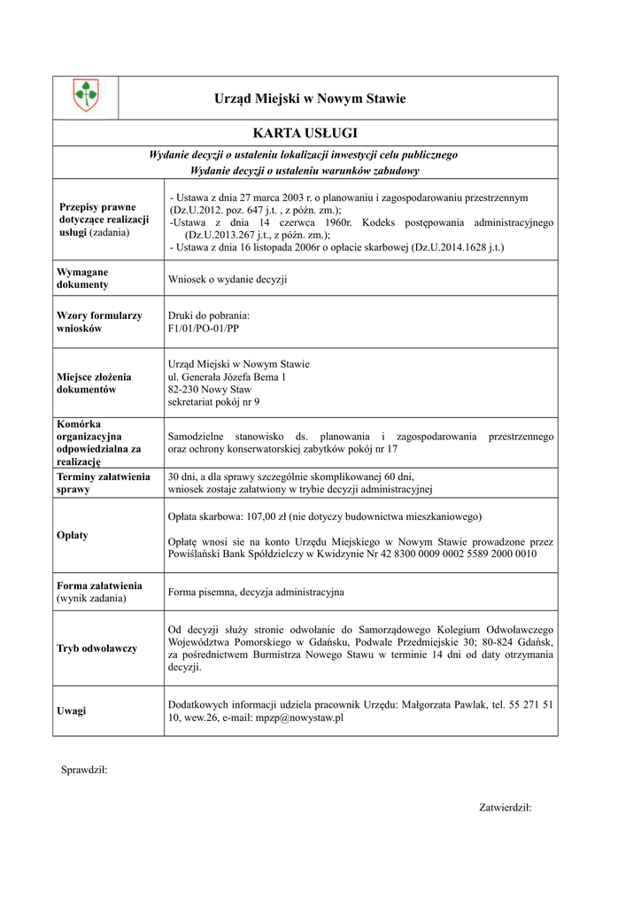 Urząd Miejski w Nowym Stawie KARTA USŁUGI