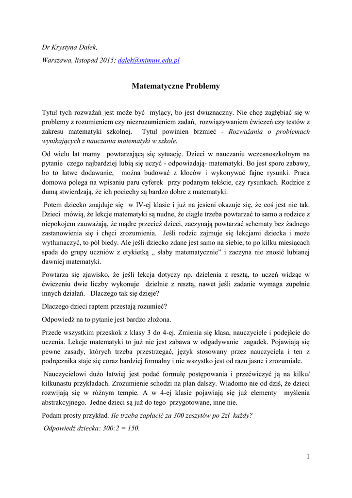 Dr Krystyna Dałek, Warszawa, listopad 2015; [email protected] Matematyczne Problemy Tytuł tych rozważań jest może być mylący, bo jest dwuznaczny. Nie chcę zagłębiać się w problemy z rozumieniem czy niezrozumieniem zadań, rozwiązywaniem ćwiczeń czy testów z zakresu matematyki szkolnej. Tytuł powinien brzmieć - Rozważania o problemach wynikających z nauczania matematyki w szkole. Od wielu lat mamy powtarzającą się sytuację. Dzieci w nauczaniu wczesnoszkolnym na pytanie czego najbardziej lubią się uczyć - odpowiadają- matematyki. Bo jest sporo zabawy, bo to łatwe dodawanie, można budować z kloców i wykonywać fajne rysunki. Praca domowa polega na wpisaniu paru cyferek przy podanym tekście, czy rysunkach. Rodzice z dumą stwierdzają, że ich pociechy są bardzo dobre z matematyki. Potem dziecko znajduje się w IV-ej klasie i już na jesieni okazuje się, że coś jest nie tak. Dzieci mówią, że lekcje matematyki są nudne, że ciągle trzeba powtarzać to samo a rodzice z niepokojem zauważają, że mądre przecież dzieci, zaczynają powtarzać schematy bez żadnego zastanowienia się i chęci zrozumienia. Jeśli rodzic zajmuje się lekcjami dziecka i może wytłumaczyć, to pół biedy. Ale jeśli dziecko zdane jest samo na siebie, to po kilku miesiącach spada do grupy uczniów z etykietką „ słaby matematycznie” i zaczyna nie znosić lubianej dawniej matematyki. Powtarza się zjawisko, że jeśli lekcja dotyczy np. dzielenia z resztą, to uczeń widząc w ćwiczeniu dwie liczby wykonuje dzielnie z resztą, nawet jeśli zadanie wymaga zupełnie innych działań. Dlaczego tak się dzieje? Dlaczego dzieci raptem przestają rozumieć? Odpowiedź na to pytanie jest bardzo złożona. Przede wszystkim przeskok z klasy 3 do 4-ej. Zmienia się klasa, nauczyciele i podejście do uczenia. Lekcje matematyki to już nie jest zabawa w odgadywanie zagadek. Pojawiają się pewne zasady, których trzeba przestrzegać, język stosowany przez nauczyciela i ten z podręcznika staje się coraz bardziej formalny i nie wszystko jest od razu jasne i zrozumiałe. Nauczycielowi dużo łatwiej jest podać formułę postępowania i przećwiczyć ją na kilku/ kilkunastu przykładach. Zrozumienie schodzi na plan dalszy. Wiadomo nie od dziś, że dzieci rozwijają się w różnym tempie. A w 4-ej klasie pojawiają się już elementy myślenia abstrakcyjnego. Jedne dzieci są już do tego przygotowane, inne nie. Podam prosty przykład. Ile trzeba zapłacić za 300 zeszytów po 2zł każdy? Odpowiedź dziecka: 300:2 = 150. 1 Zdumiony rodzic mówi- no dobrze, a gdybyś kupowała 2 zeszyty, to ile zapłacisz? A za 5 zeszytów ile, a za 10 zeszytów ile? Dziecko odpowiada prawidłowo, widać, że rozumie sytuację To dlaczego robisz coś innego przy 300 zeszytach? No, bo tak dużo, że trudno mi było pomyśleć. Jest to typowa sytuacja, z którą każdy z nas zetknął się niejednokrotnie. Przejście do dużych liczb jest przykładem sytuacji już z zasięgu abstrakcji. Zostawienie tego drobnego przecież problemu bez wyjaśnienia jest pierwszym krokiem na równi pochyłej do nierozumienia i nielubienia matematyki. A dalej jest tylko gorzej. Oczywiście niektórzy rodzice znajdują na to radę - albo staranny dozór w domu, albo korepetycje. I tu już zaczyna się źle dziać, bo korepetycje uczą dziecko bierności, oduczają kreatywności i poradzenia sobie samemu z problemem. Niedawno w jednym z ogólnopolskich dzienników przeczytałam, że ocenia się, że z różnych form korepetycji korzysta w Polsce ok. 70% uczniów. Obserwując od kilku lat różnorodną aktywność dotyczącą matematyki w szkole, widać, że jest bardzo duża oferta dla uczniów zdolnych, zainteresowanych matematyką. To dla nich są różne konkursy, imprezy matematyczne, specjalne seminaria i wyjazdy. Każda szkoła ma aspiracje, aby jak najwięcej ich uczniów brało udział w konkursach i zostawało laureatami lub przynajmniej wyróżnionymi uczestnikami. Natomiast uczniowie słabi matematycznie są często balastem, zaniżają poziom w statystykach szkolnych- ich uczenie jest trudne, absorbujące, męczące, więc często nauczyciel nie ma dla nich czasu. Są różne przyczyny złych wyników w matematyce – czasami osobnicze, czasami przyczyną są warunki domowe. Uczniowie uznawani za słabych na ogół źle przyjmują uczenie z naciskiem na formalny język a stosowanie formuł i algorytmów zazwyczaj wywołuje rutynowe działanie ale zabija rozumienie matematycznych pojęć i problemów. Dodatkowo, co podkreśla wielu pedagogów i metodyków nauczania matematyki –najlepsze wyniki daje nauczanie zindywidualizowane. Nauczyciele dobrze wiedzą, jak trudne jest to zadanie - w 30-osobowej klasie prowadzić nauczanie zindywidualizowane, czyli zadbać o uczniów na różnych poziomach zainteresowania, wiedzy i umiejętności. Pokazał to bardzo wyraźnie eksperyment pn. “ Karty dydaktyczne” prowadzony przeze mnie w latach 1991-93. Poza wieloma ciekawymi wynikami jeden chciałabym tu przywołać. Nauczanie zindywidualizowane wymaga specjalnych materiałów. A to kosztuje. Tak wiec mamy początek kłopotów z matematyką, na którą składa się zarówno to, że matematyka jednak jest trudna- przez działanie w sferze abstrakcji - jak i ogólnie mówiąc, jest niewłaściwie nauczana. A może problem leży w tym, że to nauczyciele są źle przygotowywani? Czy można polubić coś, co jest nudne? Można się wyuczyć na pamięć schematu postępowania w konkretnych, podobnych przypadkach, ale ile trzeba przerobić przykładów? I tu jest kolejny powód niechęci do uczenia się matematyki. Niestety, wiemy to wszyscy, że wiele schematów postępowań trzeba się wyuczyć- samo zrozumienie nie pomaga. Wzory trzeba znać. Tabliczkę mnożenia również- mimo 2 wszechobecnych kalkulatorów. Nauczyciele słusznie narzekają na brak czasu na ćwiczenia. Sprawne posługiwanie się formułami, algorytm