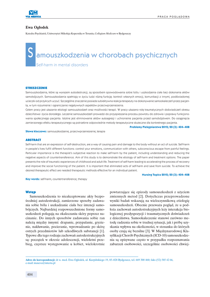 PRACA POGLĄDOWA Ewa Ogłodek Katedra Psychiatrii, Uniwersytet Mikołaja Kopernika w Toruniu, Collegium Medicum w Bydgoszczy S amouszkodzenia w chorobach psychicznych Self-harm in mental disorders STRESZCZENIE Samouszkodzenia, które są wyrazem autodestrukcji, są sposobem spowodowania sobie bólu i uszkodzenia ciała bez dokonania aktów samobójczych. Samouszkodzenia spełniają w życiu ludzi różną funkcję: kontroli własnych emocji, komunikacji z innymi, podświadomej ucieczki od przykrych uczuć. Szczególne znaczenie posiada subiektywna reakcja terapeuty na dokonywanie samookaleczeń przez pacjenta, w tym rozumienie i ograniczanie negatywnych aspektów przeciwprzeniesienia. Celem pracy jest ukazanie etiologii samouszkodzeń oraz możliwości terapii. W pracy ukazano rolę traumatycznych doświadczeń okresu dzieciństwa i życia dorosłego. Leczenie samouszkodzeń prowadzi do przyspieszania procesu powrotu do zdrowia i poprawy funkcjonowania społecznego pacjenta. Istotne jest eliminowanie aktów autoagresji i uchronienie pacjenta przed samobójstwem. Do osiągnięcia zamierzonego efektu terapeutycznego są potrzebne odpowiednie metody terapeutyczne skuteczne dla konkretnego pacjenta. Problemy Pielęgniarstwa 2012; 20 (3): 404–408 Słowa kluczowe: samouszkodzenie, przeciwprzeniesienie, terapia ABSTRACT Self-harm that are an expression of self-destruction, are a way of causing pain and damage to the body without an act of suicide. Self-harm in people’s lives fulfill different functions: control your emotions, communication with others, subconscious escape from painful feelings. Particular importance is the therapist’s subjective reaction to make self-harm by the patient, including understanding and reducing the negative aspects of countertransference. Aim of this study is to demonstrate the etiology of self-harm and treatment options. The paper presents the role of traumatic experiences of childhood and adult life. Treatment of self-harm leading to accelerating the process of recovery and improve the social functioning of the patient. It is important that eliminated acts of self-harm and save from suicide. To achieve the desired therapeutic effect are needed therapeutic methods effective for an individual patient. Nursing Topics 2012; 20 (3): 404–408 Key words: self-harm, countertransference, therapy Wstęp Samouszkodzenia to nieakceptowane akty bezpośredniej autodestrukcji, zamierzone sposoby zadawania sobie bólu i uszkadzanie ciała bez intencji samobójczych. Najbardziej rozpowszechnione formy samouszkodzeń polegają na okaleczaniu skóry poprzez nacinanie. Do innych sposobów zadawania sobie ran należą między innymi: drapanie, przypalanie, gryzienie, nakłuwanie, pocieranie, wprowadzanie po skórę ostrych przedmiotów lub szkodliwych substancji [1]. Typowe dla tego rodzaju zachowań autodestrukcyjnych są: początek w okresie adolescencji, wieloletni przebieg, częstsze występowanie u kobiet, wielokrotnie powtarzające się epizody samouszkodzeń z użyciem zmiennych metod [2]. Dotychczas przeprowadzone wyniki badań wskazują na wieloczynnikową etiologię samouszkodzeń. Obecnie przeważa pogląd, że u podłoża zachowań autodestrukcyjnych leży interakcja biologicznej predyspozycji i traumatycznych doświadczeń z dzieciństwa. Samookaleczenie stanowi zarówno metodę radzenia sobie w trudnej sytuacji, jak i próbę uzyskania wpływu na okoliczności, w stosunku do których osoby czują się bezsilne [3]. W Międzynarodowej Klasyfikacji Chorób Psychicznych (ICD-10) samouszkodzenia są opisywane często w przypadku rozpoznawania zaburzeń osobowości, szczególnie osobowości chwiej- Adres do korespondencji: dr n. med. Ewa Ogłodek, ul. Kurpińskiego 19, 85–028 Bydgoszcz, tel. 669 300 460; faks (52) 585 42 66, e-mail: [email protected] 404 Ewa Ogłodek, Samouszkodzenia nej emocjonalnie — typu borderline oraz osobowości dyssocjalnej [4]. Istnieje ponadto związek dokonywania samouszkodzeń z innymi zaburzeniami psychicznymi: zaburzeniami lękowymi, dysocjacyjnymi, depresyjnymi i zaburzeniami odżywiania. Kong w swoich badaniach obserwował współwystępowanie samookaleczeń z zaburzeniami odżywiania. Częstość występowania samookaleczeń wynosiła 13,6–42,1% u pacjentów z anoreksją oraz 27,8–68% u pacjentów z bulimią [5]. Ponadto obserwowano współistnienie występowania samookaleczeń i zaburzeń kompulsyjnych — trichotillomanii oraz kompulsyjnego obgryzania paznokci [6]. Cel pracy Celem pracy jest ukazanie etiologii samouszkodzeń oraz możliwości terapii. W pracy ukazano rolę traumatycznych doświadczeń okresu dzieciństwa i życia dorosłego. Relacja z ciałem Częstą konsekwencją traumatycznych, bolesnych przeżyć, zarówno w dzieciństwie, jak i w życiu dorosłym, związaną z samouszkodzeniami, jest poczucie obcości własnego ciała i nienawiść do niego. Ogromne znaczenie psychologiczne skóry i jej udziału w przeżywaniu przemocy, porzucenia, zaniedbania wskazuje na jej istotną rolę w samookaleczeniach. Poczucie obcości ciała spotyka się zwłaszcza u osób, które doświadczyły seksualnej i/lub fizycznej przemocy. Samookaleczenie jest wówczas atakiem na ciało. Mechanizmy psychologiczne związane z dokonywaniem samouszkodzeń są następujące: wzmocnienie poczucia autonomii i kontroli, odzyskanie poczucia rzeczywistości, potrzeba zaopiekowania się sobą, demonstrowanie lub wyrażanie własnych doświadczeń traumatycznych, chęć ponownego przeżywania urazu. Samouszkodzenia są związane z radzeniem sobie ze stresem: regulacją napięcia i lęku, radzeniem sobie z gniewem oraz spełniają funkcje związane z nawiązywaniem relacji. Ponadto samookaleczanie się spełnia funkcje związane z karaniem własnej osoby i pozostawaniem w roli ofiary. Doznawana przemoc często odbija się na skórze w postaci naruszenia jej ciągłości, spowodowania ran i bólu, których doświadcza osoba za jej pośrednictwem. 