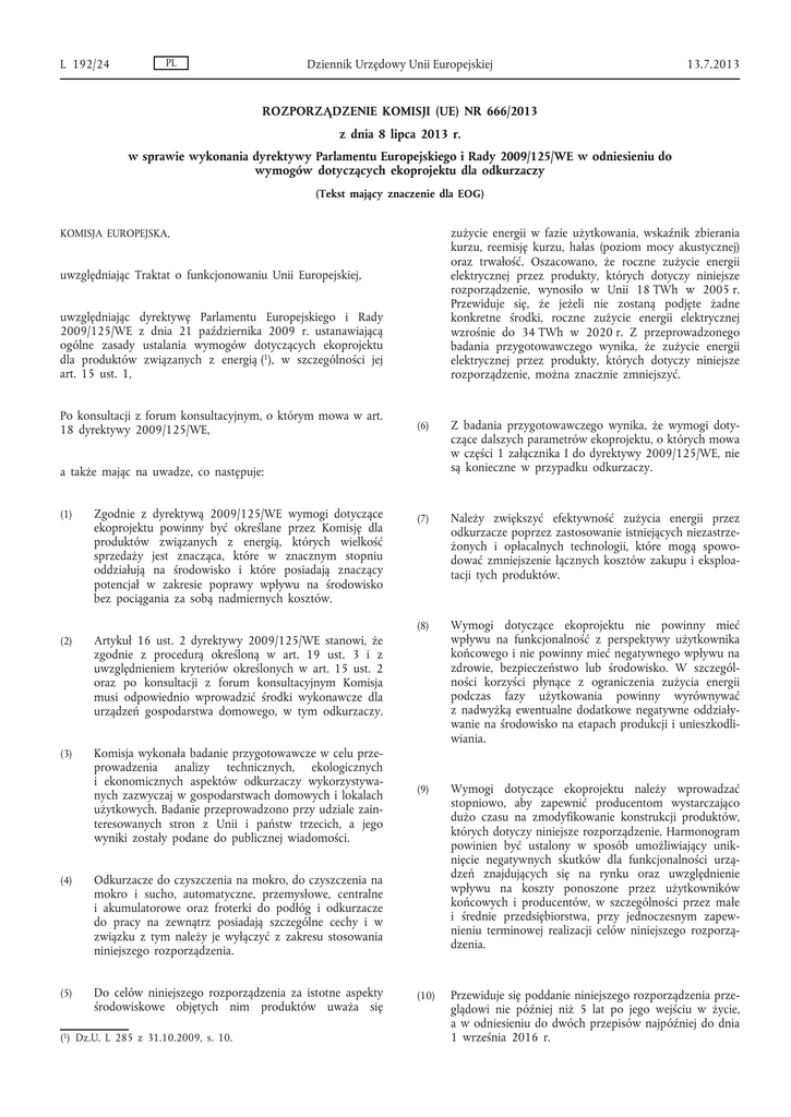 L 192/24 PL Dziennik Urzędowy Unii Europejskiej 13.7.2013 ROZPORZĄDZENIE KOMISJI (UE) NR 666/2013 z dnia 8 lipca 2013 r. w sprawie wykonania dyrektywy Parlamentu Europejskiego i Rady 2009/125/WE w odniesieniu do wymogów dotyczących ekoprojektu dla odkurzaczy (Tekst mający znaczenie dla EOG) zużycie energii w fazie użytkowania, wskaźnik zbierania kurzu, reemisję kurzu, hałas (poziom mocy akustycznej) oraz trwałość. Oszacowano, że roczne zużycie energii elektrycznej przez produkty, których dotyczy niniejsze rozporządzenie, wynosiło w Unii 18 TWh w 2005 r. Przewiduje się, że jeżeli nie zostaną podjęte żadne konkretne środki, roczne zużycie energii elektrycznej wzrośnie do 34 TWh w 2020 r. Z przeprowadzonego badania przygotowawczego wynika, że zużycie energii elektrycznej przez produkty, których dotyczy niniejsze rozporządzenie, można znacznie zmniejszyć. KOMISJA EUROPEJSKA, uwzględniając Traktat o funkcjonowaniu Unii Europejskiej, uwzględniając dyrektywę Parlamentu Europejskiego i Rady 2009/125/WE z dnia 21 października 2009 r. ustanawiającą ogólne zasady ustalania wymogów dotyczących ekoprojektu dla produktów związanych z energią (1), w szczególności jej art. 15 ust. 1, Po konsultacji z forum konsultacyjnym, o którym mowa w art. 18 dyrektywy 2009/125/WE, (6) Z badania przygotowawczego wynika, że wymogi doty czące dalszych parametrów ekoprojektu, o których mowa w części 1 załącznika I do dyrektywy 2009/125/WE, nie są konieczne w przypadku odkurzaczy. (7) Należy zwiększyć efektywność zużycia energii przez odkurzacze poprzez zastosowanie istniejących niezastrze żonych i opłacalnych technologii, które mogą spowo dować zmniejszenie łącznych kosztów zakupu i eksploa tacji tych produktów. (8) Wymogi dotyczące ekoprojektu nie powinny mieć wpływu na funkcjonalność z perspektywy użytkownika końcowego i nie powinny mieć negatywnego wpływu na zdrowie, bezpieczeństwo lub środowisko. W szczegól ności korzyści płynące z ograniczenia zużycia energii podczas fazy użytkowania powinny wyrównywać z nadwyżką ewentualne dodatkowe negatywne oddziały wanie na środowisko na etapach produkcji i unieszkodli wiania. (9) Wymogi dotyczące ekoprojektu należy wprowadzać stopniowo, aby zapewnić producentom wystarczająco dużo czasu na zmodyfikowanie konstrukcji produktów, których dotyczy niniejsze rozporządzenie. Harmonogram powinien być ustalony w sposób umożliwiający unik nięcie negatywnych skutków dla funkcjonalności urzą dzeń znajdujących się na rynku oraz uwzględnienie wpływu na koszty ponoszone przez użytkowników końcowych i producentów, w szczególności przez małe i średnie przedsiębiorstwa, przy jednoczesnym zapew nieniu terminowej realizacji celów niniejszego rozporzą dzenia. (10) Przewiduje się poddanie niniejszego rozporządzenia prze glądowi nie później niż 5 lat po jego wejściu w życie, a w odniesieniu do dwóch przepisów najpóźniej do dnia 1 września 2016 r. a także mając na uwadze, co następuje: (1) Zgodnie z dyrektywą 2009/125/WE wymogi dotyczące ekoprojektu powinny być określane przez Komisję dla produktów związanych z energią, których wielkość sprzedaży jest znacząca, które w znacznym stopniu oddziałują na środowisko i które posiadają znaczący potencjał w zakresie poprawy wpływu na środowisko bez pociągania za sobą nadmiernych kosztów. (2) Artykuł 16 ust. 2 dyrektywy 2009/125/WE stanowi, że zgodnie z procedurą określoną w art. 19 ust. 3 i z uwzględnieniem kryteriów określonych w art. 15 ust. 2 oraz po konsultacji z forum konsultacyjnym Komisja musi odpowiednio wprowadzić środki wykonawcze dla urządzeń gospodarstwa domowego, w tym odkurzaczy. (3) Komisja wykonała badanie przygotowawcze w celu prze prowadzenia analizy technicznych, ekologicznych i ekonomicznych aspektów odkurzaczy wykorzystywa nych zazwyczaj w gospodarstwach domowych i lokalach użytkowych. Badanie przeprowadzono przy udziale zain teresowanych stron z Unii i państw trzecich, a jego wyniki zostały podane do publicznej wiadomości. (4) Odkurzacze do czyszczenia na mokro, do czyszczenia na mokro i sucho, automatyczne, przemysłowe, centralne i akumulatorowe oraz froterki do podłóg i odkurzacze do pracy na zewnątrz posiadają szczególne cechy i w związku z tym należy je wyłączyć z zakresu stosowania niniejszego rozporządzenia. (5) Do celów niniejszego rozporządzenia za istotne aspekty środowiskowe objętych nim produktów uważa się (1) Dz.U. L 285 z 31.10.2009, s. 10. 13.7.2013 (11) (12) PL Dziennik Urzędowy Unii Europejskiej Rozporządzenie Komisji (UE) nr 327/2011 z dnia 30 marca 2011 r. w sprawie wykonania dyrektywy Parla mentu Europejskiego i Rady 2009/125/WE w odniesieniu do wymogów dotyczących ekoprojektu dla wentylatorów napędzanych silnikiem elektrycznym o poborze mocy od 125 W do 500 kW (1) należy zmienić, wyłączając z jego zakresu wentylatory stosowane w odkurzaczach, aby szczególne wymogi dotyczące ekoprojektu dla tych samych produktów nie były zawarte w dwóch odrębnych rozporządzeniach. Pomiary odpowiednich parametrów produktu należy przeprowadzać przy zastosowaniu wiarygodnych, dokładnych i powtarzalnych procedur pomiarowych z uwzględnieniem uznanych najnowocześniejszych metod pomiarowych, w tym, jeżeli są dostępne, zharmo nizowanych norm przyjętych przez europejskie organi zacje normalizacyjne wymienione w załączniku I do rozporządzenia Parlamentu Europejskiego i Rady (UE) nr 1025/2012 z dnia 25 października 2012 r. w sprawie normalizacji europejskiej (2). (13) Zgodnie z art. 8 dyrektywy 2009/125/WE w niniejszym rozporządzeniu należy określić mające zastosowanie procedury oceny zgodności. (14) Aby ułatwić przeprowadzanie kontroli zgodności, produ cenci powinni przekazywać informacje zawarte w doku mentacji technicznej, określonej w załącznikach IV i V do dyrektywy 2009/125/WE, w zakresie, 