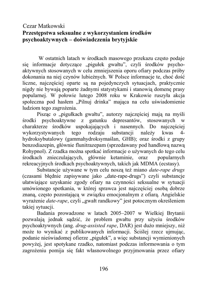 Cezar Matkowski Przestępstwa seksualne z wykorzystaniem środków psychoaktywnych – doświadczenia brytyjskie W ostatnich latach w środkach masowego przekazu często podaje się informacje dotyczące „pigułek gwałtu”, czyli środków psychoaktywnych stosowanych w celu zmniejszenia oporu ofiary podczas próby dokonania na niej czynów lubieżnych. W Polsce informacje te, choć dość liczne, najczęściej oparte są na pojedynczych sytuacjach, praktycznie nigdy nie bywają poparte żadnymi statystykami i stanowią domenę prasy popularnej. W połowie lutego 2008 roku w Krakowie ruszyła akcja społeczna pod hasłem „Pilnuj drinka” mająca na celu uświadomienie ludziom tego zagrożenia. Pisząc o „pigułkach gwałtu”, autorzy najczęściej mają na myśli środki psychoaktywne z gatunku depresantów, stosowanych w charakterze środków uspokajających i nasennych. Do najczęściej wykorzystywanych tego rodzaju substancji należy kwas 4hydroksybutalowy (gammahydroksymaślan, GHB); oraz środki z grupy benzodiazepin, głównie flunitrazepam (sprzedawany pod handlową nazwą Rohypnol). Z rzadka można spotkać informacje o używanych do tego celu środkach znieczulających, głównie ketaminie, oraz popularnych rekreacyjnych środkach psychoaktywnych, takich jak MDMA (ecstasy). Substancje używane w tym celu noszą też miano date-rape drugs (czasami błędnie zapisywane jako „date-rape-drugs”) czyli substancje ułatwiające uzyskanie zgody ofiary na czynności seksualne w sytuacji umówionego spotkania, w której sprawca jest najczęściej osobą dobrze znaną, często pozostającą w związku emocjonalnym z ofiarą. Angielskie wyrażenie date-rape, czyli „gwałt randkowy” jest potocznym określeniem takiej sytuacji. Badania prowadzone w latach 2005–2007 w Wielkiej Brytanii pozwalają jednak sądzić, że problem gwałtu przy użyciu środków psychoaktywnych (ang. drug-assisted rape, DAR) jest dużo mniejszy, niż może to wynikać z publikowanych informacji. Ściślej rzecz ujmując, podanie nieświadomej ofierze „pigułek”, a więc substancji wymienionych powyżej, jest spotykane rzadko, natomiast podczas informowania o tym zagrożeniu pomija się fakt własnowolnego przyjmowania przez ofiary 196 alkoholu bądź rekreacyjnych środków psychoaktywnych (MDMA, marihuany, kokainy), które, zdaniem badaczy, są głównym środkiem ułatwiającym potencjalnym sprawcom nakłonienie ofiar do czynności seksualnych567. Dlatego też w kryminologii brytyjskiej zaczęto rozróżniać gwałt przy wykorzystaniu narkotyków (DAR) i gwałt z pośrednictwem środków psychoaktywnych (ang. drug-facilitated rape, DFR), w którym to przypadku sprawca korzysta z faktu dobrowolnego upojenia czy też odurzenia ofiary w celu uzyskania od niej zgody na czynności seksualne568. Zarówno GHB, jak i flunitrazepam są środkami psychotropowymi należącymi, odpowiednio, do kategorii IV-P i III-P569. W roku 2006 Rohypnol został jednak wycofany z obrotu w Polsce. Zawyżenie skali występowania omawianych zjawisk może wynikać z faktu, iż GHB jest środkiem, który bywa przemycany i nielegalnie produkowany na terenie Polski, i czasami przechwyceniu ulegają spore transporty tej substancji. Najczęściej znajduje ona zastosowanie jako rekreacyjny środek odurzający bądź też bywa wykorzystywany w kulturystyce i sporcie jako substancja stymulująca wydzielanie hormonu wzrostu. Wbrew powszechnym opiniom, wykrycie flunitrazepamu w organizmie ofiary nie jest bardzo trudne, gdyż jest to środek dostępny wyłącznie na receptę i przepisywany w stosunkowo rzadkich przypadkach (a więc szansa, że był on świadomie lub przypadkowo przyjęty przez osobę nie leczącą się psychiatrycznie jest bardzo mała), a okres jego rozpadu wynosi około 24 godzin, metabolitów zaś – powyżej 100 godzin, więc jego ślady można wykryć nawet kilka dni po spożyciu. Sytuacja wygląda dużo gorzej w przypadku GHB, gdyż jest to substancja możliwa do wykrycia jedynie do 8 godzin (we krwi) i do 12 godzin (w moczu) po przyjęciu, a także rozkładana jest do dwutlenku węgla i wody, co uniemożliwia wykrycie faktu jej zażycia po podanym okresie. Do połowy pierwszej dekady XXI wieku nie prowadzono szerszych badań nad wykorzystaniem substancji psychoaktywnych w 567 568 569 A. Neame, Beyond “drink spiking”. Drug and alcohol facilitated sexual assault, Australian Centre for the Study of Sexual Assault, Szkolenie nr 2, listopad 2003. M. Horvath, J. Brown, The role of alcohol and drugs in rape, Medicine, Science and the Law (w przygotowaniu). Ustawa o zapobieganiu narkomanii z dnia 29 lipca 2005 r. (Dz.U. z 2005 r., nr 179, poz. 1485), załącznik 1. 197 przestępstwach seksualnych. W roku 2005 brytyjski Dział Nauk Sądowych (Forensic Sciences Service) postanowił zebrać i opracować te dane. W trakcie badań przeanalizowano około 1000 przypadków zgwałcenia, w których ofiary miały znajdować się pod wpływem środków psychoaktywnych. W 46% wszystkich przypadków ofiary znajdowały się pod wpływem alkoholu, w 34% przypadków zaś w ich organizmie znaleziono nielegalne narkotyki. Mimo to, jedynie w 2% wszystkich narkotyki te należały do grupy środków znieczulających lub usypiających co mogło dać podstawy do podejrzeń, iż zostały one podane nieświadomym tego ofiarom570. W badaniach przeprowadzonych w 2006 roku Miranda Horvath i Jennifer Brown autorki wzięły pod uwagę wszystkie zgłoszone przypadki zgwałcenia, do których doszło pomiędzy listopadem 1999 a listopadem 2004 roku w jednym z hrabstw w południowo-wschodniej Anglii (liczba ludności: 1.067.200 mieszkańców w roku 2004, poziom urbanizacji odpowiadający wartości przeciętnej dla całej Wielkiej Brytanii). W tym okresie dokonano w tym rejonie 1128 gwałtów lub innych przestępstw o charakterze seksualnym. W 93 przypadkach ofiary znajdowały się pod wpływem środków psychoaktywnych i/lub alkoholu. Wszystkie t