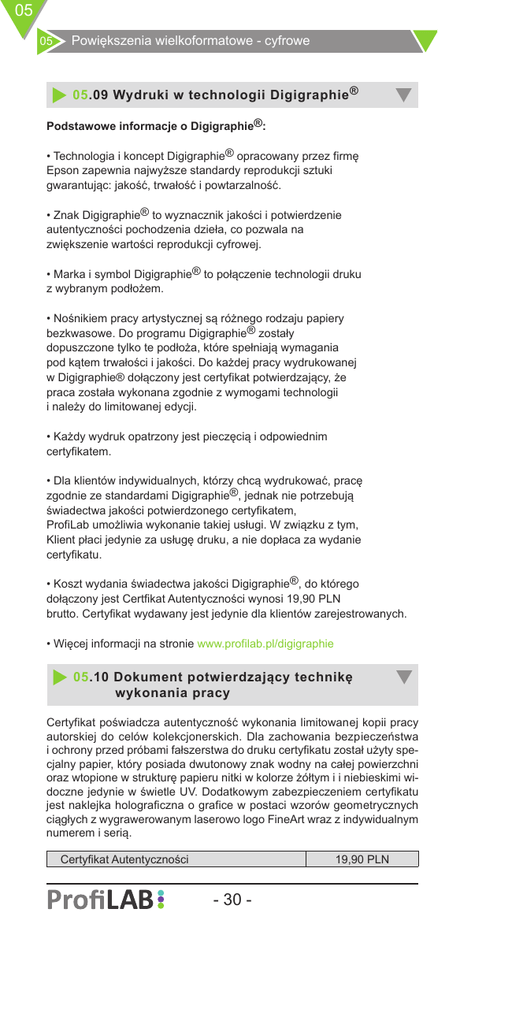 05 05 Powiększenia wielkoformatowe - cyfrowe 05.09 Wydruki w technologii Digigraphie ® Podstawowe informacje o Digigraphie®: • Technologia i koncept Digigraphie® opracowany przez firmę Epson zapewnia najwyższe standardy reprodukcji sztuki gwarantując: jakość, trwałość i powtarzalność. • Znak Digigraphie® to wyznacznik jakości i potwierdzenie autentyczności pochodzenia dzieła, co pozwala na zwiększenie wartości reprodukcji cyfrowej. • Marka i symbol Digigraphie® to połączenie technologii druku z wybranym podłożem. • Nośnikiem pracy artystycznej są różnego rodzaju papiery bezkwasowe. Do programu Digigraphie® zostały dopuszczone tylko te podłoża, które spełniają wymagania pod kątem trwałości i jakości. Do każdej pracy wydrukowanej w Digigraphie® dołączony jest certyfikat potwierdzający, że praca została wykonana zgodnie z wymogami technologii i należy do limitowanej edycji. • Każdy wydruk opatrzony jest pieczęcią i odpowiednim certyfikatem. • Dla klientów indywidualnych, którzy chcą wydrukować, pracę zgodnie ze standardami Digigraphie®, jednak nie potrzebują świadectwa jakości potwierdzonego certyfikatem, ProfiLab umożliwia wykonanie takiej usługi. W związku z tym, Klient płaci jedynie za usługę druku, a nie dopłaca za wydanie certyfikatu. • Koszt wydania świadectwa jakości Digigraphie®, do którego dołączony jest Certfikat Autentyczności wynosi 19,90 PLN brutto. Certyfikat wydawany jest jedynie dla klientów zarejestrowanych. • Więcej informacji na stronie www.profilab.pl/digigraphie 05.10 Dokument potwierdzający technikę wykonania pracy Certyfikat poświadcza autentyczność wykonania limitowanej kopii pracy autorskiej do celów kolekcjonerskich. Dla zachowania bezpieczeństwa i ochrony przed próbami fałszerstwa do druku certyfikatu został użyty specjalny papier, który posiada dwutonowy znak wodny na całej powierzchni oraz wtopione w strukturę papieru nitki w kolorze żółtym i i niebieskimi widoczne jedynie w świetle UV. Dodatkowym zabezpieczeniem certyfikatu jest naklejka holograficzna o grafice w postaci wzorów geometrycznych ciągłych z wygrawerowanym laserowo logo FineArt wraz z indywidualnym numerem i serią. Certyfikat Autentyczności 19,90 PLN - 30 - 05 05 Powiększenia wielkoformatowe - cyfrowe 05.09 Wydruki w technologii Digigraphie ® Wydruki w technologii Digigraphie® wykonywane są z powierzonego pliku przy wykorzystaniu urządzeń Epson z użyciem atramentów pigmentowych UltraChrome™ K3 na mediach spełniających surowe kryteria archiwalne. Koszt usługi druku liczony jest w metrach kwadratowych na podstawie wyliczenia łącznej powierzchni nakładu dla wybranego podłoża. Cena formatów do A-3 włącznie liczona jest za sztukę w/g stawki minimalki. W cenę podłoża wliczony jest koszt druku. Producent Canson Epson Hahnemühle Nazwa podłoża Cena brutto Cena brutto druku z druku z podłożem podłożem za za m² format A-3 Artist Canvas W&R Matte 390g 320,00 PLN 46,00 PLN Arches Aquarelle Rag 310g 345,00 PLN 40,00 PLN Arches Velin Museum Rag 315g * 345,00 PLN 45,00 PLN B F K Rives 310g * 360,00 PLN 45,00 PLN Edition Etching Rag 310g 325,00 PLN 40,00 PLN Rag Photographique 310g * 345,00 PLN 45,00 PLN WaterColor Paper Radiant White 190g 280,00 PLN 35,00 PLN PremierArt™ W&R Canvas Satin 350g 375,00 PLN 53,00 PLN Traditional Photo Paper 330g 375,00 PLN 45,00 PLN Albrecht Dürer 210g * 320,00 PLN 40,00 PLN Museum Etching 350g 375,00 PLN 45,00 PLN Photo Rag Baryta 315g 390,00 PLN 50,00 PLN Photo Rag Bright White 310g * 360,00 PLN 45,00 PLN Photo Rag Pearl 320g * 385,00 PLN 45,00 PLN Photo Rag Satin 310g * 375,00 PLN 45,00 PLN Photo Rag® 188g 320,00 PLN 40,00 PLN Photo Rag® 308g 360,00 PLN 45,00 PLN Torchon 285g 340,00 PLN 40,00 PLN William Turner 310g 365,00 PLN 45,00 PLN Przydatne informacje: Obróbka komputerowa - rozdział 03.09 Oprawa powiększeń - rozdział 06 Oprawa w ramy - rozdział 07 Podłoża archiwalne - rozdział 06.04 *podłoża sprowadzane na indywidualne zamówienie - 29 -