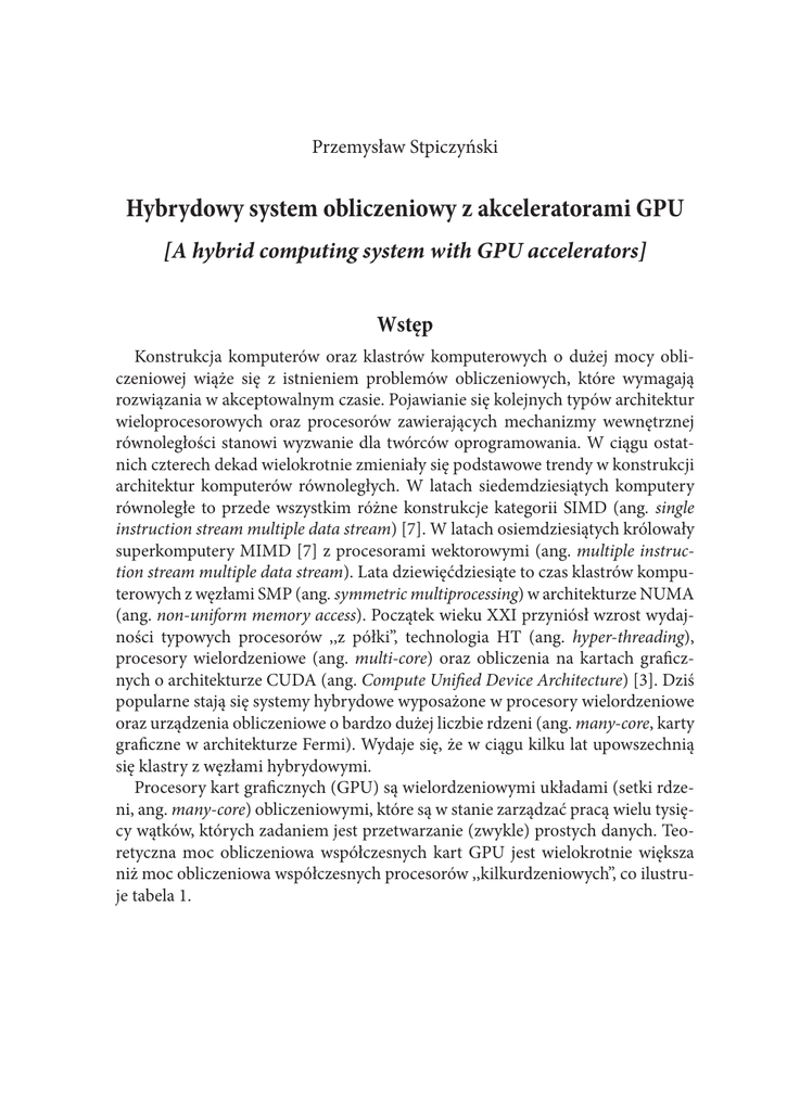 procesory wielordzeniowe (ang. multi-core) oraz obliczenia na kartach graficznych o architekturze CUDA (ang. Compute Unified Device Architecture) [3]. Dziś