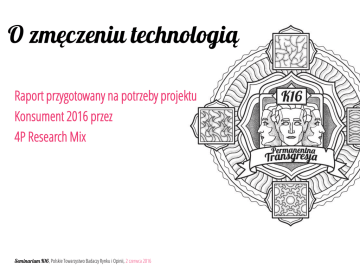 O zmęczeniu technologią Raport przygotowany na potrzeby projektu Konsument 2016 przez 4P Research Mix Seminarium K16, Polskie Towarzystwo Badaczy Rynku i Opinii, 2 czerwca 2016 Zmęczeni technologią? • Nowoczesna technologia komunikacyjna stała się oczywistym elementem naszego życia, coraz więcej czasu poświęcamy kolejnym cyfrowym ekranom. A najważniejszy z nich mamy praktycznie stale przy sobie. Oznacza to coraz więcej informacji, danych, bodźców, które do nas docierają. • W badaniach przeprowadzonych 5 lat temu zdiagnozowaliśmy pojawienie się w Polsce trendu, który nazwaliśmy WYLOGOWANI („trend polegający na ograniczaniu korzystania z nowoczesnych technologii cyfrowych, na lepszej kontroli sposobu korzystania z nich lub choćby szukaniu chwil wytchnienia, możliwości resetu, czy wręcz odtrucia (digital detox). To typowy kontrtrend, reakcja na potężny trend technologizacji i digitalizacji naszego życia” TeczkaTrendów 4P/2012). • A jak wygląda sytuacja dzisiaj? Narasta to zjawisko, czy może wręcz przeciwnie? Co jest najbardziej stresujące, co rodzi największe obawy, a czego nam najbardziej żal? Nota metodologiczna: populacja: Polscy internauci 15+; badanie CAWI: (1) kwiecień 2016, próba losowo-kwotowa N=567, zrealizowana nieodpłatnie na panelu Norstat; (2) lipiec 2011, próba losowa (ważona) N=550, pop-up’owa 2 Ile w sieci? liczba ludności w Polsce: 38,6 mln liczba aktywnych telefonów komórkowych: 58,84 mln (152%) dostęp do Internetu w Polsce ma 76% gospodarstw domowych (GUS) aktywni użytkownicy Internetu w Polsce: 25,7 mln (penetracja 67%) aktywni użytkownicy mediów społecznościowych: 14 mln aktywni mobilni użytkownicy mediów społecznościowych: 10 mln 51% stron internetowych, które odwiedzone zostały na smartfonach i tabletach Raport Digital in 2016, przygotowany przez „We are social media” 3 średni czas jaki Polacy spędzają codziennie w Internecie wynosi 4,4 godziny na komputerach, a 1,3 godziny na urządzeniach mobilnych Trendy i kontrendy – key words Digital/ information overload Digital clutter Digital obesity An always plugged-in-existence Digital loneliness/ digital friendship Oversharing FOMO – fear of missing out FOLO – fear of living offline Work/ life overlap Hyper-connected lifestyle 4 Technology fatigue De-teching Off lining Unplugging Digital detox Media abstinence JOMO – joy of missing out Slow life Co jest najbardziej uciążliwe? zmiana wbardzo stosunku lubdo 2011 r. „uciążliwe” raczej uciążliwe 2016 r. poczucie zalewu danych, bombardowania informacją 15% możliwości kontroli jakie stwarza technologia: np. śledzenie naszej aktywności przez innych przymus ciągłego reagowania na wysyłane do mnie wiadomości, zaproszenia, „zaczepki” itp. 17% 11% poczucie, że życie online zaczyna ograniczać moją aktywność offline 8% bycie stale dostępnym dla przełożonych, współpracowników, kontrahentów z pracy 9% nadmiar kontaktów, interakcji społecznych za pośrednictwem sieci 5% konieczność uczenia się obsługi coraz to nowych, skomplikowanych urządzeń, programów, aplikacji 4% bycie stale dostępnym dla rodziny, przyjaciół, znajomych 42% +9% 41% +4% 35% 28% 25% +1% +4% 0% 0% 21% 16% +5% 4% 15% +8% uciążliwe w tym bardzo uciążliwe „Na ile dane zagadnienia, związane z nowoczesną technologią komunikacyjną (Internet, komórki itp.) uważasz za uciążliwe…” 5 Polscy internauci 15+: 2016/N=567 2011/N=550 Stosunek do nowoczesnych technologii – entuzjazm i kontrola zmiana w stosunku do 2011r. „zgadzam się” 2016 r. Dzięki „technologii” działam dużo bardziej efektywnie, lepiej wykorzystują mój czas i możliwości 14% 55% Uważam, że moje życie bez nowoczesnych technologii 13% komunikacyjnych byłoby dużo mniej ciekawe i uboższe „Technologia” mnie kręci, 11% im więcej tym lepiej Staram się kontrolować ile czasu spędzam w sieci 45% zgadzam się 6 -21% -2% 39% 25% -15% 64% +7% w tym zdecydowanie się zgadzam „Poniżej znajdują się opinie różnych ludzi na temat ich stosunku do nowoczesnych technologii komunikacyjnych. Na ile zgadasz się z opinią …” Polscy internauci 15+: 2016/N=567 2011/N=550 Stosunek do nowoczesnych technologii – obawy zmiana w stosunku do 2011r. „zgadzam się” 2016 r. Chciał(a)bym móc spędzać więcej czasu komunikując się z przyjaciółmi i rodziną osobiście raczej niż poprzez „technologię” 26% 64% +4% Mam poczucie, że przez to relacje z ludźmi stają się płytsze, bardziej powierzchowne 25% 63% +4% Nowe technologie wypierają „namacalne” rzeczy, które lubię, np. książki, prasę, płyty – martwi mnie to 22% Marzę o długich wakacjach poza zasięgiem jakichkolwiek sieci „Technologia” często odciąga mnie od pracy (nauki) 24% 15% Coraz częściej czuję się 7% niewolnikiem „technologii” 49% 42% 33% +1% +3% -10% 0% Stały napływ informacji powoduje, że częściej mam trudności 8% z koncentracją, skupieniem się na wykonywanych zadaniach 29% -1% Z powodu nadużywania „sieci”, czuję nieraz, 9% że zaniedbuję moją rodzinę lub przyjaciół 29% -5% średnia liczba odczuwanych symptomów zmęczenia: 2016: 2,2 2011: 2,3 (wart. 0-8) 7 55% zgadzam się w tym zdecydowanie się zgadzam „Poniżej znajdują się opinie różnych ludzi na temat ich stosunku do nowoczesnych technologii komunikacyjnych. Na ile zgadasz się z opinią …” Polscy internauci 15+: 2016/N=567 2011/N=550 Samoocena czasu spędzanego w sieci 2016 r. nie wiem, trudno powiedzieć; 14% zbyt dużo czasu; 29% 2011 r. nie wiem, trudno powiedzieć; 8% odpowiednią ilość czasu; 53% odpowiednią ilość czasu; 40% zbyt dużo czasu; 44% zbyt mało czasu; 4% zbyt mało czasu; 8% „Czy we własnej ocenie spędzasz w sieci…” 8 Polscy internauci 15+: 2016/N=567 2011/N=550 Zmęczenie technologią* *czyli odczuwanie znużenia, irytacji, przeładowania informacyjnego, „przymusu” bycia ciągle podłącz