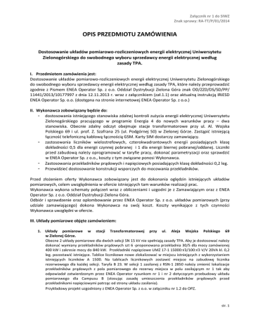 Załącznik nr 1 do SIWZ Znak sprawy: RA-TT/P/01/2014 OPIS PRZEDMIOTU ZAMÓWIENIA Dostosowanie układów pomiarowo-rozliczeniowych energii elektrycznej Uniwersytetu Zielonogórskiego do swobodnego wyboru sprzedawcy energii elektrycznej według zasady TPA. I. Przedmiotem zamówienia jest: Dostosowanie układów pomiarowo-rozliczeniowych energii elektrycznej Uniwersytetu Zielonogórskiego do swobodnego wyboru sprzedawcy energii elektrycznej według zasady TPA, które należy przeprowadzić zgodnie z Pismem ENEA Operator Sp. z o.o. Oddział Dystrybucji Zielona Góra znak OD/ZZD/DS/SD/PP/ 11441/2013/10177997 z dnia 12.11.2013 r. wraz z załącznikiem (zał.1.1) oraz aktualną instrukcją IRiESD ENEA Operator Sp. o.o. (dostępna na stronie internetowej ENEA Operator Sp. z o.o.) II. Wykonawca zobowiązany będzie do: - dostosowania istniejącego stanowiska zdalnej kontroli zużycia energii elektrycznej Uniwersytetu Zielonogórskiego pracującego w programie Energia 4 do nowych warunków pracy – dwa stanowiska. Obecnie zdalny odczyt obejmuje stacje transformatorowe przy ul. Al. Wojska Polskiego 69 i ul. prof. Z. Szafrana 25 (ul. Podgórnej 50) w Zielonej Górze. Zastąpić istniejącą łączność telefoniczną kablową łącznością GSM. Karty SIM dostarczy zamawiający. - zastosowania liczników wielostrefowych, czterokwadrantowych energii posiadających klasę dokładności 0,5 dla energii czynnej pobranej i 1 dla energii biernej pobranej/oddanej. Liczniki przed zabudową należy oprogramować w taryfie pracy, dokonać parametryzacji oraz sprawdzić w ENEA Operator Sp. z o.o., koszty z tym związane ponosi Wykonawca. - Zastosowania przekładników prądowych i napięciowych posiadających klasę dokładności 0,2 leg. - Przewidzieć dostosowanie konstrukcji wsporczych do mocowania przekładników. Przed złożeniem oferty Wykonawca zobowiązany jest do dokonania oględzin istniejących układów pomiarowych, celem uwzględnienia w ofercie istniejących tam warunków realizacji prac. Wykonawca wykona schematy połączeń wraz z obliczeniami i uzgodni je z Zamawiającym oraz z ENEA Operator Sp. z o.o. Oddział Dystrybucji Zielona Góra. Odbiór i sprawdzenie oraz oplombowanie przez ENEA Operator Sp. z o.o. układów pomiarowych (przy udziale zamawiającego) dokona Wykonawca na swój koszt. Koszty wynikające z tych czynności Wykonawca uwzględni w ofercie. III. Układy pomiarowe objęte zamówieniem: 1. Układy pomiarowe w stacji Transformatorowej przy ul. Aleja Wojska Polskiego 69 w Zielonej Górze. Obecne 2 układy pomiarowe dla dwóch sekcji SN 15 kV nie spełniają zasady TPA. Aby je dostosować należy dokonać wymiany przekładników prądowych szt 6 -proponowana przekładnia 30/5 dla mocy zamówionej 400 kW i zakresie mocy do 840 kW. Przekładniki napięciowe UMZ 17-1 15000:√3/100:√3 V/V 20VA kl. 0,2 leg. pozostawić istniejące. Tablice licznikowe nowe zlokalizować w miejscu istniejących z wykorzystaniem istniejących liczników A 1500. Na tablicach licznikowych zostawić miejsce na zabudowę licznika rezerwowego dla każdej sekcji. Taryfa B 23. W sekcji 1 zasilanej z RSN-1 2850 należy zmienić lokalizacje przekładników prądowych z pola pomiarowego do rezerwy miejsca w polu zasilającym nr 1 tak aby odpowiadał zatwierdzonym przez ENEA Operator rysunkom nr 1 i nr 2 dotyczącym przebudowy układu pomiarowego dla Campusu B (stosując zasadę umieszczenia przekładników prądowych przed przekładnikami napięciowymi patrząc od strony układu zasilania). Przykładowy projekt uzgodniony z ENEA Operator Sp. z o.o. w załączniku nr 1.2 do OPZ. str. 1 Załącznik nr 1 do SIWZ Znak sprawy: RA-TT/P/01/2014 OPIS PRZEDMIOTU ZAMÓWIENIA 2. Układy pomiarowe w stacji Transformatorowej przy ul. prof. Z. Szafrana 25 (Podgórna 50) w Zielonej Górze. Obecne 2 układy pomiarowe dla dwóch sekcji SN 15 kV zrealizowane w układzie pomiarowym Arona wraz z wyposażeniem nie spełniają zasady TPA. Należy je wymienić na nowe. Proponowane przekładniki prądowe o przekładni 40/5 dla mocy zamówionej 750 kW i zakresem mocy do 1121 kW. Nowe przekładniki prądowe wraz z istniejącą konstrukcja wsporczą przenieść na ścianki dzielące pola zasilające z polami pomiarowymi. Na tablicach licznikowych dla każdej sekcji zostawić miejsce na zabudowę licznika rezerwowego. Taryfa B 23. Przykładowy projekt uzgodniony z ENEA Operator Sp. z o.o. w załączniku nr 1.2 do OPZ. 3. Układ pomiarowy w stacji Transformatorowej przy ul. Ogrodowej 3 w Zielonej Górze Obecny układ pomiarowy dla rozdzielni SN 15 kV zrealizowany w układzie Arona wraz z wyposażeniem nie spełnia wymogów zasady TPA. Należy wymienić na nowy przez analogie do jw. Proponowane przekładniki prądowe o przekładni 10/5 dla mocy zamówionej 145 kW i zakresie mocy do 280 kW. Taryfa G11. Schemat rozdzielni SN 15 kV w załączniku nr 1.3 do OPZ. 4. Wyżej wymienione układy pomiarowe oraz układ pomiarowy w Parku Naukowo Technologicznym w Starym Kisielinie taryfa B21, mają być objęte dwoma zdalnymi punktami kontroli zużycia energii elektrycznej zlokalizowanymi u zamawiającego. Schemat blokowy układu pomiarowego PNT w Nowym Kisielinie w załączniku nr 1.4 do OPZ. Przed przystąpieniem do prac Wykonawca po uzgodnieniu schematów połączeń oraz obliczeń z Zamawiającym i ENEA Operator Sp. z o.o. Oddział Zielona Góra. Przedstawi Zamawiającemu do uzgodnienia z przynajmniej miesięcznym wyprzedzeniem harmonogram realizacji prac, który podlega również uzgodnieniu z ENEA Operator Sp. z o.o. Oddział Zielona Góra. W harmonogramie należy przewidzieć realizacje prac w dniach wolnych od zajęć dydaktycznych. Zamawiający poniesie koszty związane z przygotowaniem miejsca pracy, dopuszczeniem do pracy, nadzorem podczas pracy, likwidacją miejsca pracy oraz „załączenie pod napięcie”. Wyżej wymienione prace należy wykonać zgodnie z opisem i zachowaniem obowiązujących przepisów. str. 2 Załącznik nr 1 do SIW