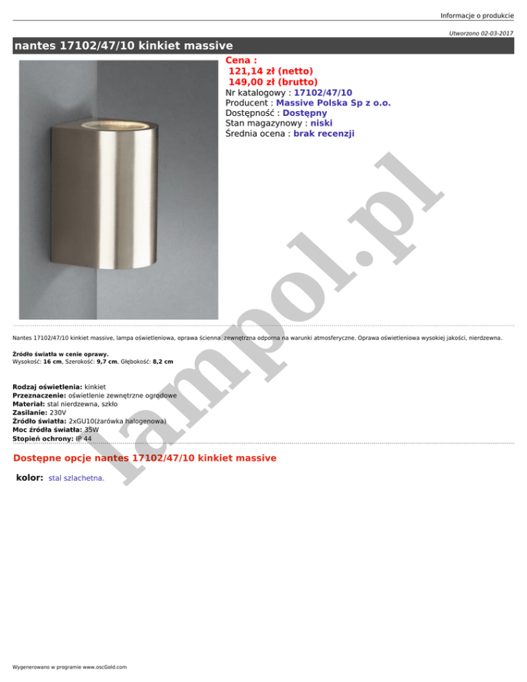 Informacje o produkcie Utworzono 02-03-2017 nantes 17102/47/10 kinkiet massive Cena : 121,14 zł (netto) 149,00 zł (brutto) m po l.p l Nr katalogowy : 17102/47/10 Producent : Massive Polska Sp z o.o. Dostępność : Dostępny Stan magazynowy : niski Średnia ocena : brak recenzji Nantes 17102/47/10 kinkiet massive, lampa oświetleniowa, oprawa ścienna zewnętrzna odporna na warunki atmosferyczne. Oprawa oświetleniowa wysokiej jakości, nierdzewna. Źródło światła w cenie oprawy. Wysokość: 16 cm, Szerokość: 9,7 cm, Głębokość: 8,2 cm la Rodzaj oświetlenia: kinkiet Przeznaczenie: oświetlenie zewnętrzne ogrodowe Materiał: stal nierdzewna, szkło Zasilanie: 230V Źródło światła: 2xGU10(żarówka halogenowa) Moc źródła światła: 35W Stopień ochrony: IP 44 Dostępne opcje nantes 17102/47/10 kinkiet massive kolor: stal szlachetna. Wygenerowano w programie www.oscGold.com