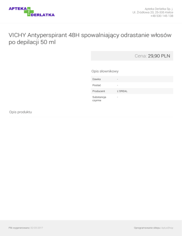 Apteka Derlatka Sp. j. Ul. Źródłowa 20, 25-335 Kielce +48 530 145 138 VICHY Antyperspirant 48H spowalniający odrastanie włosów po depilacji 50 ml Cena: 29,90 PLN Opis słownikowy Dawka - Postać - Producent L'OREAL Substancja czynna - Opis produktu Plik wygenerowano: 02-03-2017 Powered by TCPDF (www.tcpdf.org) Oprogramowanie sklepu: AptusShop