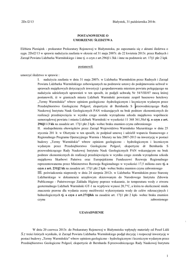 Białystok, 31 października 2014r. 2Ds l2/13 POSTANOWIENIE O UMORZENIU ŚLEDZTWA Elżbieta Pieniążek - prokurator Prokuratury Rejonowej w Białymstoku, po zapoznaniu się z aktami śledztwa o sygn. 2Dsl2/13 w sprawie nadużycia zaufania w okresie od 31 maja 2007r. do 22 kwietnia 2013r. przez Radnych i Zarząd Powiatu Lidzbarka Warmińskiego i inne tj. o czyn z art.296§l i 3kk i inne na podstawie art. 17§1 pkt 2 kpk postanowił: umorzyć śledztwo w sprawie : I. nadużycia zaufania w dniu 31 maja 2007r. w Lidzbarku Warmińskim przez Radnych i Zarząd Powiatu Lidzbarka Warmińskiego zobowiązanych na podstawie ustawy do podejmowania uchwał w sprawach majątkowych dotyczących inwestycji i gospodarowania mieniem powiatu polegającego na nadużyciu udzielonych uprawnień w ten sposób, że podjęli uchwałą Nr 54/VIII/07 mocą której postanowili, iż w granicach miasta Lidzbark Warmiński powstanie zespół basenowo hotelowy „Termy Warmińskie" wbrew opiniom geologiczno -hydrologicznym i leczniczym wydanym przez Przedsiębiorstwo Geologiczne Polgeol, ekspertyzie dr Bernharda S przewodniczącego Rady Naukowej Instytutu Nauk Geologicznych PAN wskazujących na brak podstaw ekonomicznych do realizacji przedsięwzięcia w wyniku czego została wyrządzona szkoda majątkowa wspólnocie samorządowej powiatu i miasta Lidzbark Warmiński w wysokości 11 368 361,58zł tj. o czyn z art. 296§1 i 3 kk na zasadzie art. 17§1 pkt 2 kpk- wobec braku znamion czynu zabronionego II. niedopełnienia obowiązków przez Zarząd Województwa Warmińsko Mazurskiego w dniu 25 stycznia 201 lr. w Olsztynie w ten sposób, że podpisał umowę i udzielił wsparcia finansowego z Regionalnego Programu Operacyjnego Warmia i Mazury na lata 2007-2013 na inwestycję w postaci budowy „Termy Warmińskie" wbrew opiniom geologiczno - hydrologicznym i leczniczym wydanym przez Przedsiębiorstwo Geologiczne Polgeol, ekspertyzie dr Bernharda S przewodniczącego Rady Naukowej Instytutu Nauk Geologicznych PAN wskazującym na brak podstaw ekonomicznych do realizacji przedsięwzięcia w wyniku czego została wyrządzona szkoda majątkowa Skarbowi Państwa oraz Europejskiemu Funduszowi Rozwoju Regionalnego reprezentowanemu przez Ministerstwo Rozwoju Regionalnego w wysokości 17,5 miliona euro tj. o czyn z art. 231§2 kk na zasadzie art. 17§1 pkt 2 kpk- wobec braku znamion czynu zabronionego III. poświadczenia nieprawdy w dniu 24 sierpnia 2012r. w Lidzbarku Warmińskim przez Starostę Lidzbarskiego w dokumencie urzędowym skierowanym do Narodowego Instytutu Zdrowia Publicznego - Państwowego Zakładu Higieny poprzez wskazanie, że temperatura wody z otworu geotermalnego Lidzbark Warmiński GT-1 na wypływie wynosi 20,7°C, a która to okoliczność miała znaczenie prawne dla wydania oceny możliwości wykorzystania wody do celów rekreacyjnych i balneologicznych tj. o czyn z art.271§lkk na zasadzie art. 17§1 pkt 2 kpk- wobec braku znamion czynu zabronionego | UZASADNIENIE \ W dniu 20 czerwca 2013r. do Prokuratury Rejonowej w Białymstoku wpłynęły materiały od Poseł Lidii S.z treści których wynikało, iż Zarząd Powiatu Lidzbarka Warmińskiego podjął decyzję i rozpoczął inwestycję w postaci budowy „Termy Warmińskie" wbrew opiniom geologiczno - hydrologicznym i leczniczym wydanym przez Przedsiębiorstwo Geologiczne Polgeol, ekspertyzie dr Bernharda S przewodniczącego Rady Naukowej Instytutu 1 Nauk Geologicznych PAN wskazujących na brak podstaw ekonomicznych do realizacji przedsięwzięcia w wyniku czego została wyrządzona szkoda majątkowa wspólnocie samorządowej powiatu lidzbarskiego w wysokości 35 milionów euro. W przedmiotowej sprawie wszczęto i przeprowadzono postępowanie przygotowawcze w toku którego ustalono następujący stan faktyczny: W dniu 7.06.2006r. pomiędzy Województwem Warmińsko - Mazurskim reprezentowanym przez Marszałka Andrzeja R i Wicemarszałka Bożenę W a Powiatem Lidzbarskim reprezentowanym między innymi przez Starostę Jacka został zawarty „List intencyjny" z treści którego wynikało, iż podjęte zostaną działania na rzecz powstania zakładu balneologicznego na terenie powiatu lidzbarskiego „Termy Warmińskie". Na etapie tworzenia Regionalnego Programu Operacyjnego na lata 2007-2013 budowa „Term Warmińskich" została uznana jako projekt kluczowy, czyli taki który nie będzie podlegał konkursom, gdyż stanowił przedsięwzięcie inwestycyjne o strategicznym charakterze dla realizacji programu operacyjnego, którego wdrożenie jest niezwykle istotne z punktu widzenia osiągnięcia zakładanych wskaźników rozwoju społeczno-gospodarczego kraju, danego sektora i województwa. Uznano wówczas, iż projekt ten w znaczący sposób przyczyni się do realizacji założeń zawartych w Strategii Rozwoju Społeczno - Gospodarczego Województwa Warmińsko - Mazurskiego do roku 2020. W dniu 8.10.2010r. Uchwałą Nr 48/959/10/111 Zarządu Województwa Warmińsko Mazurskiego projekt „Termy Warmińskie" został wpisany na Indykatywny Wykaz Indywidualnych projektów kluczowych Regionalnego Programu Operacyjnego Warmia i Mazury. Na potrzeby w/w przedsięwzięcia powstała na zlecenie Starostwa Powiatowego „Koncepcja rozwoju regionalnego w oparciu o gospodarcze wykorzystanie wód geotermalnych „TERMY WARMIŃSKIE" sporządzona przez dr Bernharda S Analiza została sporządzona w 2007 roku celem stwierdzenia, czy wybudowanie termy z hotelem na obszarze powiatu lidzbarskiego jest gospodarczo, politycznie i ekologicznie możliwe. W rozdziale 4.2,2 koncepcji „ Geologiczno-hydrologiczne i balneologiczne kryteria w detalach" w podrozdziale „temperatura wody" dr Schneider stwierdził: „Gorąca woda występuje w całym powiecie, a jej przeznaczenie do balneologicznych celów przybiera na znaczeniu na zachodzie. (...) Terma, która nie pobiera ciepła z geometrii potrzebnego dla wody do basenu sportowego, ryzykuje przy każdej lokalizacji w regionie, że bieżący zak