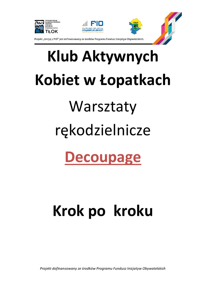 Klub Aktywnych Kobiet w Łopatkach Warsztaty rękodzielnicze Decoupage Krok po kroku Projekt dofinansowany ze środków Programu Fundusz Inicjatyw Obywatelskich Decoupage — technika zdobnicza polegająca na przyklejaniu na odpowiednio spreparowaną powierzchnię (praktycznie każda powierzchnia: drewno, metal, szkło, tkanina, plastik, ceramika) wzoru wyciętego z papieru lub serwetki papierowej i pokryciu go wieloma warstwami lakieru tak, aby wtopił się całkowicie i nie był wyczuwalny przy dotknięciu. W zamyśle ma on wyglądać jak namalowany. Słowo decoupage pochodzi od francuskiego czasownika „decouper” – wycinać. Projekt dofinansowany ze środków Programu Fundusz Inicjatyw Obywatelskich Deska: Farba biała podkładowa ( podkład wodny, farba akrylowa fasadowa lub emulsja akrylowa). Farba akrylowa ( ciemny kolor) Masa podkładowa pękająca. Farba akrylowa (jasny kolor) Wzór ( papier ryżowy)- użyty klej z werniksem Werniks z połyskiem, werniks satynowy lub werniks postarzający ( nawet kilkanaście warstw) Konturówka relief, perły w płynie, pasta pozłotnicza Deska kuchenna pomalowana białą farbą dla wyrównania koloru. Następie by uzyskać spękania zostały nałożone kolejno farba akrylowa ciemna, masa podkładowa pękająca, farba akrylowa jasna. Masę podkładową pękającą nakłada się na dobrze wyschniętą farbę akrylową ciemną, wielkość spękań jest zależna od ilości położonej masy, a kierunek spękań zależy od kierunku nakładania jasnej farby akrylowej. Masa podkładowa pękająca musi być jeszcze lepka w dotyku żeby nanieść jasną farbę. Gdy powstaną spękania i deska dobrze wyschnie przykleja się wcześniej przygotowany papier ryżowy. Użyty został klej z werniksem, najpierw posmarowana deska w miejscu przyklejenia papieru, następnie nakłada się klej z wierzchniej strony papieru od środka wzoru do zewnątrz. Praca wykończona kilkoma, nawet kilkunastoma warstwami werniksu z połyskiem, satynowego lub postarzającego, w zależności od oczekiwanego efektu. Do ozdobienia pracy użyto konturówek, pereł w płynie i past pozłotniczych. Projekt dofinansowany ze środków Programu Fundusz Inicjatyw Obywatelskich Zakładka do książki: Podkład wodny lub inna biała farba akrylowa Farba akrylowa ( kolor zgodny z odcieniem na wybranym wzorze) Wzór (papier ryżowy)- użyty klej z werniksem Werniks z połyskiem ( kilka warstw) Werniks pękający Bitumen lub porporina Zakładka pomalowana białą farbą dla wyrównania koloru ( podkładem wodnym w tym przypadku). Następnie pomalowana farbą akrylową w odcieniu zgodnym z tym na wybranym wzorze. Wszystkie kolejne warstwy farb muszą dobrze wyschnąć. Wybrany wzór z papieru ryżowego przyklejony klejem z werniksem i całość kilkukrotnie polakierowana werniksem z połyskiem. By uzyskać na zakładce spękania jako ostatnia warstwa został nałożony werniks pękający, po całkowitym wyschnięciu widoczne spękania wypełnia się bitumem. Projekt dofinansowany ze środków Programu Fundusz Inicjatyw Obywatelskich Jajo wielkanocne: Podkład wodny lub inna biała farba akrylowa Farba akrylowa ( ciemny kolor) Wosk Farba akrylowa (jaśniejszy kolor) Wzór (serwetka)- użyty klej wodny do decoupage Werniks z połyskiem, satynowy lub postarzający Jajo ze sklejki wykonane metodą przecierania. Pomalowane białą farbą dla wyrównania koloru. Następna ciemna warstwa farby akrylowej, gdy wyschnie za pomocą świeczki pocieramy brzegi sklejki i jajo w kilku miejscach. Na całość nanosimy farbę w jasnym kolorze, suszymy i za pomocą papieru ściernego polerujemy jajo, w miejscu gdzie był wosk jasna farba zetrze się i powstaną przetarcia. Na tak przygotowaną powierzchnię naklejamy serwetkę papierową używając kleju wodnego i smarując serwetkę tylko z góry. Z serwetki potrzebna jest tylko jedna wierzchnia warstwa. Jajo na końcu kilkukrotnie malujemy werniksem z połyskiem, satynowym lub postarzającym. Projekt dofinansowany ze środków Programu Fundusz Inicjatyw Obywatelskich Bombka styropianowa: Podkład wodny Farba akrylowa (możliwość zrobienia spękań, kolejność podana przy opisie deski i zakładki do książki) Wzór (papier ryżowy)- użyty klej wodny lub z werniksem Werniks z połyskiem, satynowy lub postarzający Pasta strukturalna imitująca śnieg Konturówka relief, perły w płynie, pasta pozłotnicza Kula styropianowa dwukrotnie pomalowana podkładem wodnym dla wyrównania powierzchni. Ozdabiana za pomocą spękań jedno lub dwuskładnikowych (opisane przy zdobieniu deski i zakładki do książki), papieru ryżowego, pasty imitującej śnieg, a do wykończenia użyte zostały parły w płynie, konturówki i pasty postarzające. Projekt dofinansowany ze środków Programu Fundusz Inicjatyw Obywatelskich Szkatułka: Podkład wodny Farba akrylowa Wzór (papier ryżowy, serwetka, papier soft lub klasyczny, szablony)- użyty klej wodny lub z werniksem Lakier akrylowy lub werniksy Szkatuły wykonane są różnymi metodami, spękania jednoskładnikowe ( akryl jasny- masa podkładowa pękająca- akryl jasny), spękania dwuskładnikowe (werniks z połyskiem- werniks pękający-bitumen), przecieranie, użyto szablonów, pasty strukturalnej. Do wykończenia prac użyto konturówek relief, pereł w płynie, past pozłotniczych. Należy pamiętać, że każda warstwa farby akrylowej, lakieru lub werniksu powinna dobrze wyschnąć, najlepiej sama w temperaturze pokojowej, ale można ten proces przyspieszyć za pomocą suszarki. Każdą z tych warstw po wyschnięciu powinno się przetrzeć papierem ściernym o dużej gęstości ( 240) dla wygładzenia powierzchni i lepszego efektu. Projekt dofinansowany ze środków Programu Fundusz Inicjatyw Obywatelskich Uczestniczki warsztatów rękodzielniczych Decoupage w Łopatkach Projekt dofinansowany ze środków Programu Fundusz Inicjatyw Obywatelskich