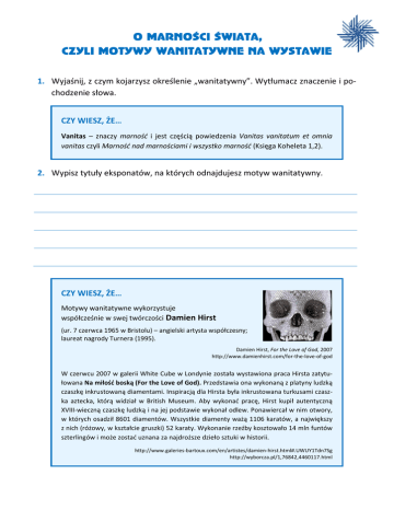 O MARNOŚCI ŚWIATA, CZYLI MOTYWY WANITATYWNE NA WYSTAWIE 1. Wyjaśnij, z czym kojarzysz określenie „wanitatywny”. Wytłumacz znaczenie i pochodzenie słowa. CZY WIESZ, ŻE… Vanitas – znaczy marność i jest częścią powiedzenia Vanitas vanitatum et omnia vanitas czyli Marność nad marnościami i wszystko marność (Księga Koheleta 1,2). 2. Wypisz tytuły eksponatów, na których odnajdujesz motyw wanitatywny. CZY WIESZ, ŻE… Motywy wanitatywne wykorzystuje współcześnie w swej twórczości Damien Hirst (ur. 7 czerwca 1965 w Bristolu) – angielski artysta współczesny; laureat nagrody Turnera (1995). Damien Hirst, For the Love of God, 2007 http://www.damienhirst.com/for-the-love-of-god W czerwcu 2007 w galerii White Cube w Londynie została wystawiona praca Hirsta zatytułowana Na miłość boską (For the Love of God). Przedstawia ona wykonaną z platyny ludzką czaszkę inkrustowaną diamentami. Inspiracją dla Hirsta była inkrustowana turkusami czaszka aztecka, którą widział w British Museum. Aby wykonać pracę, Hirst kupił autentyczną XVIII-wieczną czaszkę ludzką i na jej podstawie wykonał odlew. Ponawiercał w nim otwory, w których osadził 8601 diamentów. Wszystkie diamenty ważą 1106 karatów, a największy z nich (różowy, w kształcie gruszki) 52 karaty. Wykonanie rzeźby kosztowało 14 mln funtów szterlingów i może zostać uznana za najdroższe dzieło sztuki w historii. http://www.galeries-bartoux.com/en/artistes/damien-hirst.html#.UWUY1Tdn7Sg http://wyborcza.pl/1,76842,4460117.html CZY WIESZ, ŻE… Martwa natura – to rodzaj kompozycji złożonej z przedmiotów codziennego użytku: naczyń, mebli, tkanin, a także kwiatów, owoców czy upolowanych zwierząt. Motyw ten występował już w starożytnym malarstwie hellenistycznym, a począwszy od XVI w. stał się autonomiczną formą malarską, którą do perfekcji doprowadzili mistrzowie niderlandzcy. Martwa natura. Historia, arcydzieła, interpretacje, Warszawa 2000; Charles Sterling, Martwa natura od starożytności do XX wieku, Warszawa, 1998 Możemy wyróżnić różne typy martwej natury: kwiatowa (bukiety), owocowa, śniadaniowa (bankietowa), muzyczna (instrumenty muzyczne), zwierzęca (myśliwska), targowa i kuchenna (stragany i spiżarnie), wanitatywna (vanitas). 3. Wykonaj w dowolnej technice martwą naturę XXI wieku. Naśladując niderlandzkich mistrzów, zadbaj o wanitatywną wymowę Twojej kompozycji. CZY WIESZ, ŻE… zgromadzone na obrazach kosztowne i modne przedmioty (szklane kielichy, perły, cytrusy), interpretowano jako zbyteczną, próżną pogoń za bogactwem i wiecznością? XXI wiek ma także atrybuty takich samych tęsknot człowieka – postaraj się je wymienić.
