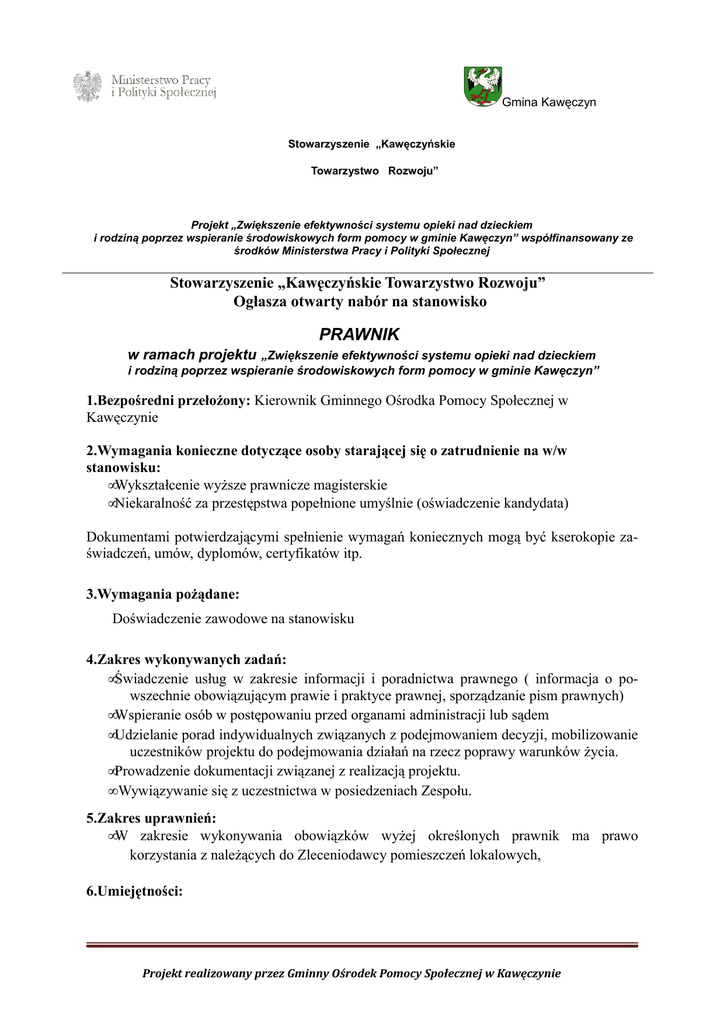 Gmina Kawęczyn Stowarzyszenie „Kawęczyńskie Towarzystwo Rozwoju” Projekt „Zwiększenie efektywności systemu opieki nad dzieckiem i rodziną poprzez wspieranie środowiskowych form pomocy w gminie Kawęczyn” współfinansowany ze środków Ministerstwa Pracy i Polityki Społecznej _________________________________________________________________________________ Stowarzyszenie „Kawęczyńskie Towarzystwo Rozwoju” Ogłasza otwarty nabór na stanowisko PRAWNIK w ramach projektu „Zwiększenie efektywności systemu opieki nad dzieckiem i rodziną poprzez wspieranie środowiskowych form pomocy w gminie Kawęczyn” 1.Bezpośredni przełożony: Kierownik Gminnego Ośrodka Pomocy Społecznej w Kawęczynie 2.Wymagania konieczne dotyczące osoby starającej się o zatrudnienie na w/w stanowisku: •Wykształcenie wyższe prawnicze magisterskie •Niekaralność za przestępstwa popełnione umyślnie (oświadczenie kandydata) Dokumentami potwierdzającymi spełnienie wymagań koniecznych mogą być kserokopie zaświadczeń, umów, dyplomów, certyfikatów itp. 3.Wymagania pożądane: Doświadczenie zawodowe na stanowisku 4.Zakres wykonywanych zadań: •Świadczenie usług w zakresie informacji i poradnictwa prawnego ( informacja o powszechnie obowiązującym prawie i praktyce prawnej, sporządzanie pism prawnych) •Wspieranie osób w postępowaniu przed organami administracji lub sądem •Udzielanie porad indywidualnych związanych z podejmowaniem decyzji, mobilizowanie uczestników projektu do podejmowania działań na rzecz poprawy warunków życia. •Prowadzenie dokumentacji związanej z realizacją projektu. • Wywiązywanie się z uczestnictwa w posiedzeniach Zespołu. 5.Zakres uprawnień: •W zakresie wykonywania obowiązków wyżej określonych prawnik ma prawo korzystania z należących do Zleceniodawcy pomieszczeń lokalowych, 6.Umiejętności: Projekt realizowany przez Gminny Ośrodek Pomocy Społecznej w Kawęczynie •Kompetencje kluczowe (komunikatywność, sumienność, rzetelność, dokładność, umiejętności interpersonalne, bardzo dobra organizacja pracy, odpowiedzialność, kreatywność, wysoki poziom kultury osobistej), •Dodatkowe kompetencje (umiejętność prognozowania, umiejętności rozwiązywania problemów, dokonywania analiz problemów zgłaszanych przez uczestników projektu). •Inne umiejętności: kierowanie pojazdem (prawo jazdy kat. B), obsługa urządzeń biurowych. 7.Rodzaj zatrudnienia: •Umowa- zlecenie. 8.Wymagane dokumenty: • list motywacyjny • życiorys – CV • kserokopie dokumentów potwierdzających doświadczenie •kserokopie dyplomów potwierdzających wykształcenie i posiadane kwalifikacje zawodowe • kserokopie zaświadczeń o ukończonych kursach, szkoleniach itp. • referencje • oświadczenie o wyrażeniu zgody na przetwarzanie danych osobowych do celów rekrutacji wg wzoru poniżej. 9.Oferujemy: •rozwojową pracę, •atrakcyjne wynagrodzenie, •stabilne warunki zatrudnienia, •przyjazną atmosferę pracy. 10.Termin i miejsce składania dokumentów: Wymagane dokumenty aplikacyjne należy składać osobiście w biurze Stowarzyszenia lub przesłać pocztą na adres: Stowarzyszenie „Kawęczyńskie Towarzystwo Rozwoju”, Kawęczyn 39/3, 62-704 Kawęczyn, w zamkniętych kopertach z podanym adresem zwrotnym i dopiskiem „Konkurs na stanowisko Prawnik w Stowarzyszeniu „Kawęczyńskie Towarzystwo Rozwoju” w terminie do dnia 28.07.2011 r. do godz. 1200 Do dokumentów należy dołączyć zgodę na przetwarzanie danych osobowych tj. klauzulę: „Wyrażam zgodę na przetwarzanie moich danych osobowych zawartych w ofercie pracy dla potrzeb niezbędnych do realizacji procesu rekrutacji zgodnie z ustawą z dnia 29 sierpnia 1997 r. o ochronie danych osobowych (t. j. Dz. U. z 2002 r. Nr 101, poz. 926 ze zm.)”. Dodatkowe informacje można uzyskać pod numerem telefonu: 063 2885930. Informacje dodatkowe: •Aplikacje, które wpłyną do Stowarzyszenia po wyżej określonym terminie nie będą rozpatrywane. Projekt realizowany przez Gminny Ośrodek Pomocy Społecznej w Kawęczynie •Z kandydatami spełniającymi wymagania konieczne lub/i pożądane zostanie przeprowadzona rozmowa kwalifikacyjna, o której zostaną poinformowani telefonicznie. •Informacja o wyniku naboru będzie umieszczona na stronie internetowej oraz na tablicy ogłoszeń Stowarzyszenia „Kawęczyńskie Towarzystwo Rozwoju”. Prezes Zarządu /-/ Jarosław Król Projekt realizowany przez Gminny Ośrodek Pomocy Społecznej w Kawęczynie