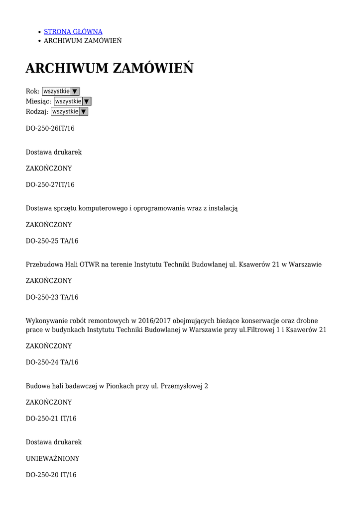 STRONA GŁÓWNA ARCHIWUM ZAMÓWIEŃ ARCHIWUM ZAMÓWIEŃ Rok: wszystkie ▼ Miesiąc: wszystkie ▼ Rodzaj: wszystkie ▼ DO-250-26IT/16 Dostawa drukarek ZAKOŃCZONY DO-250-27IT/16 Dostawa sprzętu komputerowego i oprogramowania wraz z instalacją ZAKOŃCZONY DO-250-25 TA/16 Przebudowa Hali OTWR na terenie Instytutu Techniki Budowlanej ul. Ksawerów 21 w Warszawie ZAKOŃCZONY DO-250-23 TA/16 Wykonywanie robót remontowych w 2016/2017 obejmujących bieżące konserwacje oraz drobne prace w budynkach Instytutu Techniki Budowlanej w Warszawie przy ul.Filtrowej 1 i Ksawerów 21 ZAKOŃCZONY DO-250-24 TA/16 Budowa hali badawczej w Pionkach przy ul. Przemysłowej 2 ZAKOŃCZONY DO-250-21 IT/16 Dostawa drukarek UNIEWAŻNIONY DO-250-20 IT/16 Dostawa sprzętu komputerowego i oprogramowania wraz z instalacją UNIEWAŻNIONY DO-250-19 IT/16 Dostawa macierzy dyskowej wraz z instalacją ZAKOŃCZONY DO-250-18 OM/16 Wywóz nieczystości stałych, odpadów pobadawczych, gruzu z terenu Oddziału Mazowieckiego Instytutu Techniki Budowlanej w Pionkach, przy ul. Przemysłowej 2 ZAKOŃCZONY DO-250-17 TA/16 Budowa hali badawczej pod tunel aerodynamiczny wraz z niezbędną infrastrukturą techniczną w Pionkach przy ul. Przemysłowej 2 UNIEWAŻNIONY DO-250-16 TA/16 Dostawa aparatu rurowego do badania przewodności cieplnej materiałów termoizolacyjnych ZAKOŃCZONY DO-250-13 TA/16 Dostawa gazowego zestawu chromatograficznego ZAKOŃCZONY DO-250-14 TA/16 Dostawa urządzenia do badania ścian osłonowych „śmigło” zgodnie z normą PN-EN 13050 w zakresie laboratoryjnego natrysku wody pod ciśnieniem dynamicznym powietrza ZAKOŃCZONY DO-250-09 TA/16 Ochrona fizyczna,monitoring terenu i obiektów Instytutu Techniki Budowlanej cz.1-Warszawa, cz.2Pionki, cz.3- Katowice ZAKOŃCZONY DO-250-06 TO/16 Świadczenie stałej pomocy prawnej na rzecz Instytutu Techniki Budowlanej (2016) ZAKOŃCZONY DO-250-10 TA/16 Modernizacja maszyny wytrzymałościowej Instron 8033 ZAKOŃCZONY DO-250-08 TA/16 Dostawa aparatu płytowego do pomiaru przewodności cieplnej ZAKOŃCZONY DO-250-05 TA/16 Ubezpieczenie Instytutu Techniki Budowlanej ZAKOŃCZONY DO-250-01 TA/16 Świadczenie usług pocztowych w obrocie krajowym i zagranicznym na rok 2016-2017 dla ITB w Warszawie ZAKOŃCZONY DO-250-02 TZ/16 Sukcesywne dostawy termoelementów typu K i drutu termoparowego typu K dla OM ITB w Pionkach ZAKOŃCZONY Dostawa wielokanałowego systemu do pomiarów akustyki budowlanej. UNIEWAŻNIONY Sukcesywne dostawy oleju opałowego lekkiego dla Wielkopolskiego Oddziału ITB w Poznaniu ZAKOŃCZONY Ochrona fizyczna, monitoring terenu i obiektów ITB położonych w Katowicach przy Al. Korfantego 191. ZAKOŃCZONY Dostawa chromatografu jonowego. ZAKOŃCZONY Dostawa wielozadaniowego urządzenia wiertniczego z sondą do wiercen i badań geotechnicznych ZAKOŃCZONY Modernizacja 3 stanowisk do badań wytrzymałościowych i szczelności okien, drzwi i ścian osłonowych wraz z uruchomieniem stanowisk i szkoleniem personelu ZAKOŃCZONY Dostawa komory klimatycznej (2015) ZAKOŃCZONY DO-250-15OM/15 Remont i modernizacja estakady suwnicy o DOR 12,5 T w ITB OM w Pionkach ul. Przemysłowa 2 ZAKOŃCZONY DO-250-08 TA/15 Budowa wewnętrznej sieci wodociągowej cz.II oraz przebudowa wewnętrznej sieci cieplnej cz.I na terenie Instytutu Techniki Budowlanej ul.Ksawerów 21 w Warszawie ZAKOŃCZONY Dostawa zestawu maszyn wytrzymałościowych z 4 ramami. ZAKOŃCZONY OZM-22-58 Dostawa gazowego zestawu chromatograficznego ZAKOŃCZONY Ochrona fizyczna, monitoring terenu i obiektów Instytutu Techniki Budowlanej położonych w Warszawie ul. Filtrowa 1 oraz Ksawerów 21 ZAKOŃCZONY Ochrona fizyczna, monitoring terenu i obiektów Instytutu Techniki Budowlanej położonych w Pionkach przy ul. Przemysłowej 2 ZAKOŃCZONY OCHRONA FIZYCZNA, MONITORING TERENU i OBIEKTÓW INSTYTUTU TECHNIKI BUDOWLANEJ POŁOŻONYCH W WARSZAWIE UL. FILTROWA 1 ORAZ KSAWERÓW 21 Ochrona fizyczna, monitoring terenu i obiektów Instytutu Techniki Budowlanej połozonych w Pionkach przy ul. Przemysłowej 2. UNIEWAŻNIONY Sprzedaż energii elektrycznej na rok 2015 dla ITB w lokalizacjach: Warszawa, Pionki, Katowice, Poznań. ZAKOŃCZONY Świadczenie usług telefonii komórkowej wraz z dostawą nowych telefonów komórkowych i urządzeń do transmisji danych ZAKOŃCZONY Dostawa spektrometru w podczerwieni FTIR do analizy próbek stałych i ciekłych oraz ciagłego pomiaru gazowych produktów podczas procesu spalania ZAKOŃCZONY Dostawa sprzętu komputerowego i oprogramowania wraz z instalacją (2014r) ZAKOŃCZONY Dostawa podnosnika koszowego przegubowego (2) ZAKOŃCZONY Sukcesywne dostawy oleju opałowego lekkiego dla Wielkopolskiego Oddziału ITB w Poznaniu (2014r) ZAKOŃCZONY Termomodernizacja budynku A w Instytucie Techniki Budowlanej al.w.Korfantego 191 w Katowicach ZAKOŃCZONY Zaprojektowanie oraz dostawa wraz z montażem specjalistycznego stanowiska do badań rozwoju pożaru w pełnej skali – Duży Kalorymetr ZAKOŃCZONY Remont budynku biurowo – konferencyjnego na działce nr. ew. 1464/67 Laboratorium Badań Ogniowych w Pionkach przy ul. Przemysłowej 2 ZAKOŃCZONY Ochrona fizyczna, monitoring terenu i obiektów Instytutu Techniki Budowlanej połozonych w Katowicach przy Al. Korfantego 191 ZAKOŃCZONY Świadczenie usług obejmujących bieżące konserwacje oraz drobne prace w budynkach ITB w Warszawie przy ul.Filtrowej 1 i Ksawerów 21 w 2014/2015 ZAKOŃCZONY Termomodernizacja budynku A w Instytucie Techniki Budowlanej ul. Ksawerów 21 w Warszawie ZAKOŃCZONY Świadczenie usług w 2014/2015 obejmujących i bieżące konserwacje oraz drobne prace w budynkach Instytutu Techniki Budowlanej w Warszawie przy ul. Filtrowej 1 i Ksawerów 21. UNIEWAŻNIONY Zaprojektowanie i dostawa osłony termicznej przenośnej do stanowisk badania odporności ogniowej – komory badawcze F3’ ( Ardor ) i F3” ( Spark ) w Laboratorium Badań Ogniowych w Pionkach przy ul. Przemysłowej 2. ZAKOŃCZONY Dostawa podnośnika koszowego przegu