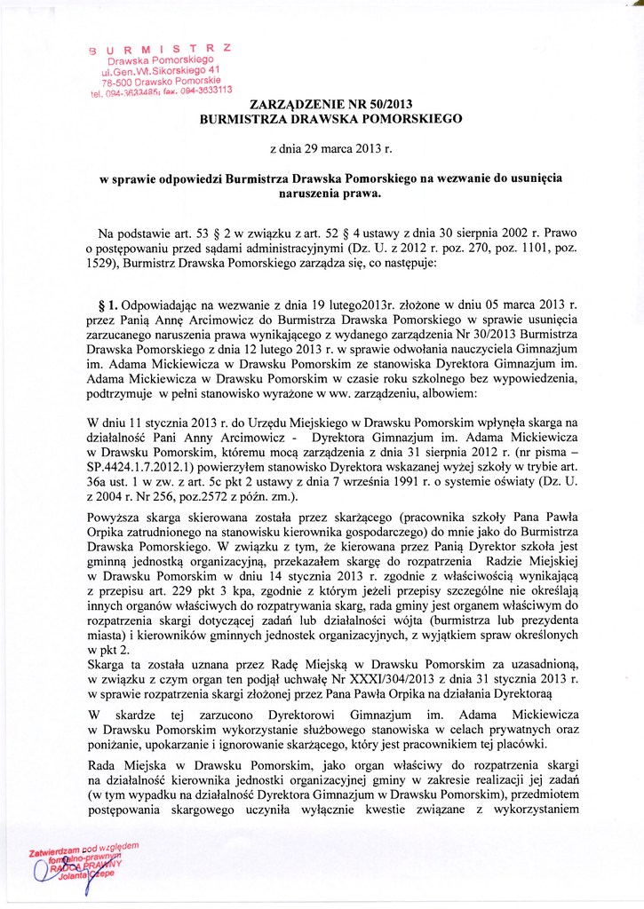 B U R M I S T R Z Drawska Pomorskiego ui.Gen.Wł.Sikorskiego 41 78-500 Drawsko Pomorskie tel 094-363348§t fax. 084-3633113 ZARZĄDZENIE NR 50/2013 BURMISTRZA DRAWSKA POMORSKIEGO z dnia 29 marca 2013 r. w sprawie odpowiedzi Burmistrza Drawska Pomorskiego na wezwanie do usunięcia naruszenia prawa. Na podstawie art. 53 § 2 w związku z art. 52 § 4 ustawy z dnia 30 sierpnia 2002 r. Prawo o postępowaniu przed sądami administracyjnymi (Dz. U. z 2012 r. poz. 270, poz. 1101, poz. 1529), Burmistrz Drawska Pomorskiego zarządza się, co następuje: § 1. Odpowiadając na wezwanie z dnia 19 lutego2013r. złożone w dniu 05 marca 2013 r. przez Panią Annę Arcimowicz do Burmistrza Drawska Pomorskiego w sprawie usunięcia zarzucanego naruszenia prawa wynikającego z wydanego zarządzenia Nr 30/2013 Burmistrza Drawska Pomorskiego z dnia 12 lutego 2013 r. w sprawie odwołania nauczyciela Gimnazjum im. Adama Mickiewicza w Drawsku Pomorskim ze stanowiska Dyrektora Gimnazjum im. Adama Mickiewicza w Drawsku Pomorskim w czasie roku szkolnego bez wypowiedzenia, podtrzymuje w pełni stanowisko wyrażone w ww. zarządzeniu, albowiem: W dniu 11 stycznia 2013 r. do Urzędu Miejskiego w Drawsku Pomorskim wpłynęła skarga na działalność Pani Anny Arcimowicz - Dyrektora Gimnazjum im. Adama Mickiewicza w Drawsku Pomorskim, któremu mocą zarządzenia z dnia 31 sierpnia 2012 r. (nr pisma SP.4424.1.7.2012.1) powierzyłem stanowisko Dyrektora wskazanej wyżej szkoły w trybie art. 36a ust. 1 w zw. z art. 5c pkt 2 ustawy z dnia 7 września 1991 r. o systemie oświaty (Dz. U. z 2004 r. Nr 256, poz.2572 z póżn. zm.). Powyższa skarga skierowana została przez skarżącego (pracownika szkoły Pana Pawła Orpika zatrudnionego na stanowisku kierownika gospodarczego) do mnie jako do Burmistrza Drawska Pomorskiego. W związku z tym, że kierowana przez Panią Dyrektor szkoła jest gminną jednostką organizacyjną, przekazałem skargę do rozpatrzenia Radzie Miejskiej w Drawsku Pomorskim w dniu 14 stycznia 2013 r. zgodnie z właściwością wynikającą z przepisu art. 229 pkt 3 kpa, zgodnie z którym jeżeli przepisy szczególne nie określają innych organów właściwych do rozpatrywania skarg, rada gminy jest organem właściwym do rozpatrzenia skargi dotyczącej zadań lub działalności wójta (burmistrza lub prezydenta miasta) i kierowników gminnych jednostek organizacyjnych, z wyjątkiem spraw określonych w pkt 2. Skarga ta została uznana przez Radę Miejską w Drawsku Pomorskim za uzasadnioną, w związku z czym organ ten podjął uchwałę Nr XXXI/304/2013 z dnia 31 stycznia 2013 r. w sprawie rozpatrzenia skargi złożonej przez Pana Pawła Orpika na działania Dyrektoraą W skardze tej zarzucono Dyrektorowi Gimnazjum im. Adama Mickiewicza w Drawsku Pomorskim wykorzystanie służbowego stanowiska w celach prywatnych oraz poniżanie, upokarzanie i ignorowanie skarżącego, który jest pracownikiem tej placówki. Rada Miejska w Drawsku Pomorskim, jako organ właściwy do rozpatrzenia skargi na działalność kierownika jednostki organizacyjnej gminy w zakresie realizacji jej zadań (w tym wypadku na działalność Dyrektora Gimnazjum w Drawsku Pomorskim), przedmiotem postępowania skargowego uczyniła wyłącznie kwestie związane z wykorzystaniem pod względem stanowiska służbowego do celów niezwiązanych z kierowaniem placówką, pozostawiając zarzuty w sprawie niewłaściwego traktowania skarżącego sądowi pracy oraz innym właściwym instytucjom, do których skierowano skarżącego. W trakcie postępowania wyjaśniającego w sprawie ustalono, że Dyrektor Gimnazjum w Drawsku Pomorskim zlecił dwóm pracownikom placówki świadczenie pracy polegającej na wykonaniu remontu w prywatnym mieszkaniu Dyrektora w Kaliszu Pomorskim w godzinach ich pracy. Fakt ten potwierdzili zainteresowani pracownicy oraz sam Dyrektor tłumacząc, że prace te ww. pracownicy wykonywali w swoim czasie prywatnym (wolnym od pracy odbieranym za przepracowane nadgodziny). Ww. pracownicy przyznali, że jeździli do Kalisza Pomorskiego do mieszkania Pani Dyrektor w godzinach pracy w celu wykonywania prac remontowych na jej rzecz. Sytuacja ta była zainicjowana przez Panią Dyrektor, miała trwać kilka dni, ale prace przeciągnęły się do trzech tygodni. W praktyce wyglądało to tak, że pracownicy ci przychodzili do pracy w Gimnazjum, podpisywali listę obecności, wykonywali niezbędne prace w szkole i następnie jechali swoim samochodem do Kalisza Pomorskiego do mieszkania Pani Dyrektor. Do pracy już nie wracali. Przyznali, że nie wiedzą, jak został rozliczony ten czas, ponieważ czasami pracowali w sobotę, czy niedzielę, ale nie są w stanie stwierdzić, czy godziny pracy w Kaliszu Pomorskim zostały uznane za ich czas pracy przepracowany w godzinach nadliczbowych. Mając na uwadze powyższy stan faktyczny, Rada Miejska w Drawsku Pomorskim mocą swej ww. uchwały uznała przedmiotową skargę za uzasadnioną w części stanowiącej przedmiot badania, tj. w zakresie dotyczącym zarzutu wykorzystania przez Panią Arcimowicz jej kierowniczego służbowego stanowiska w celach prywatnych. Rada uznała, że naganne jest wykorzystywanie swojego stanowiska służbowego, w tym stosunku nadrzędności wobec pracowników, w jakimkolwiek celu niezwiązanym z realizacją zadań na rzecz jednostki. W związku z powyższym Burmistrz Drawska Pomorskiego zarządzeniem Nr 30/2013 z dnia 12 lutego 2013r.- po przeprowadzeniu ponownej analizy sprawy i rozważeniu wszystkich jej okoliczności odwołał Panią Annę Arcimowicz ze stanowiska dyrektora Gimnazjum im. Adama Mickiewicza w Drawsku Pomorskim na mocy art. 38 ust. 1 pkt 2 w zw. z art. 5c pkt 2 ustawy z dnia 7 września 1991 r. o systemie oświaty (Dz. U. z 2004 r. Nr 256, poz.2572 z późn. zm.), zgodnie z którym organ, który powierzył nauczycielowi stanowisko kierownicze w szkole w przypadkach szczególnie uzasadnionych, po zasięgnięciu opinii kuratora oświaty może od