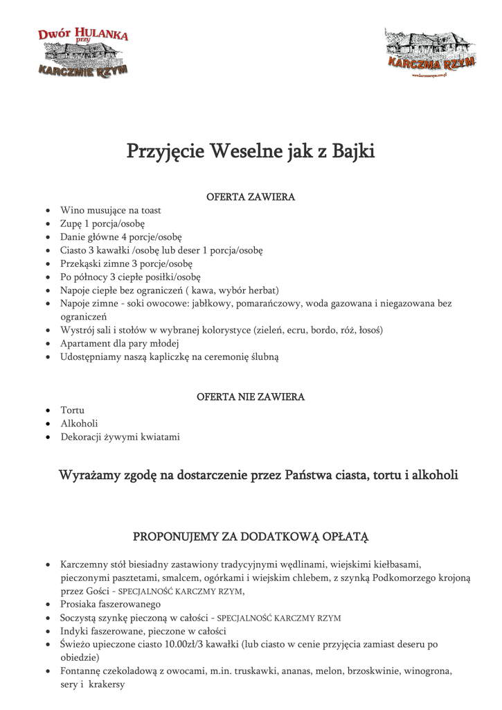 Przyjęcie Weselne jak z Bajki OFERTA ZAWIERA Wino musujące na toast Zupę 1 porcja/osobę Danie główne 4 porcje/osobę Ciasto 3 kawałki /osobę lub deser 1 porcja/osobę Przekąski zimne 3 porcje/osobę Po północy 3 ciepłe posiłki/osobę Napoje ciepłe bez ograniczeń ( kawa, wybór herbat) Napoje zimne - soki owocowe: jabłkowy, pomarańczowy, woda gazowana i niegazowana bez ograniczeń Wystrój sali i stołów w wybranej kolorystyce (zieleń, ecru, bordo, róż, łosoś) Apartament dla pary młodej Udostępniamy naszą kapliczkę na ceremonię ślubną OFERTA NIE ZAWIERA Tortu Alkoholi Dekoracji żywymi kwiatami Wyrażamy zgodę na dostarczenie przez Państwa ciasta, tortu i alkoholi PROPONUJEMY ZA DODATKOWĄ OPŁATĄ Karczemny stół biesiadny zastawiony tradycyjnymi wędlinami, wiejskimi kiełbasami, pieczonymi pasztetami, smalcem, ogórkami i wiejskim chlebem, z szynką Podkomorzego krojoną przez Gości - SPECJALNOŚĆ KARCZMY RZYM, Prosiaka faszerowanego Soczystą szynkę pieczoną w całości - SPECJALNOŚĆ KARCZMY RZYM Indyki faszerowane, pieczone w całości Świeżo upieczone ciasto 10.00zł/3 kawałki (lub ciasto w cenie przyjęcia zamiast deseru po obiedzie) Fontannę czekoladową z owocami, m.in. truskawki, ananas, melon, brzoskwinie, winogrona, sery i krakersy Tort w otoczce suchego lodu Owoce na gerydonach 5.00 - 10.00zł/osobę (150g/300g) Piwo z kija keg 30 l. Alkohol bez ograniczeń – 45,00zł/osobę (wino do obiadu-czerwone i białe, przez całą noc - piwo, wódka Sobieski, Wyborowa) Alkohol bez ograniczeń – 58,00zł/osobę (wino do obiadu – czerwone i białe, przez całą noc - piwo, wódka FINLANDIA) Serwis dostarczonego przez Państwa alkoholu Wystrój sali i stołów w wybranej kolorystyce z żywymi kwiatami ( w cenie wystrój stołów bez kwiatów) Pokrowce na krzesła (w standardzie krzesła w bordowych obiciach) 26 pokoi hotelowych dla gości weselnych Limuzynę zabytkową z szoferem w liberii Wieczór panieński w Spa w Hotelu Bohema***** Wieczór kawalerski na basenie w Hotelu Bohema***** Miodowy weekend w Hotelu Bohema***** z udostępnieniem wnętrz do sesji zdjęciowej Tradycyjne ludowe oczepiny Poprawiny POMOŻEMY ZORGANIZOWAĆ Oprawę muzyczną oraz inne atrakcje : pokaz tańca, pokazy artystyczne, występ wokalny, pokazy barmańskie, przedstawienie teatralne Profesjonalnych animatorów dla dzieci Tort weselny POZOSTAJEMY DO DYSPOZYCJI ABY WSPÓLNIE ZORGANIZOWAĆ NAJLEPSZE PRZYJĘCIE NA PAŃSTWA ZAPYTANIA CZEKA MANAGER Karczmy Rzym Seweryn Bronk 531-531-516, [email protected] MANAGER Dworu Hulanka Przemysław Arach 728-533-910, [email protected] ul. Bydgoska 1, 86-014 Pawłówek, Tel 52 / 583 16 16 ,www.karczmarzym.com.pl