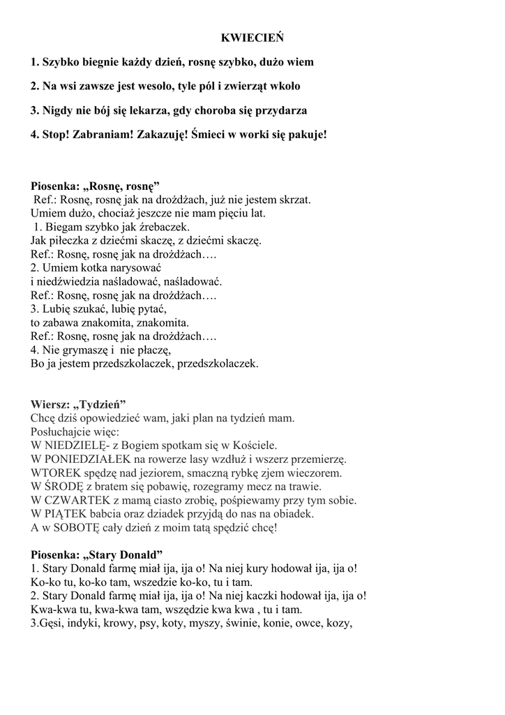 KWIECIEŃ 1. Szybko biegnie każdy dzień, rosnę szybko, dużo wiem 2. Na wsi zawsze jest wesoło, tyle pól i zwierząt wkoło 3. Nigdy nie bój się lekarza, gdy choroba się przydarza 4. Stop! Zabraniam! Zakazuję! Śmieci w worki się pakuje! Piosenka: „Rosnę, rosnę” Ref.: Rosnę, rosnę jak na drożdżach, już nie jestem skrzat. Umiem dużo, chociaż jeszcze nie mam pięciu lat. 1. Biegam szybko jak źrebaczek. Jak piłeczka z dziećmi skaczę, z dziećmi skaczę. Ref.: Rosnę, rosnę jak na drożdżach…. 2. Umiem kotka narysować i niedźwiedzia naśladować, naśladować. Ref.: Rosnę, rosnę jak na drożdżach…. 3. Lubię szukać, lubię pytać, to zabawa znakomita, znakomita. Ref.: Rosnę, rosnę jak na drożdżach…. 4. Nie grymaszę i nie płaczę, Bo ja jestem przedszkolaczek, przedszkolaczek. Wiersz: „Tydzień” Chcę dziś opowiedzieć wam, jaki plan na tydzień mam. Posłuchajcie więc: W NIEDZIELĘ- z Bogiem spotkam się w Kościele. W PONIEDZIAŁEK na rowerze lasy wzdłuż i wszerz przemierzę. WTOREK spędzę nad jeziorem, smaczną rybkę zjem wieczorem. W ŚRODĘ z bratem się pobawię, rozegramy mecz na trawie. W CZWARTEK z mamą ciasto zrobię, pośpiewamy przy tym sobie. W PIĄTEK babcia oraz dziadek przyjdą do nas na obiadek. A w SOBOTĘ cały dzień z moim tatą spędzić chcę! Piosenka: „Stary Donald” 1. Stary Donald farmę miał ija, ija o! Na niej kury hodował ija, ija o! Ko-ko tu, ko-ko tam, wszedzie ko-ko, tu i tam. 2. Stary Donald farmę miał ija, ija o! Na niej kaczki hodował ija, ija o! Kwa-kwa tu, kwa-kwa tam, wszędzie kwa kwa , tu i tam. 3.Gęsi, indyki, krowy, psy, koty, myszy, świnie, konie, owce, kozy, Piosenka: „Do lekarza” Gdy boli ucho i w gardle sucho, wtedy się zdarza iść do lekarza. Ref.: Oj, oj, oj, panie doktorze, oj, oj, oj, niech pan pomoże! Pan lekarstwa wszystkie zna i wyleczy mnie raz-dwa! Kiedy pechowo uderzę głową albo kolanem o twardą ścianę: Ref.: Oj, oj, oj, panie doktorze, …… Wiersz: „Zdrowie” Wszystkie dzieci chcą być zdrowe: wiosną, latem czy jesienią. Dlatego o tej porze witaminy sobie cenią. Tomek zjada liść sałaty, jabłko chrupie mała Ania, Rzodkiewki i ogórki na surówkę potnie Hania. Grześ surówkę palcem trąca wcale miska go nie nęci. Zjadaj Grzesiu, będziesz zdrowy trzeba tylko trochę chęci. Zjedz surówkę to urośniesz-ale Grzesio robi miny I nie wierzy, że w tej misce siedzą same witaminy. Piosenka: „Czysty świat” Oj, bałagan wszędzie wielki, leżą puszki i butelki. Tu torebki, tam pudełka i papierki po cukierkach! Ref.: Niechaj zniknie każdy śmieć, my porządek chcemy mieć!}2x Puste puszki i butelki, kapsle, skórki i papierki Wszystkie śmieci sprzątnąć pora, hop do kosza, hop do wora! Ref.: Niechaj zniknie każdy śmieć, my porządek chcemy mieć!}2x