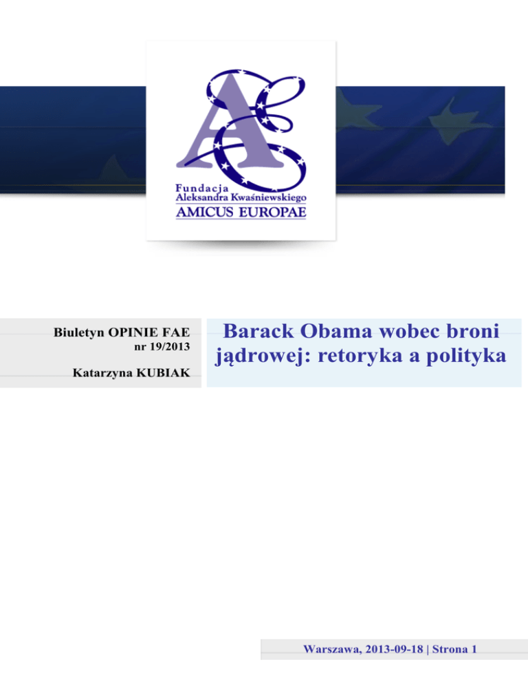 Biuletyn OPINIE FAE nr 19/2013 Barack Obama wobec broni jądrowej: retoryka a polityka Katarzyna KUBIAK Warszawa, 2013-09-18 | Strona 1 Barack Obama wobec broni jądrowej: retoryka a polityka Biuletyn OPINIE FAE nr 19/2013 Katarzyna Kubiak Drugą kadencję w Białym Domu prezydent Barack Obama dedykuje redukcjom strategicznych i taktycznych zbrojeń nuklearnych, nieproliferacji broni nuklearnej oraz przeciwdziałaniu terroryzmowi nuklearnemu. Na kanwie postępującego ochłodzenia na linii Waszyngton-Moskwa, najtrudniejszym wyzwaniem dla administracji USA będzie zainteresowanie dalszymi cięciami Rosji. Obama musi się ponadto zmierzyć z trudnościami natury wewnątrzpolitycznej i utrzymaniem lojalności sojuszniczej. Mając wzgląd na te ograniczenia, uzasadnionym wydaje się pytanie o szanse na realizację ogłoszonych tych planów. Od początku urzędowania Barack Obama postawił sobie bardzo wysoką poprzeczkę. Jego wizja świata wolnego od broni nuklearnej, wygłoszona w kwietniu 2009 r. w Pradze, przysporzyła mu Pokojową Nagrodę Nobla, a co za tym idzie – wysokie oczekiwania społeczności międzynarodowej. W trakcie pierwszej kadencji prezydent Obama wynegocjował dwustronny traktat z Rosją ograniczający strategiczne zbrojenia nuklearne (New START), zwołał instytucję “Szczytu bezpieczeństwa nuklearnego“ (Nuclear Security Summit) oraz nieznacznie zmodyfikował rolę broni nuklearnej w doktrynie bezpieczeństwa Stanów Zjednoczonych. Na określenie swojej wizji na czas drugiej kadencji w Białym Domu Obama obrał Berlin, gdzie 19 czerwca 2013 r. wygłosił mowę programową. “Dopóki broń nuklearna będzie istnieć, nie jesteśmy naprawdę bezpieczni”1, mówił przed Bramą Brandenburską. W odpowiedzi na to wyzwanie zaproponował szereg kroków, w większości będących przywołaniem lub kontynuacją programu ogłoszonego w Pradze w 2009 r. Prekursorskim elementem przemówienia jest natomiast stworzenie pomostu między koncepcją sprawiedliwości, a likwidacją broni nuklearnej. Obama jest najprawdopodobniej pierwszym prezydentem USA dla którego “pokój i sprawiedliwość oznaczają dążenie do bezpieczeństwa na świecie bez broni nuklearnej”. Drugim ważnym wydarzeniem definiującym politykę nuklearną administracji Obamy było opublikowanie przez Departament Obrony Stanów Zjednoczonych 12 czerwca 2013 “Strategii użycia broni nuklearnej” (Nuclear Weapons Employment Strategy)2. Raport powstał na zlecenie prezydenta pod przewodnictwem Departamentu Obrony Stanów Zjednoczonych w konsultacji z The White House (2013) Remarks by President Obama at the Brandenburg Gate; Berlin, Germany; June 19, 2013; http://www.whitehouse.gov/the-press-office/2013/06/19/remarks-president-obama-brandenburg-gate-berlin-germany 2 Department of Defence (2013) Report on Nuclear Employment Strategy of the United States Specified in Section 491 of 10 U.S.C.; 12 June 2013; http://www.defense.gov/pubs/reporttoCongressonUSNuclearEmploymentStrategy_Section491.pdf 1 Warszawa, 2013-09-18 | Strona 2 Barack Obama wobec broni jądrowej: retoryka a polityka Biuletyn OPINIE FAE nr 19/2013 Katarzyna Kubiak Departamentem Stanu, Departamentem Energii, Kolegium Połączonych Szefów Sztabów, Dowództwem Strategicznym USA oraz służbami specjalnymi. Ma on dostosować istniejący arsenał nuklearny do wyzwań środowiska międzynarodowego w XXI wieku i określić wykonalność “Przeglądu Polityki Nuklearnej” (Nuclear Posture Review). Strategiczne arsenały broni nuklearnej Najbardziej wymiernym projektem wygłoszonym w Berlinie jest gotowość administracji Obamy do redukcji o jedną trzecią rozmieszczonej strategicznej broni nuklearnej. “Strategia użycia broni nuklearnej” uznaje co prawda wynegocjowany w układzie New START 3 poziom strategicznej broni nuklearnej jako adekwatny do zapewnienia bezpieczeństwa USA, jednocześnie oceniając plan Obamy jako wykonalny przy założeniu zwiększonej efektywności arsenałów. Redukcja zbrojeń strategicznych o jedną trzecią poniżej pułapu New START oznacza arsenał na poziomie 1000 - 1100 sztuk rozmieszczonych głowic. Liczba ta wydaje się być arbitralnie wysoka, ponieważ leży powyżej tego, co Stany Zjednoczone zamierzały osiągnąć negocjując New START, gdyby Rosja nie obstawała przy uzgodnionym pułapie. Zapowiedziane redukcje nie będą jednak należeć do łatwych. Prezydent Obama oficjalnie uchyla się od unilateralizmu w ograniczaniu strategicznej broni nuklearnej i warunkuje dalsze cięcia negocjacjami z Rosją. “Strategia użycia broni nuklearnej” argumentuje to koniecznością utrzymania parytetu nuklearnego między Rosją i Stanami Zjednoczonymi. Waszyngton będzie zatem kładł nacisk na włączenie Rosji do dalszych redukcji. Nie wiadomo jednak, czy plany cięć zmierzą ku nowemu układowi, czy użyte zostaną istniejące ramy prawne. Prezydent nie nawołał do wypracowania nowej umowy wychodzącej poza New START. W obliczu polaryzacji na Capitol Hill, taka niejednoznaczność podyktowana jest pragmatyzmem. Reakcja amerykańskich elit politycznych na przemówienie w Berlinie nie była jednoznaczna. Mimo iż przeważająca większość Amerykanów oraz ogrom senatorów popiera dalsze redukcje nuklearne, niewielka grupka senatorów opowiada się przeciwko jakimkolwiek cięciom lub stawia warunek wynegocjowania nowego, formalnego układu. Republikański senator Bob Corker, zasiadający w Senackiej Komisji Spraw Zagranicznych, upomniał administrację Baracka Obamy o konieczności poszukiwania zgody w Senacie przed W związku z układem New START z 2010 r. Stany Zjednoczone i Rosja ograniczą do 2018 r. łączną liczbę strategicznych środków przenoszenia do 800 sztuk, a łączną liczbę strategicznych głowic nuklearnych do 1550 sztuk. 3 Warszawa, 2013-09-18 | Strona 3 Barack Obama wobec broni jądrowej: retoryka a polityka Biuletyn OPINIE FAE nr 19/2013 Katarzyna Kubiak związaniem się obietnicą da