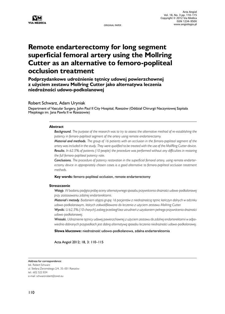 ORIGINAL PAPER Acta Angiol Vol. 18, No. 3 pp. 110–115 Copyright © 2012 Via Medica ISSN 1234–950X www.angiologia.pl Remote endarterectomy for long segment superficial femoral artery using the Mollring Cutter as an alternative to femoro-popliteal occlusion treatment Podprzydankowe udrożnienie tętnicy udowej powierzchownej z użyciem zestawu Mollring Cutter jako alternatywa leczenia niedrożności udowo-podkolanowej Robert Schwarz, Adam Uryniak Department of Vascular Surgery, John Paul II City Hospital, Rzeszów (Oddział Chirurgii Naczyniowej Szpitala Miejskiego im. Jana Pawła II w Rzeszowie) Abstract Background. The purpose of the research was to try to assess the alternative method of re-establishing the patency in femoro-popliteal segment of the artery using remote endarterectomy. Material and methods. The group of 16 patients with an occlusion in the femoro-popliteal segment of the artery was included in the study. They were qualified to be treated with the use of the MollRing Cutter device. Results. In 62.5% of patients (10 people) the procedure was performed without any difficulties in restoring the full femoro-popliteal patency rate. Conclusions. The procedure of patency restoration in the superficial femoral artery, using remote endarterectomy device in appropriately chosen cases is a good alternative to femoro-popliteal occlusion treatment methods. Key words: femoro-popliteal occlusion, remote endarterectomy Streszczenie Wstęp. W badaniu podjęto próbę oceny alternatywnego sposobu przywrócenia drożności udowo-podkolanowej przy zastosowaniu zdalnej endarterektomii. Materiał i metody. Badaniem objęto grupę 16 pacjentów z niedrożnością tętnic kończyn dolnych w odcinku udowo-podkolanowym, których zakwalifikowano do leczenia z użyciem zestawu Mollring Cutter. Wyniki. U 62,5% (10 chorych) zabieg przebiegł bez utrudnień z uzyskaniem pełnego przywrócenia drożności udowo-podkolanowej. Wnioski. Udrożnienie tętnicy udowej powierzchownej z użyciem zestawu do zdalnej endarterektomii w odpowiednio dobranych przypadkach jest dobrą alternatywą sposobu leczenia niedrożności udowo-podkolanowej. Słowa kluczowe: niedrożność udowo-podkolanowa, zdalna endarterektomia Acta Angiol 2012; 18, 3: 110–115 Address for correspondence: lek. Robert Schwarz ul. Stefana Żeromskiego 2/4, 35–001 Rzeszów tel.: 602 522 834 e-mail: [email protected] 110 Remote endarterectomy for long segment superficial femoral artery..., Robert Schwarz, Adam Uryniak Introduction Wstęp Atherosclerosis of lower limb arteries leading to treatment-necessitating ischaemia is in 70% cases most pronounced in femoropoliteal segment [1]. Indications for invasive treatment include lack of improvement following conservative therapy and elimination of risk factors, when signs of ischaemia are more pronounced and claudication distance markedly shortens, with resting pain and necrosis [2]. The choice of invasive procedure depends on the length and location of the occluded segment, according to recommendations of TASC [3]. In case of multiple occlusions or an obturated segment of more than 15 cm in length, there are several possible interventions to improve limb blood flow including endovascular procedures (balloon or laser angioplasty, cryoplasty, arterectomy, endovascular brachytherapy, implantation of stents coated with antimitotic agents), bypass grafting using patient’s own vascular segments or artificial materials, profundoplasty as well as hybrid techniques [4]. Subintimal endarterectomy using the Mollring Cutter device is an intervention rarely applied in femoral artery occlusion. The device was developed by the Vascular Architects consortium founded by Thomas J. Fogarty in 1997, and is used for less invasive, “remote” patency restoration procedures in superficial femoral artery [5]. History of endarterectomy dates back in mid-XX century, with the first ever thromboendarterectomy performed in 1946 by a Portuguese surgeon, Joao Cid dos Santos. Initial enthusiasm was short-lived as limitations and possible complications if the procedure became apparent. Endarterectomy procedures were therefore not performed until 1970s, despite promising initial results. Introduction of new techniques and improved treatment results led to rediscovery of endarterectomy procedures [6]. Prerequisites for a safe and successful patency restoration procedure are good blood inflow and outflow from the artery, and lack of calcification of atherosclerotic plaques. Patients are qualified for the procedure after diagnostic angiography. Extent of the occluded segment is marked using a skin-adhesive tape (Fig. 1). A small inguinal incision is made, and the initial segment of the superficial femoral artery is exposed. A 2 cm-long incision is made in the artery, and the occluding material is separated from the wall, from the incision site until the segment where the vessel is patent again. A blunt-spaded spatula-shaped device (Martin™ dissector, Fig. 2, item 1) is used. The procedure is performed under scopy, with Miażdżyca tętnic kończyn dolnych, powodująca niedokrwienie wymagające leczenia, u 70% chorych największe zaawansowanie osiąga w odcinku udowo-podkolanowym [1]. Przy braku poprawy, mimo stosowanego leczenia zachowawczego i wyeliminowania czynników ryzyka, gdy dochodzi do nasilenia objawów niedokrwienia ze znacznym skróceniem dystansu chromania, bólem spoczynkowym i martwicą, pojawiają się wskazania do leczenia inwazyjnego [2]. W zależności od długości i umiejscowienia niedrożnego odcinka stosuje się odpowiednią metodę leczenia zgodnie z zaleceniami Trans-Atlantic Inter-Society Consensus (TASC) [3]. W licznych zwężeniach lub niedrożności o łącznej długości > 15 cm istnieje kilka możliwości interwencji poprawiających ukrwienie kończyny. Począwszy od interwencji endowaskularnych (angioplastyka balonowa, laserowa, krioplastyka, aterektomia, brachyterapia śródnaczyniowa, wszcze