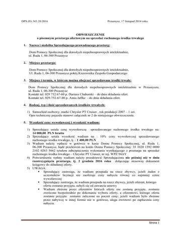 DPS.ZG.343.20.2016 Przasnysz, 17 listopad 2016 roku OBWIESZCZENIE o pisemnym przetargu ofertowym na sprzedaż ruchomego środka trwałego 1. Nazwa i siedziba Sprzedającego prowadzącego przetarg: Dom Pomocy Społecznej dla dorosłych niepełnosprawnych intelektualnie, ul. Ruda 1, 06-300 Przasnysz 2. Miejsce przetargu: Dom Pomocy Społecznej dla dorosłych niepełnosprawnych intelektualnie, Ul. Ruda 1, 06-300 Przasnysz pokój Kierownika Zespołu Gospodarczego 3. Miejsce i termin, w którym można obejrzeć sprzedawane środki trwałe: Dom Pomocy Społecznej dla dorosłych niepełnosprawnych intelektualnie w Przasnyszu, ul. Ruda 1, 06-300 Przasnysz Kontakt tel. 029 752 67-60 p. Dariusz Chaborski – do dnia składania ofert. Kontakt tel. 029-752-67-80 p. Anna Jaffke - do dnia składania ofert. 4. Rodzaj, typ i ilość sprzedawanych środków trwałych: 1) Samochód osobowy, marki Chrysler PT Cruiser , rok produkcji 2007 – 1 szt. Opis techniczny pojazdu stanowi załącznik nr 2 do niniejszego obwieszczenia. 5. Wysokość ceny wywoławczej i wysokość wadium: 1) Sprzedający ustala cenę wywoławczą sprzedawanego ruchomego środka trwałego na: 14 000,00 PLN brutto 2) Sprzedający ustala wysokość wadium na : 10% ceny wywoławczej sprzedawanego ruchomego środka trwałego, tj. : 1 400,00 PLN 3) Wadium należy wpłacić w gotówce w kasie Domu Pomocy Społecznej, ul. Ruda 1, 06-300 Przasnysz, bądź przelewem na konto Domu Pomocy Społecznej: 35 1020 1592 0000 2102 0263 5662 tytułem zabezpieczenia wykonania wynikającego z przetargu na sprzedaż ruchomego środka trwałego – Chrysler PT Cruiser, nr rej. WPZ 94AY 4) Potwierdzenie wpłaty wadium należy przedstawić Sprzedającemu nie później niż w dniu rozstrzygnięcia przetargu, tj. 2 grudnia 2016 roku dołączając stosowny dokument księgowy do składanej oferty. 5) UWAGA: Sprzedający zastrzega, że wadium przepada na rzecz zbywcy, jeżeli żaden z uczestników licytacji nie zaoferuje ceny nabycia równej co najmniej cenie wywoławczej Sprzedający zastrzega, że wadium przepada na rzecz zbywcy, jeżeli oferent, którego oferta zostanie przyjęta, uchyli się od zawarcia umowy Wadium złożone przez oferentów których oferty nie zostaną przyjęte, zostanie zwrócone bezpośrednio po dokonaniu wyboru oferty, a oferentowi, którego oferta zostanie przyjęta zostanie zaliczone na poczet ceny; jeżeli wadium było złożone przez nabywcę w innej formie niż w gotówce, ulega zwrotowi po zapłaceniu ceny nabycia. Strona 1 6. Miejsce, termin i tryb składania ofert: 1) Miejsce: Dom Pomocy Społecznej w Przasnyszu ul. Ruda 1, 06-300 Przasnysz, sekretariat 2) Termin: 2 grudnia 2016 roku do godz. 900 3) Tryb składania ofert: zgodnie z załączonym formularzem oferty według załącznika nr 1 do obwieszczenia. Ofertę należy włożyć do koperty i zamknąć kopertę w sposób uniemożliwiający odczytanie jej zawartości. Koperta powinna być oznaczona nazwą (firmą) i adresem Kupującego oraz powinna zostać zatytułowana: „Dom Pomocy Społecznej w Przasnyszu - Oferta kupna samochodu osobowego, marki Chrysler PT Cruiser”. 4) Okres wiązania ofert: 14 dni liczony od dnia następnego po otwarciu ofert. Jest to czas, w którym Kupujący będzie zobowiązany do podpisania umowy i uiszczenia opłaty za zakupiony ruchomy środek trwały. 5) Kryterium oceny ofert: W celu wyboru najkorzystniejszej oferty Sprzedający przyjął, iż kryterium wyboru oferty będzie najwyższa cena. 7. Miejsce i termin rozstrzygnięcia przetargu: 1) Dom Pomocy Społecznej dla dorosłych niepełnosprawnych intelektualnie, ul. Ruda 1, 06-300 Przasnysz pokój Kierownika Zespołu Gospodarczego 2) Termin: 2 grudnia 2016 roku, godzina 915 8. Dodatkowe informacje: 1) W sprawie niniejszego postępowania planuje się podpisanie standardowej umowy 2) Odbiór samochodu nastąpi po podpisaniu umowy i dokonaniu wpłaty na wskazane konto Domu Pomocy Społecznej dla dorosłych niepełnosprawnych intelektualnie, ul. Ruda 1, 06-300 Przasnysz 8. Informacje końcowe: Informacja o wyborze oferty najkorzystniejszej umieszczona zostanie na stronie internetowej: www.dpsprzasnysz.pl. Z poważaniem, Strona 2 Załącznik Nr 1 FORMULARZ OFERTY ( pieczęć wykonawcy ) Strona 1 z ogólnej liczby stron 1 FORMULARZ OFERTY złożony do postępowania na sprzedaż środka trwałego SPRZEDAJĄCY Powiat Przasnyski – Dom Pomocy Społecznej dla dorosłych niepełnosprawnych intelektualnie w Przasnyszu ul. Ruda 1 06-300 Przasnysz tel. 29-752-67-60 fax. 29-752-67-61 KUPUJĄCY Adres siedziby Adres do korespondencji Nawiązując do ogłoszenia o przetargu pisemnym na sprzedaż środka trwałego, niniejszym składam ofertę kupna za cenę : 1. Samochód osobowy marki Chrysler PT Cruiser wartość netto ……… PLN +podatek VAT 23 % w wysokości …………….. PLN wartość brutto ………………. PLN słownie brutto: ………………………… Oświadczam, że: 1. zdobyłem potrzebne informacje do sporządzenia oferty, 2. akceptuję zaproponowane warunki realizacji, odbioru i płatności, ….................................................dn. / /2016 roku Podpisano: ................................................................ (podpis osoby uprawnionej ) Strona 3 Załącznik nr 2 OPIS TECHNICZNY POJAZDU I. Samochód osobowy marki Chrysler PT Cruiser nr rejestracyjny pojazdu: WPZ 94AY rok produkcji: 2007 przebieg: 84796 mil = 136 465 km data pierwszej rejestracji pojazdu za granicą: 01.01.2007 data pierwszej rejestracji pojazdu w kraju: 30.10.2009 numer VIB: 3A4FY48B17T554543 typ paliwa: PB 95 oraz GAZ pojemność silnika: 2429 cm3 ładowność: 1 885 kg opony zimowe – 4 szt. w dobrym stanie samochód garażowany samochód ubezpieczony – OC dodatkowe wyposażenie: ABS, centralny zamek, elektryczne szyby, klimatyzacja manualna. Strona 4 UMOWA Nr ………………………KUPNA - SPRZEDAŻY (wzór) Zawarta w dniu …………………. 2016 roku, pomiędzy: POWIATEM PRZASNYSK