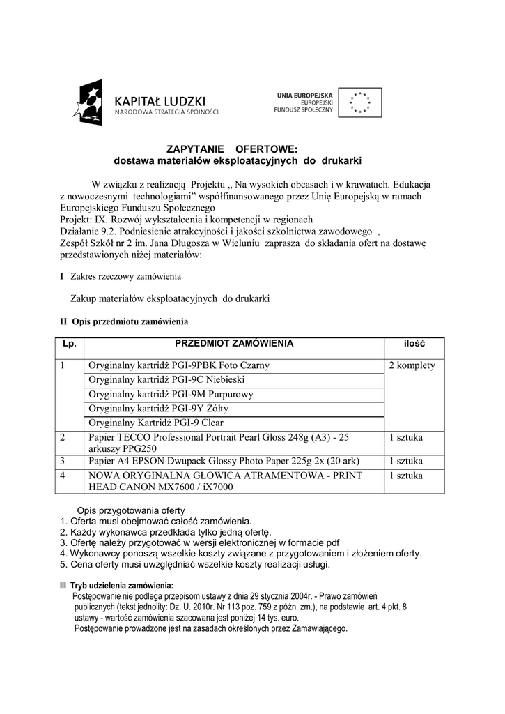 ZAPYTANIE OFERTOWE: dostawa materiałów eksploatacyjnych do drukarki W związku z realizacją Projektu „ Na wysokich obcasach i w krawatach. Edukacja z nowoczesnymi technologiami” współfinansowanego przez Unię Europejską w ramach Europejskiego Funduszu Społecznego Projekt: IX. Rozwój wykształcenia i kompetencji w regionach Działanie 9.2. Podniesienie atrakcyjności i jakości szkolnictwa zawodowego , Zespół Szkół nr 2 im. Jana Długosza w Wieluniu zaprasza do składania ofert na dostawę przedstawionych niżej materiałów: I Zakres rzeczowy zamówienia Zakup materiałów eksploatacyjnych do drukarki II Opis przedmiotu zamówienia Lp. 1 2 3 4 PRZEDMIOT ZAMÓWIENIA Oryginalny kartridż PGI-9PBK Foto Czarny Oryginalny kartridż PGI-9C Niebieski Oryginalny kartridż PGI-9M Purpurowy Oryginalny kartridż PGI-9Y Żółty Oryginalny Kartridż PGI-9 Clear Papier TECCO Professional Portrait Pearl Gloss 248g (A3) - 25 arkuszy PPG250 Papier A4 EPSON Dwupack Glossy Photo Paper 225g 2x (20 ark) NOWA ORYGINALNA GŁOWICA ATRAMENTOWA - PRINT HEAD CANON MX7600 / iX7000 ilość 2 komplety 1 sztuka 1 sztuka 1 sztuka Opis przygotowania oferty 1. Oferta musi obejmować całość zamówienia. 2. Każdy wykonawca przedkłada tylko jedną ofertę. 3. Ofertę należy przygotować w wersji elektronicznej w formacie pdf 4. Wykonawcy ponoszą wszelkie koszty związane z przygotowaniem i złożeniem oferty. 5. Cena oferty musi uwzględniać wszelkie koszty realizacji usługi. III Tryb udzielenia zamówienia: Postępowanie nie podlega przepisom ustawy z dnia 29 stycznia 2004r. - Prawo zamówień publicznych (tekst jednolity: Dz. U. 2010r. Nr 113 poz. 759 z późn. zm.), na podstawie art. 4 pkt. 8 ustawy - wartość zamówienia szacowana jest poniżej 14 tys. euro. Postępowanie prowadzone jest na zasadach określonych przez Zamawiającego. IV. Miejsce i termin składania ofert Ofertę należy przesłać mailem na adres [email protected] V. Kryteria oceny oferty Cena 100%. VI. Termin składania ofert do 27.09.2013r.. Dyrektor szkoły mgr Dariusz Kowalczyk Wieluń, 19.09.2013r. Projekt:” Na wysokich obcasach i w krawatach. Edukacja z nowoczesnymi technologiami” współfinansowany przez Unię Europejską w ramach środków Europejskiego Funduszu Społecznego, realizowany przez Powiat Wieluński / Zespół Szkół nr 2 im. Jana Długosza w Wieluniu FORMULARZ OFERTOWY: dostawa materiałów eksploatacyjnych do drukarki I DANE OFERENTA: 1. Nazwa firmy ………………………………. 2. Adres ………………………………………. 3. Tel./Fax. ……………………………..……. 4. E-mail ……………………………………… 5. Numer NIP ….……………………………… W odpowiedzi na zapytanie ofertowe z dnia 19.09.2013r., którego przedmiotem jest zakup materiałów eksploatacyjnych do drukarki do Projektu:” Na wysokich obcasach i w krawatach. Edukacja z nowoczesnymi technologiami” współfinansowanego przez Unię Europejską w ramach Europejskiego Funduszu Społecznego realizowanego przez Zespół Szkół nr 2 im. Jana Długosza w Wieluniu składam niniejszą ofertę: Lp. 1 PRZEDMIOT ZAMÓWIENIA ILOŚĆ Oryginalny kartridż PGI-9PBK Foto Czarny Oryginalny kartridż PGI-9C Niebieski Oryginalny kartridż PGI-9M Purpurowy Oryginalny kartridż PGI-9Y Żółty 2 komplety Cena netto Podatek VAT Cena brutto Oryginalny Kartridż PGI-9 Clear 2 3 4 Papier TECCO Professional Portrait 1 sztuka Pearl Gloss 248g (A3) - 25 arkuszy PPG250 Papier A4 EPSON Dwupack Glossy 1 sztuka Photo Paper 225g 2x (20 ark) NOWA ORYGINALNA GŁOWICA 1 sztuka ATRAMENTOWA - PRINT HEAD CANON MX7600 / iX7000 II Oświadczam ,że nie jestem powiązany z beneficjentem lub osobami upoważnionymi do zaciągania zobowiązań w imieniu beneficjenta lub osobami wykonującymi w imieniu beneficjenta czynności związanych z przygotowaniem i przeprowadzeniem procedury wyboru wykonawcy osobowo lub kapitałowo, w szczególności poprzez: - uczestnictwo w spółce jako wspólnik spółki cywilnej lub spółki osobowej; - posiadanie udziałów lub co najmniej 10% akcji; - pełnienie funkcji członka organu nadzorczego lub zarządzającego, prokurenta, pełnomocnika; - pozostawanie w związku małżeńskim, w stosunku pokrewieństwa lub powinowactwa w linii prostej, pokrewieństwa lub powinowactwa w linii bocznej do drugiego stopnia lub w stosunku przysposobienia, opieki lub kurateli. III Oświadczam, że zapoznałam/em się z Zapytaniem ofertowym na ww. usługę i nie wnoszę do niego żadnych zastrzeżeń oraz zdobyłam/em konieczne informacje do przygotowania oferty. W przypadku uznania mojej oferty za najkorzystniejszą zobowiązuję się do podpisania umowy w terminie i miejscu wskazanym przez Zamawiającego. ………………………..………..……………………… Osoba upoważniona do reprezentowania Oferenta