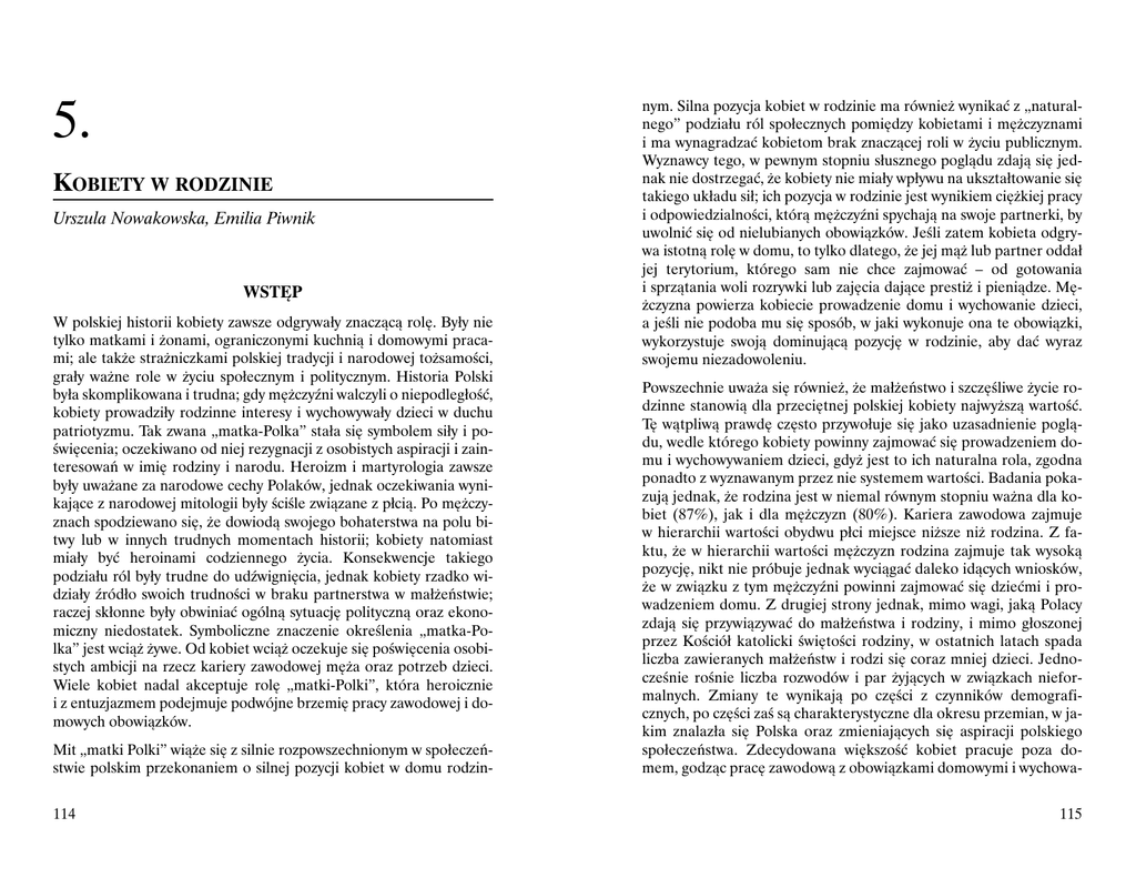 5. KOBIETY W RODZINIE Urszula Nowakowska, Emilia Piwnik WSTĘP W polskiej historii kobiety zawsze odgrywały znaczącą rolę. Były nie tylko matkami i żonami, ograniczonymi kuchnią i domowymi pracami; ale także strażniczkami polskiej tradycji i narodowej tożsamości, grały ważne role w życiu społecznym i politycznym. Historia Polski była skomplikowana i trudna; gdy mężczyźni walczyli o niepodległość, kobiety prowadziły rodzinne interesy i wychowywały dzieci w duchu patriotyzmu. Tak zwana „matka-Polka” stała się symbolem siły i poświęcenia; oczekiwano od niej rezygnacji z osobistych aspiracji i zainteresowań w imię rodziny i narodu. Heroizm i martyrologia zawsze były uważane za narodowe cechy Polaków, jednak oczekiwania wynikające z narodowej mitologii były ściśle związane z płcią. Po mężczyznach spodziewano się, że dowiodą swojego bohaterstwa na polu bitwy lub w innych trudnych momentach historii; kobiety natomiast miały być heroinami codziennego życia. Konsekwencje takiego podziału ról były trudne do udźwignięcia, jednak kobiety rzadko widziały źródło swoich trudności w braku partnerstwa w małżeństwie; raczej skłonne były obwiniać ogólną sytuację polityczną oraz ekonomiczny niedostatek. Symboliczne znaczenie określenia „matka-Polka” jest wciąż żywe. Od kobiet wciąż oczekuje się poświęcenia osobistych ambicji na rzecz kariery zawodowej męża oraz potrzeb dzieci. Wiele kobiet nadal akceptuje rolę „matki-Polki”, która heroicznie i z entuzjazmem podejmuje podwójne brzemię pracy zawodowej i domowych obowiązków. Mit „matki Polki” wiąże się z silnie rozpowszechnionym w społeczeństwie polskim przekonaniem o silnej pozycji kobiet w domu rodzin114 nym. Silna pozycja kobiet w rodzinie ma również wynikać z „naturalnego” podziału ról społecznych pomiędzy kobietami i mężczyznami i ma wynagradzać kobietom brak znaczącej roli w życiu publicznym. Wyznawcy tego, w pewnym stopniu słusznego poglądu zdają się jednak nie dostrzegać, że kobiety nie miały wpływu na ukształtowanie się takiego układu sił; ich pozycja w rodzinie jest wynikiem ciężkiej pracy i odpowiedzialności, którą mężczyźni spychają na swoje partnerki, by uwolnić się od nielubianych obowiązków. Jeśli zatem kobieta odgrywa istotną rolę w domu, to tylko dlatego, że jej mąż lub partner oddał jej terytorium, którego sam nie chce zajmować – od gotowania i sprzątania woli rozrywki lub zajęcia dające prestiż i pieniądze. Mężczyzna powierza kobiecie prowadzenie domu i wychowanie dzieci, a jeśli nie podoba mu się sposób, w jaki wykonuje ona te obowiązki, wykorzystuje swoją dominującą pozycję w rodzinie, aby dać wyraz swojemu niezadowoleniu. Powszechnie uważa się również, że małżeństwo i szczęśliwe życie rodzinne stanowią dla przeciętnej polskiej kobiety najwyższą wartość. Tę wątpliwą prawdę często przywołuje się jako uzasadnienie poglądu, wedle którego kobiety powinny zajmować się prowadzeniem domu i wychowywaniem dzieci, gdyż jest to ich naturalna rola, zgodna ponadto z wyznawanym przez nie systemem wartości. Badania pokazują jednak, że rodzina jest w niemal równym stopniu ważna dla kobiet (87%), jak i dla mężczyzn (80%). Kariera zawodowa zajmuje w hierarchii wartości obydwu płci miejsce niższe niż rodzina. Z faktu, że w hierarchii wartości mężczyzn rodzina zajmuje tak wysoką pozycję, nikt nie próbuje jednak wyciągać daleko idących wniosków, że w związku z tym mężczyźni powinni zajmować się dziećmi i prowadzeniem domu. Z drugiej strony jednak, mimo wagi, jaką Polacy zdają się przywiązywać do małżeństwa i rodziny, i mimo głoszonej przez Kościół katolicki świętości rodziny, w ostatnich latach spada liczba zawieranych małżeństw i rodzi się coraz mniej dzieci. Jednocześnie rośnie liczba rozwodów i par żyjących w związkach nieformalnych. Zmiany te wynikają po części z czynników demograficznych, po części zaś są charakterystyczne dla okresu przemian, w jakim znalazła się Polska oraz zmieniających się aspiracji polskiego społeczeństwa. Zdecydowana większość kobiet pracuje poza domem, godząc pracę zawodową z obowiązkami domowymi i wychowa115 niem dzieci. Wynikające stąd trudności, w połączeniu z nikłym wsparciem ze strony mężczyzn w tym zakresie należą z pewnością do ważnych czynników wpływających na decyzje kobiet w sprawie założenia rodziny. Coraz więcej kobiet deklaruje, że owszem, chciałoby mieć własne rodziny, ale nie kosztem pracy zawodowej. Stan cywilny kobiet Wyszczególnienie Panny Zamężne Wdowy Rozwiedzione W % ogółem Grupy wieku RODZINA W ŚWIETLE KONSTYTUCJI Rodzina, małżeństwo i macierzyństwo to pojęcia, które znajdujemy zarówno w starej, jak i nowej Konstytucji RP. Artykuł 79 starej konstytucji stanowił, że „państwo bierze w opiekę małżeństwo, macierzyństwo oraz rodzinę. Pod szczególną opieką rządu znajdują się rodziny wielodzietne”. Artykuł ten określał prawa i obowiązki alimentacyjne, ustanawiał równoprawność dzieci urodzonych w małżeństwie i poza nim, a także zawierał deklarację, że priorytetem polityki państwa jest dobro rodziny. Nowa konstytucja kilkakrotnie odnosi się do spraw związanych z rodziną: W art.18 przepisów ogólnych czytamy: „Małżeństwo, jako związek kobiety i mężczyzny, rodzina, macierzyństwo i rodzicielstwo znajdują się pod ochroną i opieką Rzeczpospolitej Polskiej”. W pierwotnej wersji artykuł ten nie zawierał definicji małżeństwa, jednak w wyniku presji Kościoła katolickiego, w obawie przed próbami legalizacji związków homoseksualnych, przepis uzupełniono o definicję małżeństwa jako związku heteroseksualnego. Centrum Praw Kobiet zabiegało o zastąpienie słowa „macierzyństwo” słowem „rodzicielstwo”, które bardziej odpowiada idei równości.