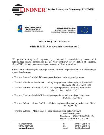 Zakład Przemysłu Drzewnego LINDNER Oferta firmy ZPD Lindner – z dnia 11.01.2016 na nowe linie wzornicze szt. 7 W oparciu o nowy wzór użytkowy tj. ,, trumnę do samodzielnego montażu” i udzielonego prawa ochronnego na ten wzór użytkowy nr W.121558 pt. Trumna, firma ZPD Lindner przedstawia nową ofertę na 7 linii wzorniczych. Oferta linii wzorniczych dotyczy modeli trumien odpowiednich dla określonego rynku docelowego: - Trumna Szwedzka Model C – oklejona fornirem naturalnym dębowym - Trumna Niemiecka Model OK1 – oklejona papierem dekoracyjnym: Eiche Hell Geplankt 1324/06J ACS 1610 - Trumna Norweska Model NOR 2 - oklejona papierem dekoracyjnym Jesion Ribeira 16-11040-112 3D - Trumna Czeska – Model CK1 – oklejona papierem dekoracyjnym Nussbaum 2926/02H ACS1613 - Trumna Polska – Model SAR 1 – oklejona papierem dekoracyjnym Riviera Eiche 16-10200-106 - Trumna Włoska – Model SAR 1 –oklejona papierem dekoracyjnym dwukolorowym : Nussbaum 2926/02H ACS1613, Buche 2395/31 Y ACS1610, ul Gnieźnieńska 67 62-100 Wągrowiec www.zpdlindner.pl tel. fax. e-mail: 0048 67 268 55 46 0048 67 268 55 45 [email protected] Zakład Przemysłu Drzewnego LINDNER - Trumna Francusa – Model FR 1 oklejona papierem dekoracyjnym San Diego Butternut 16-20200-102 Oferowanych 7 linii wzorniczych dotyczy : trumny do samodzielnego montażu, oklejonych papierem dekoracyjnym lub fornirem naturalnym, sprzedawanych w elementach i zapakowanych w karton. Zastosowanie nowych sposobów montażu elementów trumny według wzoru użytkowego pozwala skrócić czas montażu części górnej i dolnej do ok 2 min. bez użycia kleju i specjalistycznych narzędzi. Zalety nowych linii wzorniczych: - spełnienie wysokich wymagań estetycznych (okleinowanie papierem dekoracyjnym i fornirem naturalnym) - łatwa demontowalność trumny (wymiana uszkodzonych elementów) - ograniczenie powierzchni magazynowej (trumna magazynowana w elementach o mniejszej kubaturze) -tańszy transport i łatwiejsza logistyka (dwukrotnie większa ilość trumien w przestrzeni załadowczej tira) - aspekt ekologiczny – maksymalne wykorzystanie materiałów i dążenie do maksymalnego wykorzystania odpadów, wyeliminowanie kleju z procesu montażu. Oferowany w elementach produkt będzie zapakowany w pojedyncze kartony, zabezpieczony przed uszkodzeniami z dołączoną szczegółową instrukcją montażu. Na specjalne życzenie klienta możemy doposażyć wyrób w nóżki i rączki lub przygotować nawiercenia pod ich montaż. Indywidualne zapytania ofertowe realizuje dział sprzedaży Oferta obowiązuje od 15.01.2016 do odwołania Z pozdrowieniami ul Gnieźnieńska 67 62-100 Wągrowiec www.zpdlindner.pl tel. fax. e-mail: 0048 67 268 55 46 0048 67 268 55 45 [email protected]