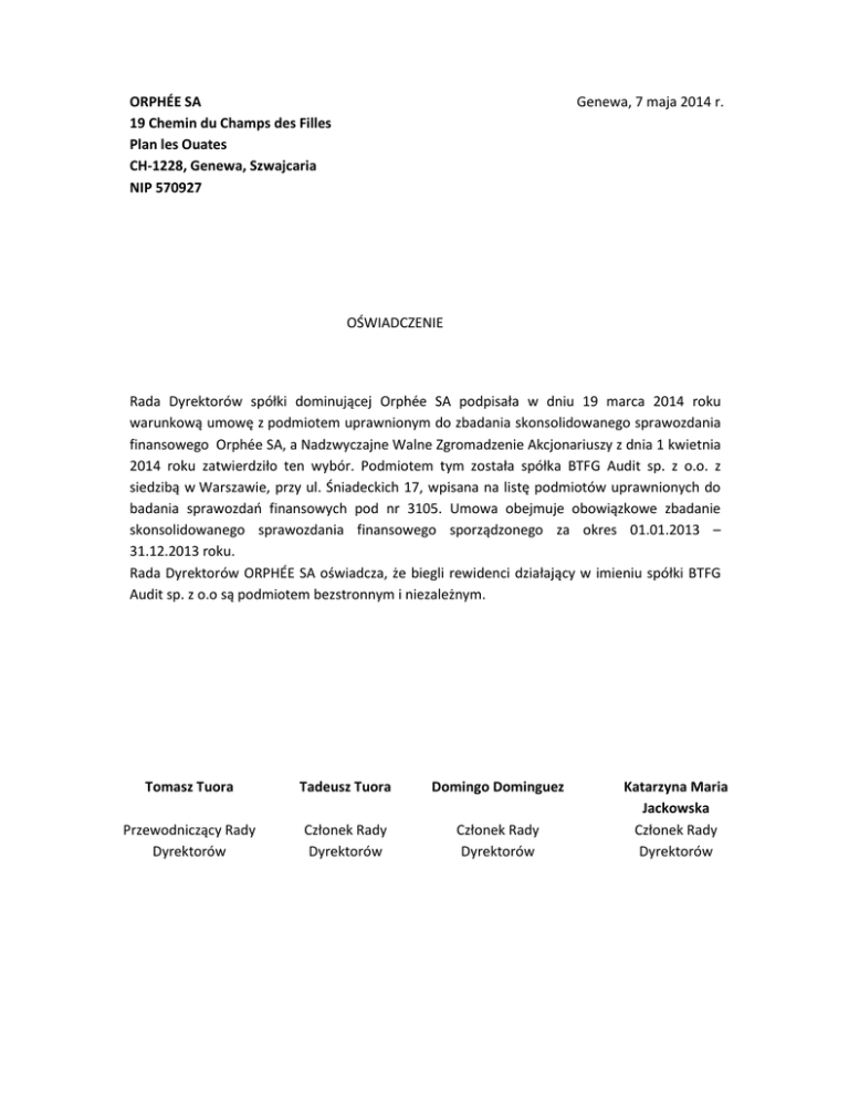 ORPHÉE SA 19 Chemin du Champs des Filles Plan les Ouates CH-1228, Genewa, Szwajcaria NIP 570927 Genewa, 7 maja 2014 r. OŚWIADCZENIE Rada Dyrektorów spółki dominującej Orphée SA podpisała w dniu 19 marca 2014 roku warunkową umowę z podmiotem uprawnionym do zbadania skonsolidowanego sprawozdania finansowego Orphée SA, a Nadzwyczajne Walne Zgromadzenie Akcjonariuszy z dnia 1 kwietnia 2014 roku zatwierdziło ten wybór. Podmiotem tym została spółka BTFG Audit sp. z o.o. z siedzibą w Warszawie, przy ul. Śniadeckich 17, wpisana na listę podmiotów uprawnionych do badania sprawozdań finansowych pod nr 3105. Umowa obejmuje obowiązkowe zbadanie skonsolidowanego sprawozdania finansowego sporządzonego za okres 01.01.2013 – 31.12.2013 roku. Rada Dyrektorów ORPHÉE SA oświadcza, że biegli rewidenci działający w imieniu spółki BTFG Audit sp. z o.o są podmiotem bezstronnym i niezależnym. Tomasz Tuora Tadeusz Tuora Domingo Dominguez Przewodniczący Rady Dyrektorów Członek Rady Dyrektorów Członek Rady Dyrektorów Katarzyna Maria Jackowska Członek Rady Dyrektorów