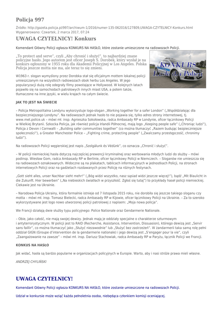 Policja 997 Źródło: http://gazeta.policja.pl/997/archiwum-1/2016/numer-135-062016/127809,UWAGA-CZYTELNICY-Konkurs.html Wygenerowano: Czwartek, 2 marca 2017, 07:24 UWAGA CZYTELNICY! Konkurs Komendant Główny Policji ogłasza KONKURS NA HASŁO, które zostanie umieszczone na radiowozach Policji. „To protect and serve”, czyli „Aby chronić i służyć”, to najbardziej znane policyjne hasło. Jego autorem jest oficer Joseph S. Dorobek, który wysłał je na konkurs ogłoszony w 1955 roku dla Akademii Policyjnej w Los Angeles. Polska Policja jeszcze motta nie ma, ale teraz to się zmieni. W1963 r. slogan wymyślony przez Dorobka stał się oficjalnym mottem lokalnej policji umieszczanym na wszystkich radiowozach obok herbu Los Angeles. W jego popularyzacji dużą rolę odegrały filmy powstające w Hollywood. W kolejnych latach pojawiło się na samochodach patrolowych innych miast USA, a potem także, tłumaczone na inne języki, w wielu krajach na całym świecie. JAK TO JEST NA ŚWIECIE – Policja Metropolitalna Londynu wykorzystuje logo-slogan „Working together for a safer London” („Współdziałając dla bezpieczniejszego Londynu”. Na radiowozach jednak hasło to nie pojawia się, tylko adres strony internetowej, tj. www.met.police.uk – mówi mł. insp. Agnieszka Sokołowska, radca Ambasady RP w Londynie, oficer łącznikowy Policji w Wielkiej Brytanii. Szkocka Policja, jak również policja Irlandii Północnej, mają logo „Keeping people safe” („Chroniąc ludzi”), Policja z Devon i Cornwalli – „Building safer communities together” (co można tłumaczyć „Razem budując bezpieczniejsze społeczności”), a Greater Manchester Police – „Fighting crime, protecting people” („Zwalczamy przestępczość, chronimy ludzi”). Na radiowozach Policji węgierskiej jest napis „Szolgálunk és Védünk”, co oznacza „Chronić i służyć”. – W policji niemieckiej hasła dotyczą najczęściej prewencji kryminalnej oraz werbowania młodych ludzi do służby – mówi podinsp. Wiesław Gom, radca Ambasady RP w Berlinie, oficer łącznikowy Policji w Niemczech. – Sloganów nie umieszcza się na radiowozach oznakowanych. Widoczne są na plakatach, tablicach informacyjnych w jednostkach Policji, na stronach internetowych Policji oraz na gadżetach rozdawanych przez Policję na różnych festynach. „Gott sieht alles, unser Nachbar sieht mehr!” („Bóg widzi wszystko, nasz sąsiad widzi jeszcze więcej!”), bądź „Mit Blaulicht in die Zukunft. Hier bewerben” („Na niebieskich światłach w przyszłość. Zgłoś się tutaj”) to przykłady haseł policji niemieckiej. Ciekawie jest na Ukrainie. – Narodowa Policja Ukrainy, która formalnie istnieje od 7 listopada 2015 roku, nie dorobiła się jeszcze takiego sloganu czy motta – mówi mł. insp. Tomasz Bielecki, radca Ambasady RP w Kijowie, oficer łącznikowy Policji na Ukrainie. – Za to szeroko wykorzystywane jest logo nowo utworzonej policji patrolowej z napisem: „Moja nowa policja”. We Francji działają dwie służby typu policyjnego: Police Nationale oraz Gendarmerie Nationale. – Obie, jako całość, nie mają swojej dewizy. Jednak mają je oddziały specjalne o charakterze szturmowym i antyterrorystycznym. W policji jest to RAID (Recherche, Assistance, Intervention, Dissuasion), którego dewizą jest „Servir sans faillir”, co można tłumaczyć jako „Służyć niezawodnie” lub „Służyć bez zastrzeżeń”. W żandarmerii taka samą rolę pełni oddział GIGN (Groupe d’intervention de la gendarmerie nationale) i jego dewizą jest „S’engager pour la vie”, czyli „Zaangażowanie na zawsze” – mówi mł. insp. Dariusz Stachowiak, radca Ambasady RP w Paryżu, łącznik Policji we Francji. KONKUS NA HASŁO Jak widać, hasła są bardzo popularne w organizacjach policyjnych w Europie. Warto, aby i nasi stróże prawa mieli własne. ANDRZEJ CHYLIŃSKI UWAGA CZYTELNICY! Komendant Główny Policji ogłasza KONKURS NA HASŁO, które zostanie umieszczone na radiowozach Policji. Udział w konkursie może wziąć każda pełnoletnia osoba, niebędąca członkiem komisji oceniającej. Na Państwa propozycje czekamy pod adresem e-mail: [email protected] oraz listownie (adres w regulaminie) do 30 czerwca 2016 r. Zapraszamy do wzięcia udziału w naszym konkursie! Autor zwycięskiego hasła otrzyma roczną prenumeratę miesięcznika „Policja 997” oraz nagrodę niespodziankę. Biuro Komunikacji Społecznej KGP Szczegółowe warunki konkursu znajdziecie Państwo w Regulaminie konkursu, zamieszczonym na stronach: gazeta.policja.pl, isp.policja.pl oraz policja.pl. W związku z ogromnym zainteresowaniem „Konkursem na hasło”, do 28 czerwca wpłynęło prawie cztery tysiące propozycji, zmuszeni jesteśmy przesunąć termin rozstrzygnięcia konkursu. Komisja konkursowa po przeanalizowaniu wszystkich nadesłanych propozycji ogłosi zwycięzcę 15 września 2016 r. Załączniki do strony Hasło dla Policji 49.13 KB Regulamin "Hasło dla Policji" 36.5 KB Aneks do Regulaminu "Hasło dla Policji" 43 KB Ocena: 0/5 (0)