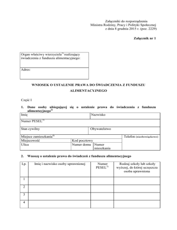 Załączniki do rozporządzenia Ministra Rodziny, Pracy i Polityki Społecznej z dnia 8 grudnia 2015 r. (poz. 2229) Załącznik nr 1 Organ właściwy wierzyciela1) realizujący świadczenia z funduszu alimentacyjnego: Adres: WNIOSEK O USTALENIE PRAWA DO ŚWIADCZENIA Z FUNDUSZU ALIMENTACYJNEGO Część I Dane osoby ubiegającej się o ustalenie prawa do świadczenia z funduszu alimentayjnego2) Imię Nazwisko 1. Numer PESEL3) Stan cywilny Miejsce zamieszkania4) Miejscowość Ulica 2. Lp. 1 2 3 4 Obywatelstwo Telefon (nieobowiązkowo) Kod pocztowy Numer domu Numer mieszkania Wnoszę o ustalenie prawa do świadczeń z funduszu alimentacyjnego Imię i nazwisko osoby uprawnionej Numer PESEL3) Rodzaj szkoły lub szkoły wyŜszej, do której uczęszcza osoba uprawniona 3. Dane członków rodziny, w tym dzieci do ukończenia 25 lat, jeŜeli pozostają na utrzymaniu rodziców, a takŜe dziecka, które ukończyło 25. rok Ŝycia, otrzymującego świadczenia z funduszu alimentacyjnego lub legitymującego się orzeczeniem o znacznym stopniu niepełnosprawności, jeŜeli w związku z tą niepełnosprawnością przysługuje świadczenie pielęgnacyjne lub specjalny zasiłek opiekuńczy, albo zasiłek dla opiekuna, a takŜe osoby uprawnionej; do członków rodziny nie zalicza się: dziecka pozostającego pod opieką opiekuna prawnego, dziecka pozostającego w związku małŜeńskim, rodzica osoby uprawnionej zobowiązanego tytułem wykonawczym pochodzącym lub zatwierdzonym przez sąd do alimentów na jej rzecz. W skład rodziny wchodzą: 1. ................................................................................................................................................ imię i nazwisko data urodzenia stopień pokrewieństwa ................................................................................................................................................ PESEL3) 2. urząd skarbowy ................................................................................................................................................ imię i nazwisko data urodzenia stopień pokrewieństwa ................................................................................................................................................ PESEL3) 3. urząd skarbowy ................................................................................................................................................ imię i nazwisko data urodzenia stopień pokrewieństwa ................................................................................................................................................ PESEL3) 4. urząd skarbowy ................................................................................................................................................ imię i nazwisko data urodzenia stopień pokrewieństwa ................................................................................................................................................ PESEL3) 5. urząd skarbowy ................................................................................................................................................ imię i nazwisko data urodzenia stopień pokrewieństwa ................................................................................................................................................ PESEL3) urząd skarbowy 4. Organ, do którego są opłacane składki na ubezpieczenie zdrowotne, o których mowa w art. 3 pkt 1 lit. a ustawy z dnia 28 listopada 2003 r. o świadczeniach rodzinnych (Dz. U. z 2015 r. poz. 114, z późn. zm.) w zw. z art. 2 pkt 4 ustawy z dnia 7 września 2007 r. o pomocy osobom uprawnionym do alimentów (Dz. U. z 2015 r. poz. 859, z późn. zm.), zwanej dalej „ustawą” (zakreślić odpowiedni kwadrat) □ Zakład Ubezpieczeń Społecznych □ Kasa Rolniczego Ubezpieczenia Społecznego □ Wojskowe Biuro Emerytalne □ Zakład Emerytalno-Rentowy Ministerstwa Spraw Wewnętrznych □ Biuro Emerytalne SłuŜby Więziennej □ Jednostka organizacyjna wymiaru sprawiedliwości …………………………………………. …………………………………………………………………………………………………... (nazwa i adres właściwej jednostki) □ inne…………………………………………………………………………………………… ………………………………………………………………………………………………….. (nazwa i adres właściwej jednostki) 5. Inne dane 5.1. Łączna kwota alimentów świadczonych na rzecz innych osób wyniosła w roku ...........*) ........... zł ..... gr. 5.2. W roku kalendarzowym poprzedzającym okres świadczeniowy lub po tym roku nastąpiła/nie nastąpiła **) utrata dochodu***). 5.3. W roku kalendarzowym poprzedzającym okres świadczeniowy lub po tym roku nastąpiło/nie nastąpiło **) uzyskanie dochodu****). *) Wpisać rok, z którego dochód stanowi podstawę ustalenia dochodu rodziny. Niepotrzebne skreślić. ***) Utrata dochodu, zgodnie z art. 2 pkt 17 ustawy, oznacza utratę dochodu spowodowaną: − uzyskaniem prawa do urlopu wychowawczego, − utratą prawa do zasiłku lub stypendium dla bezrobotnych, − utratą zatrudnienia lub innej pracy zarobkowej, − utratą zasiłku przedemerytalnego lub świadczenia przedemerytalnego, nauczycielskiego świadczenia kompensacyjnego, a takŜe emerytury lub renty, renty rodzinnej lub renty socjalnej, − wyrejestrowaniem pozarolniczej działalności gospodarczej lub zawieszeniem jej wykonywania w rozumieniu art. 14a ust. 1d ustawy z dnia 2 lipca 2004 r. o swobodzie działalności gospodarczej (Dz. U. z 2015 r. poz. 584, z późn. zm.), − utratą zasądzonych świadczeń alimentacyjnych w związku ze śmiercią osoby zobowiązanej do tych świadczeń, − utratą zasiłku chorobowego, świadczenia rehabilitacyjnego lub zasiłku macierzyńskiego, przysługujących po