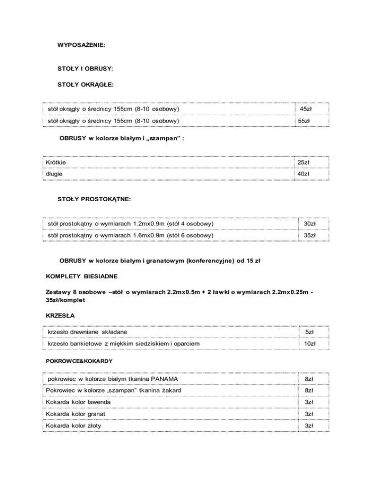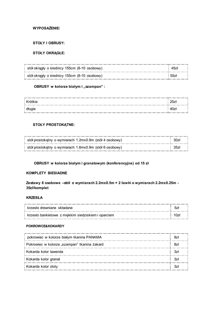 WYPOSAŻENIE: STOŁY I OBRUSY: STOŁY OKRĄGŁE: stół okrągły o średnicy 155cm (8-10 osobowy) stół okrągły o średnicy 155cm (8-10 osobowy) 45zł 55zł OBRUSY w kolorze białym i „szampan” : Krótkie 25zł długie 40zł STOŁY PROSTOKĄTNE: stół prostokątny o wymiarach 1.2mx0.9m (stół 4 osobowy) 30zł stół prostokątny o wymiarach 1.6mx0.9m (stół 6 osobowy) 35zł OBRUSY w kolorze białym i granatowym (konferencyjne) od 15 zł KOMPLETY BIESIADNE Zestawy 8 osobowe –stół o wymiarach 2.2mx0.5m + 2 ław ki o wymiarach 2.2mx0.25m 35zł/komplet KRZESŁA krzesło drewniane składane 5zł krzesło bankietowe z miękkim siedziskiem i oparciem 10zł POKROWCE&KOKARDY pokrowiec w kolorze białym tkanina PANAMA 8zł Pokrowiec w kolorze „szampan” tkanina żakard 8zł Kokarda kolor lawenda 3zł Kokarda kolor granat 3zł Kokarda kolor złoty 3zł BIAŁE SZKŁO kieliszek do szampana 0.5zł kieliszek do w ódki 0.3zł kieliszek do w ina czerwonego 0.5zł kieliszek do w ina białego 0.5zł long drink 0.5zł literatka 0.3zł szklanka 0.5zł pokale 0.5zł w hisky 0.5zł dzbanki do soków 1.5zł miski 3zł patera na ciasto 5zł ZASTAWA STOŁOWA firmy CHODZIEŻ linia IWONA. talerz płaski od 0.5 zł talerz głęboki 0.7zł bulionówka +podstawek 0.7zł+0.5zł filiżanka + podstawek 0.5zł+0.5zł serwetniki 0.7zł półmiski od 2zł sosjerki 1,2 zł salaterki okrągłe od 0.6zł salaterki kwadratowe od 0.6zł maselniczka 1zł waza + nabierka 4zł + 1zł cukiernica 1 zł pucharki do lodów 1 zł dzbanki do kawy/herbaty 2zł/3zł wazon od 3 zł koszyki na pieczywo 1zł miski metalowe (stal nierdzewna) 1 zł tace kelnerskie okrągłe o średnicy 5 zł SZTUĆCE firmy ODISO linia GRANADA nóż stołowy 0.25zł widelec stołowy 0.25zł łyżka stołowa 0.25zł łyżeczka 0.25zł widelczyk do ciasta 0.25zł SPRZĘT GASTRONOMICZNY Frytkownica 8l 40zł Grill gazowy +butla gazowa 150zł+ 50zł Kociołek 10l 30zł Warnik 10l. 30zł Warnik 30l 50 zł Bemar 150 zł SKIRTINGI I SERWETY: Falbany w kolorze białym/szampan/granat 4zł/mb Serwety bankietowe w kolorze białym/ błękitnym 2zł/sztuka PARASOLE GRZEWCZE : Parasole gazowe o niespotykanej stylistyce RATTAN. Moc 5-14kW 150zł+50zł butla Parasole gazowe o niespotykanej stylistyce INOX ze stolikiem. Moc 5-14kW 150zł+50zł butla
